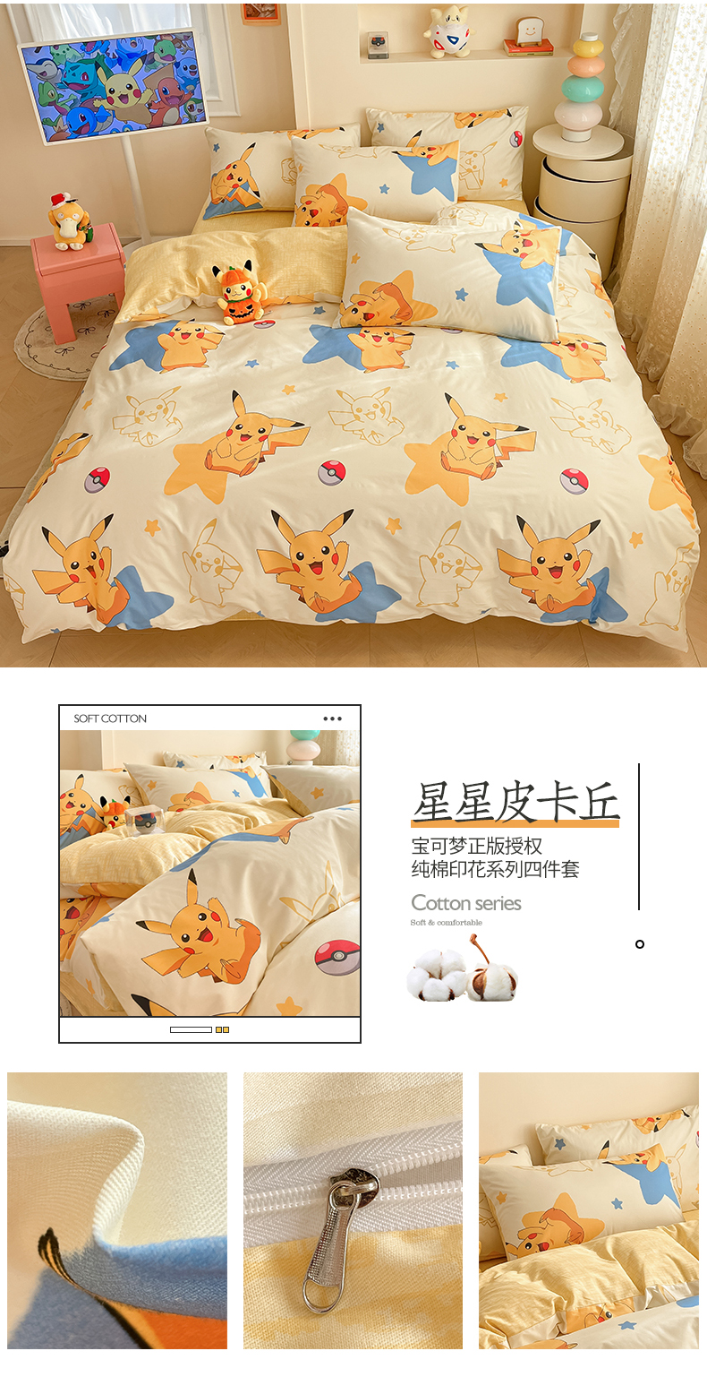 当前位置: 91家纺网 > 商品网购 > 床品套件 > 四件套 > 全棉普通四件套 > 金爱家 2025新款宝可梦正版授权皮卡丘纯棉印花系列四件套 棉宝可梦-星星皮卡丘