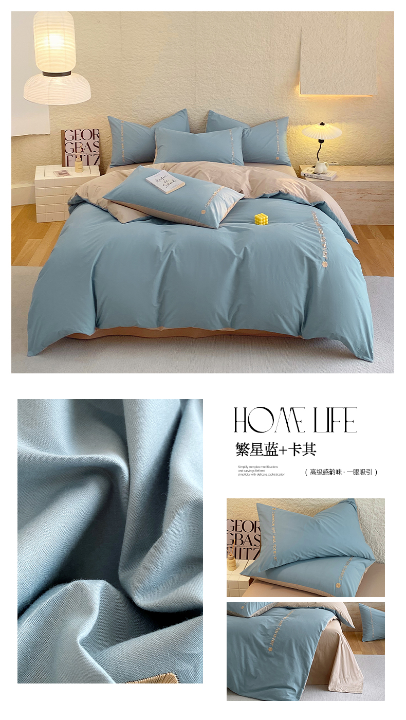 当前位置: 91家纺网 > 商品网购 > 床品套件 > 四件套 > 水洗棉四件套 > 拼社家纺 2025新款母婴及全棉水洗棉刺绣四件套纯棉床上用品 繁星蓝+卡其