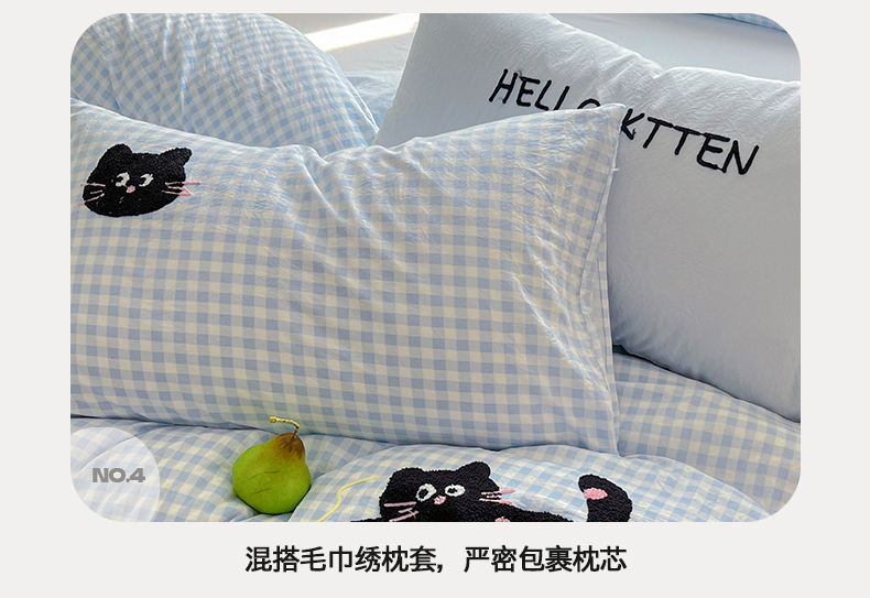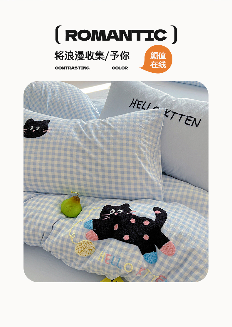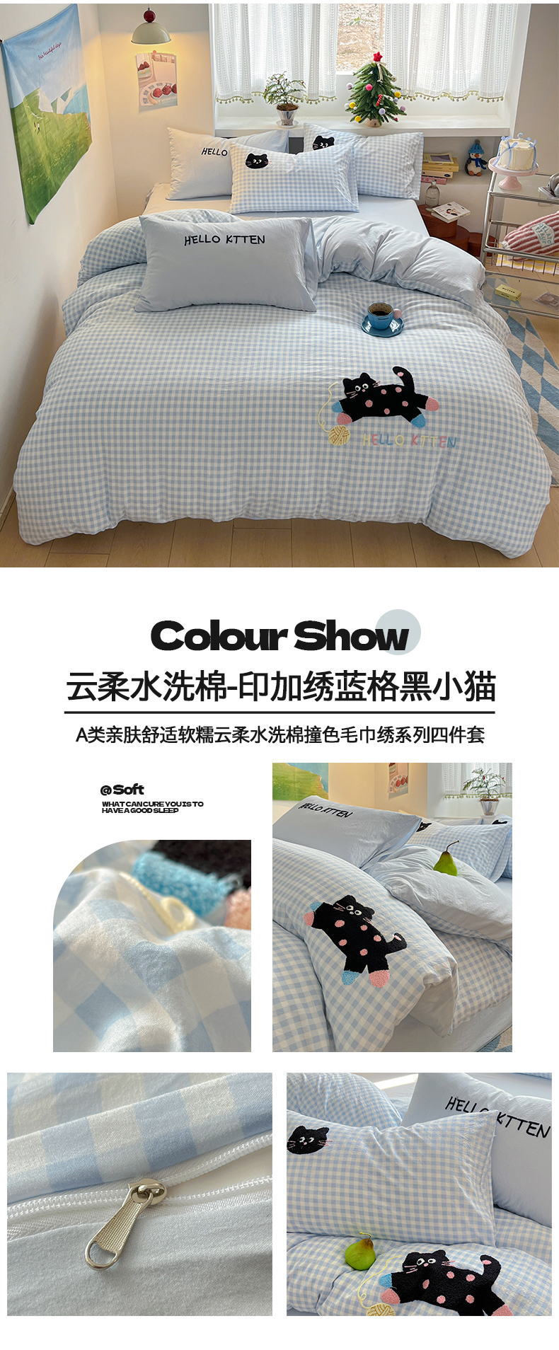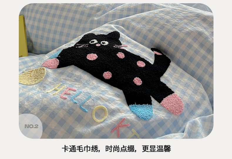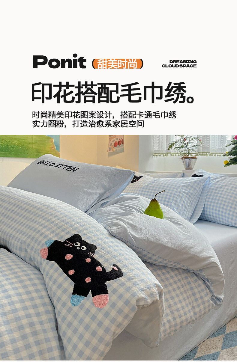 当前位置: 91家纺网 > 商品网购 > 床品套件 > 四件套 > 水洗棉四件套 > 桃心家居 2025新款A类亲肤舒适软糯云柔水洗棉印加绣卡通毛巾绣水洗棉系列 云柔水洗棉-印加绣蓝格黑小猫