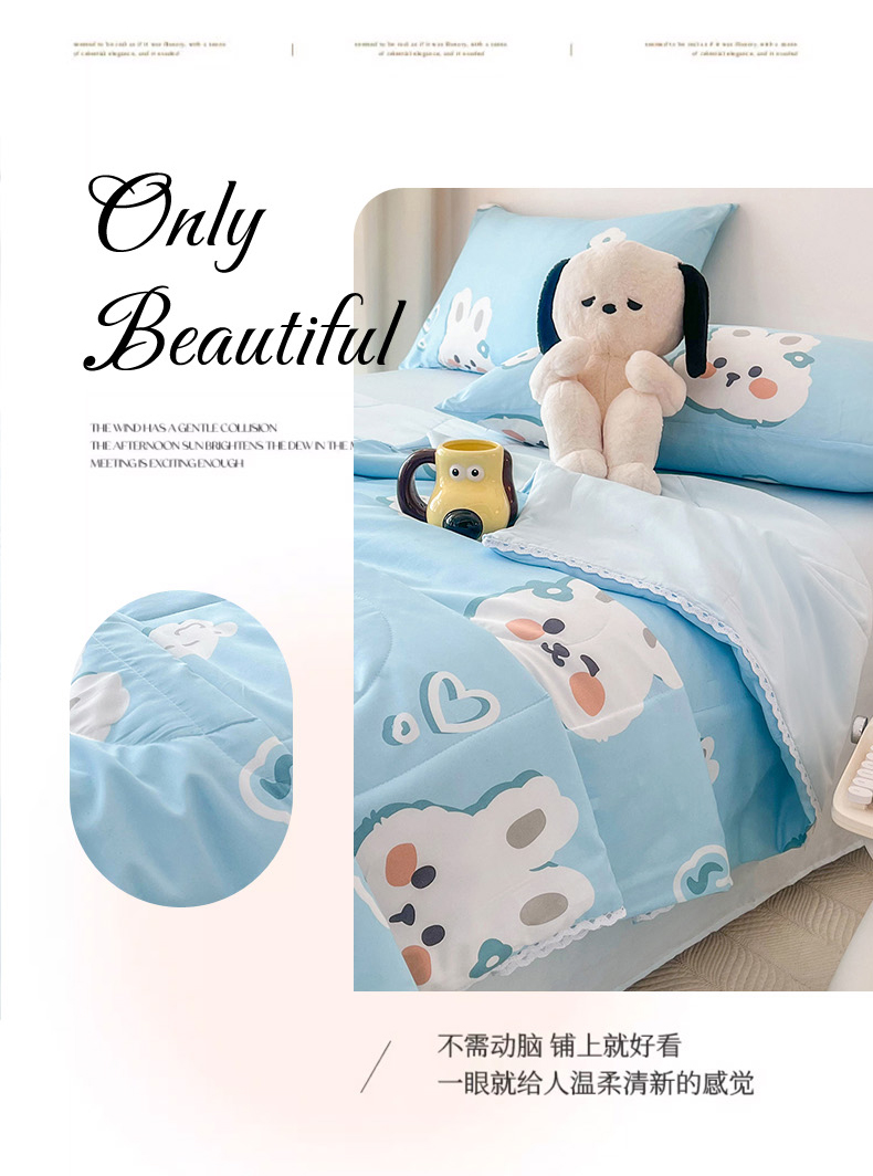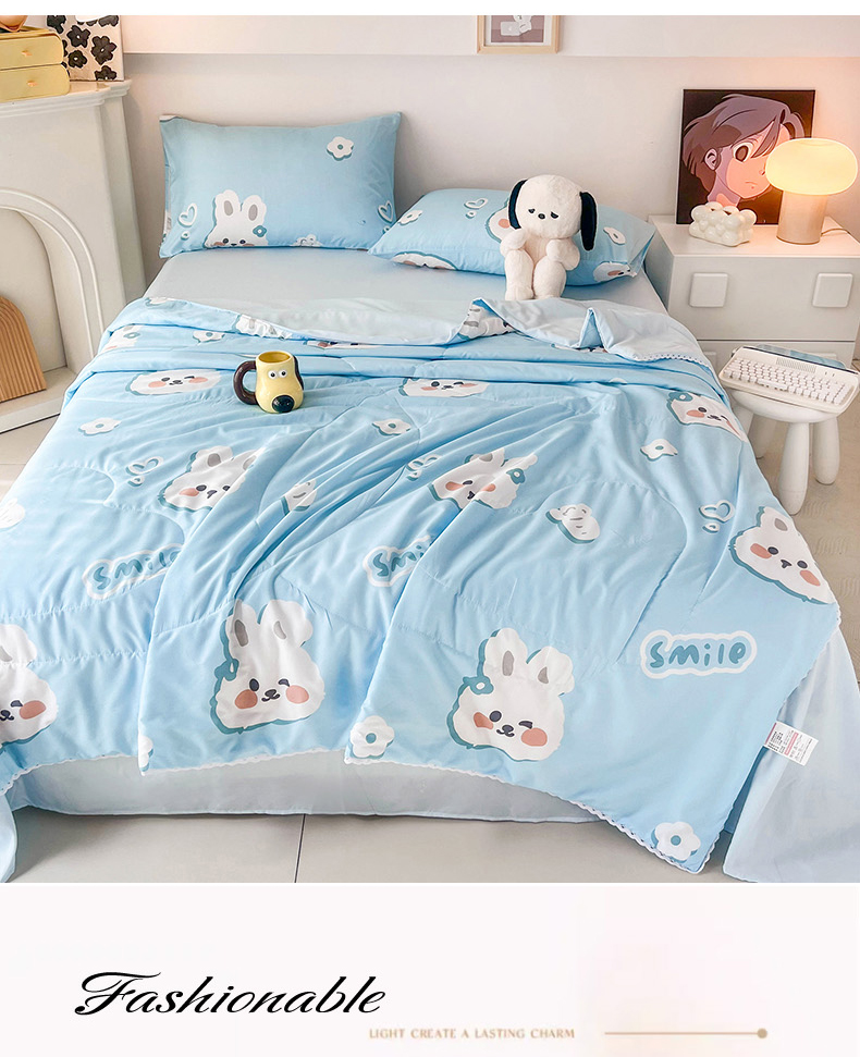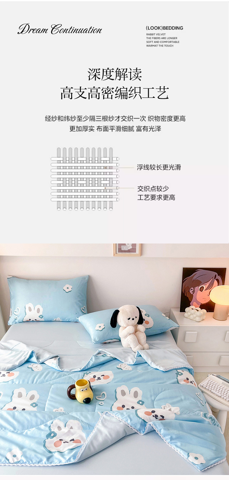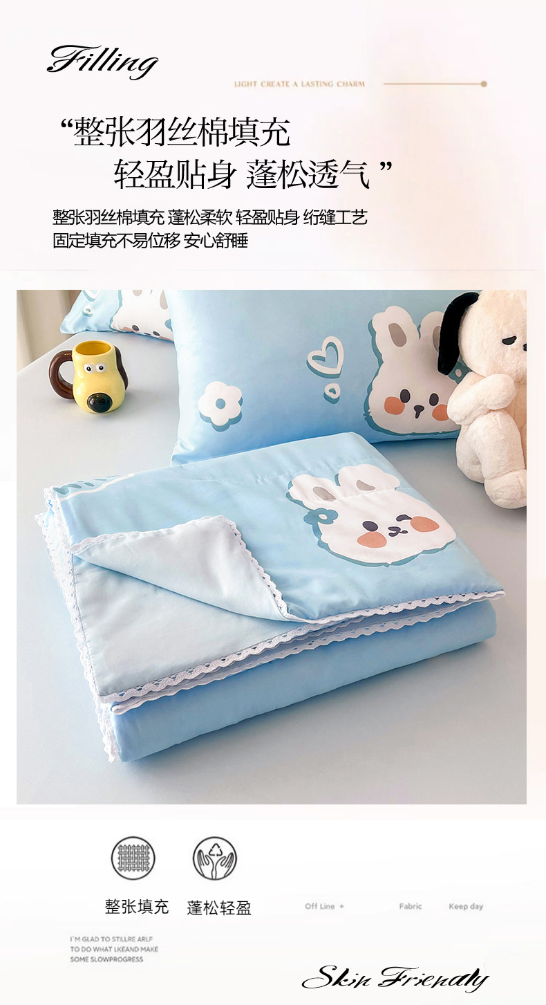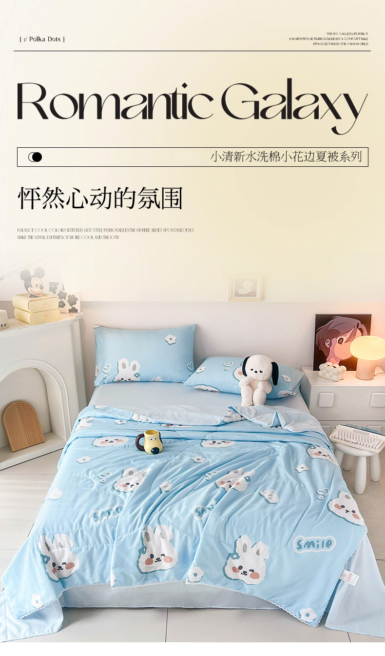 倾慕家纺 2025新款水洗棉小花边夏被 蓝白小兔