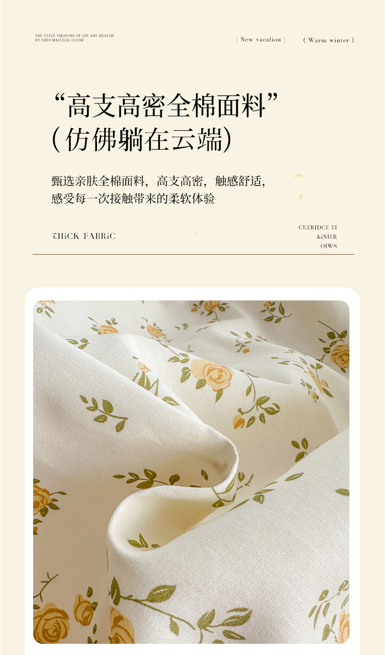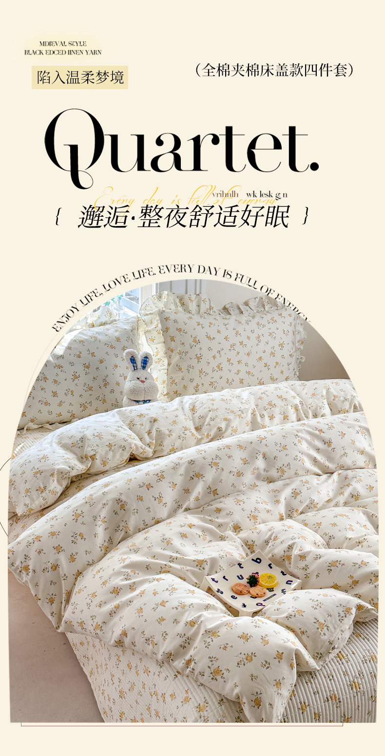• 91家纺网 家纺一手货源 找家纺 嘉汀兰家居 2025新款13372单面全棉高温砂洗绗缝单床盖,床盖四件套(同款花边被套) 小黄花