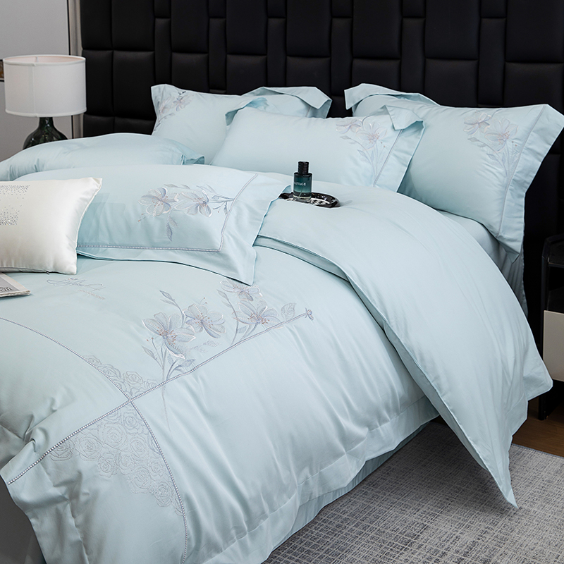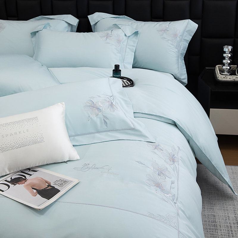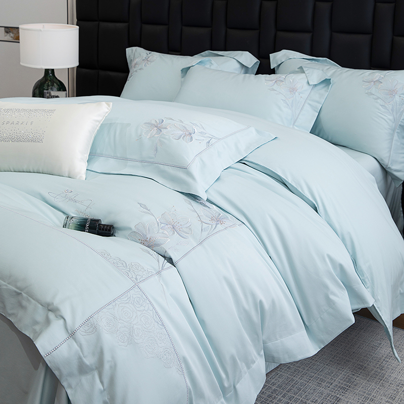 张公子婚庆馆 2025新款120支新疆长绒棉居家绣花工艺系列四件套—花雾 云水蓝