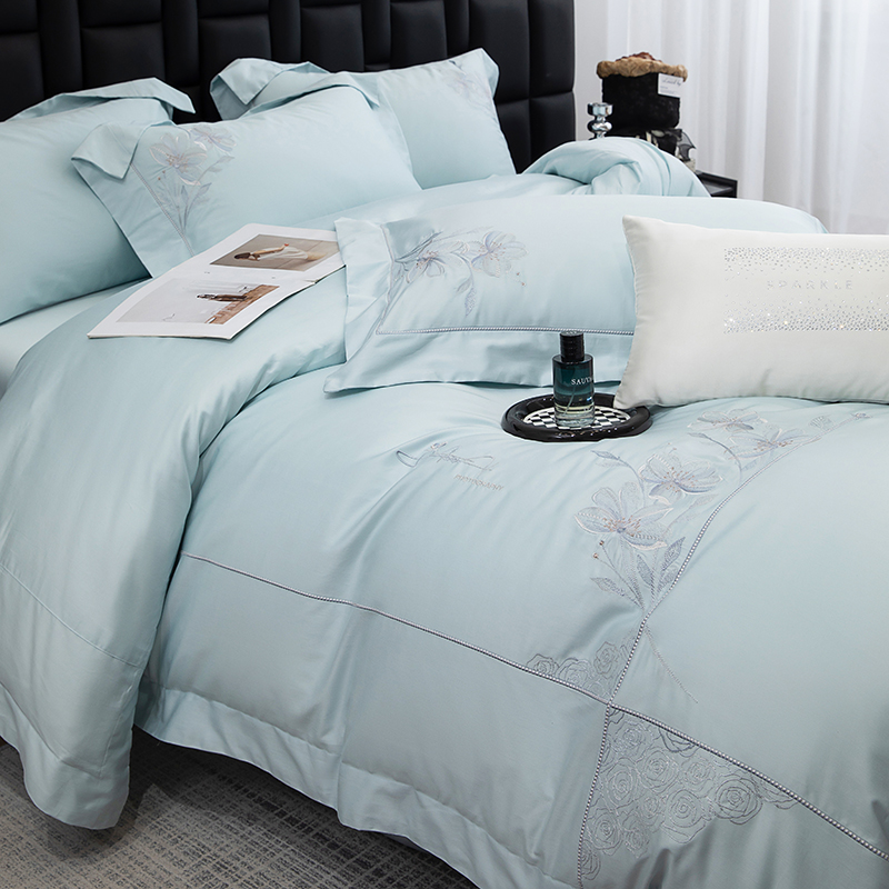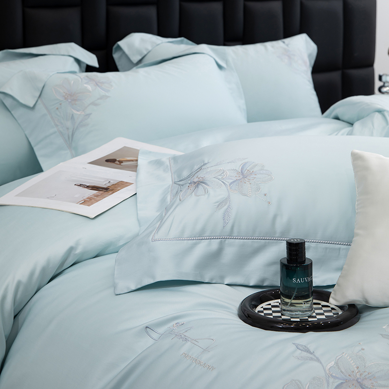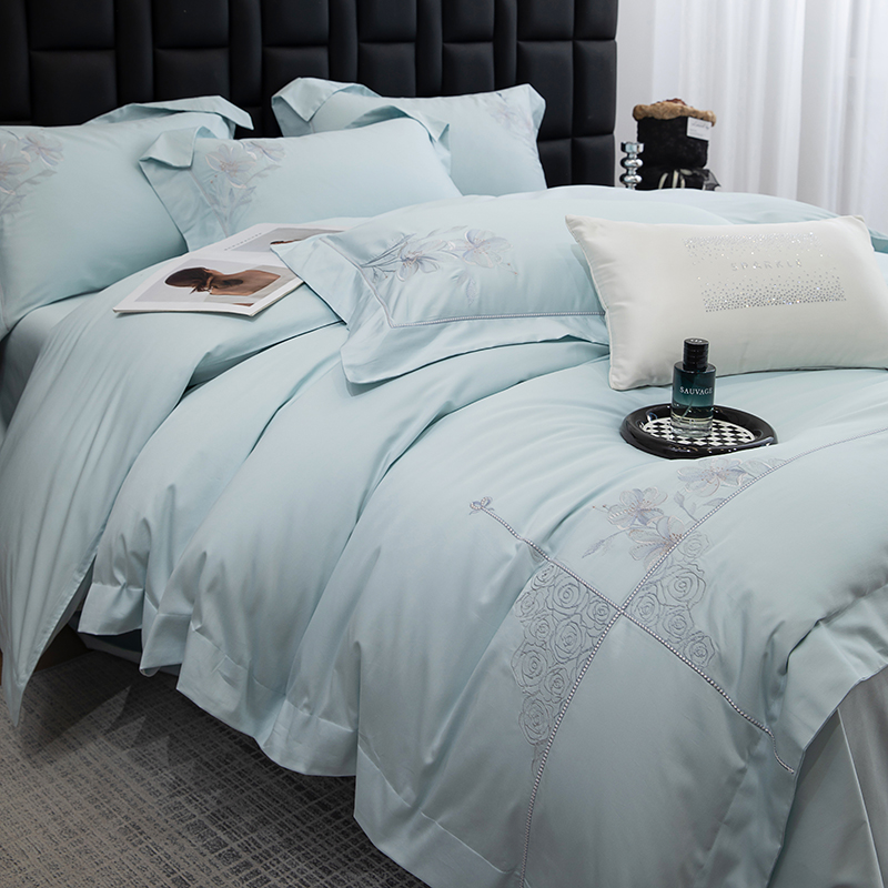 商品名称:张公子婚庆馆 2025新款120支新疆长绒棉居家绣花工艺系列四件套—花雾 云水蓝