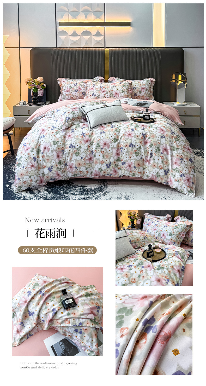 红日子纺织品 2025新款60s长绒棉纯棉贡缎印花四件套 春暖-红