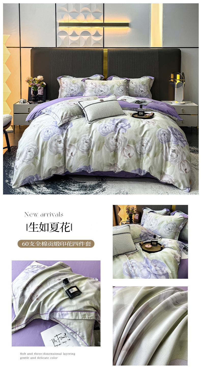 (总)红日子纺织品 2025新款全棉纯棉数码印花四件套,花暖容颜-绿,波斯记忆-蓝,茶山露水-桔,淡雅清风-蓝,芳若-绿,花情共舞-米,焕彩玫瑰-黄,美尼尔-粉,莫兰迪-紫,莫妮花园-粉,浓情蜜意-粉,翩翩花语-绿,秋日盛情-黄,日落花雨-灰,如若梦境-绿,诗丹娜-深蓝,邂逅柔情-蓝,秀雅佳人-灰