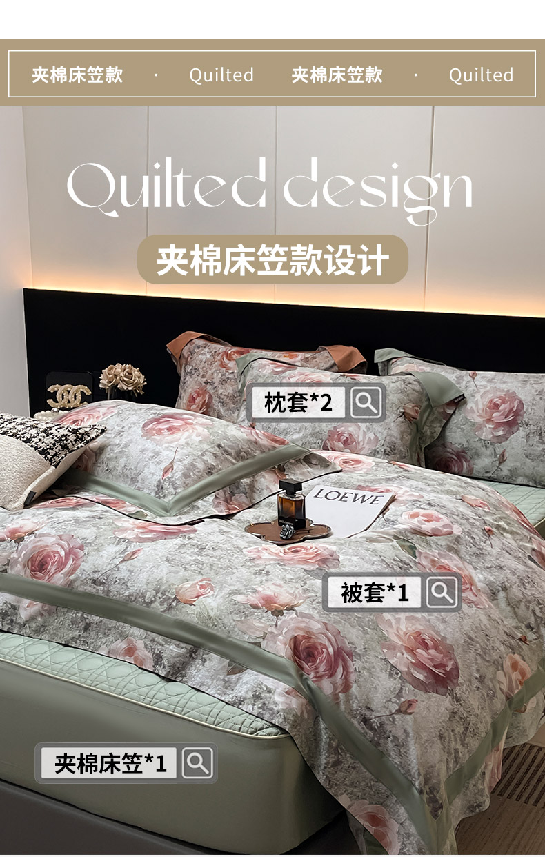 2025新款A类100支天丝棉夹棉床盖床笠四件套全棉床单加厚高端数码印花 梦寐繁花-绿