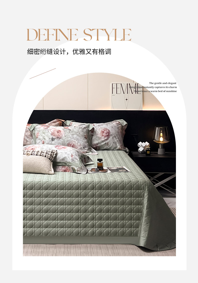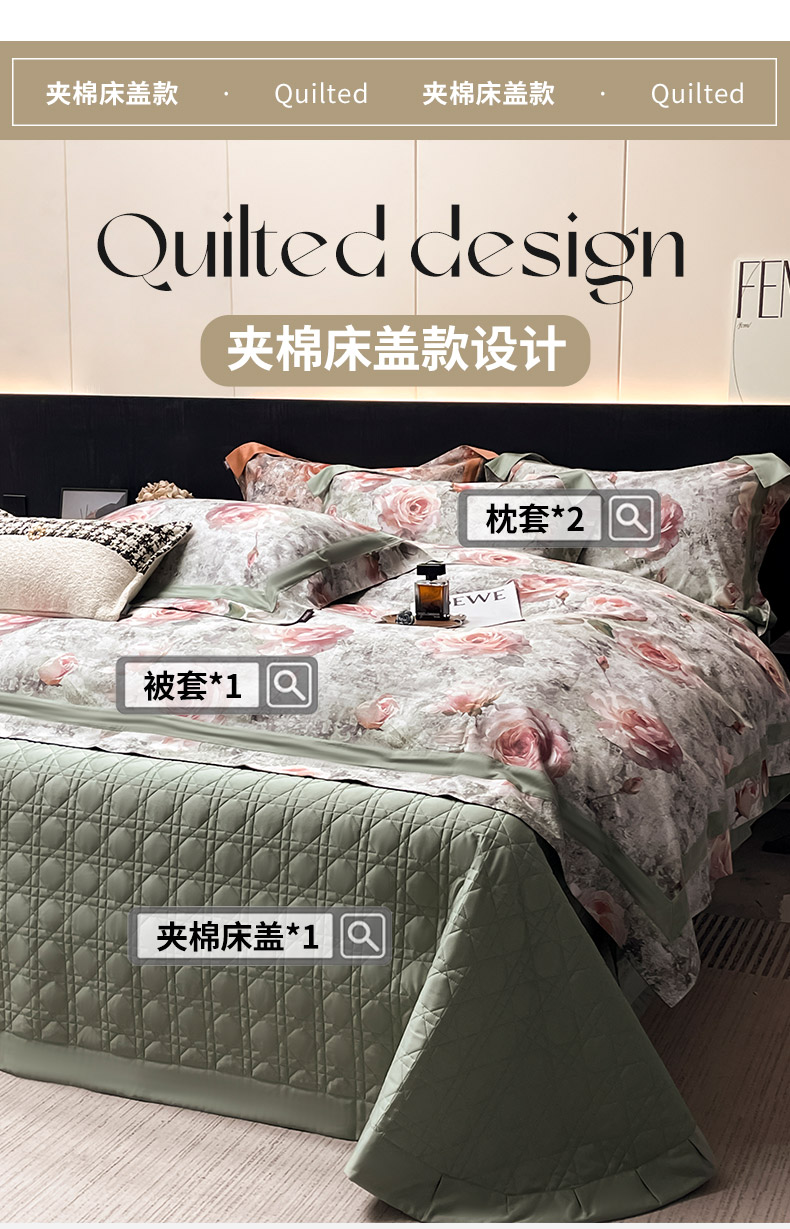 • 91家纺网 家纺一手货源 找家纺  2025新款A类100支天丝棉夹棉床盖床笠四件套全棉床单加厚高端数码印花 梦寐繁花-绿