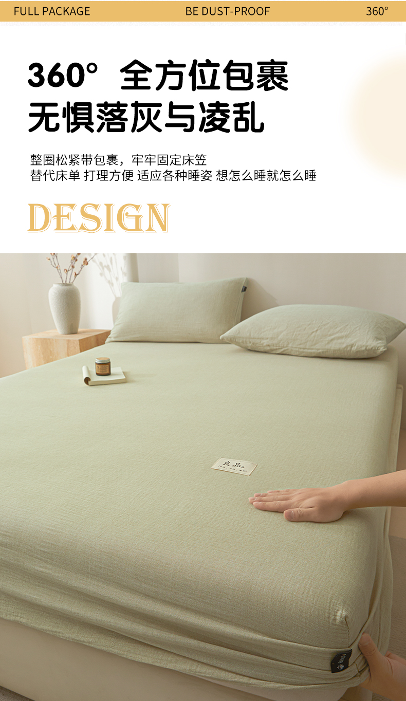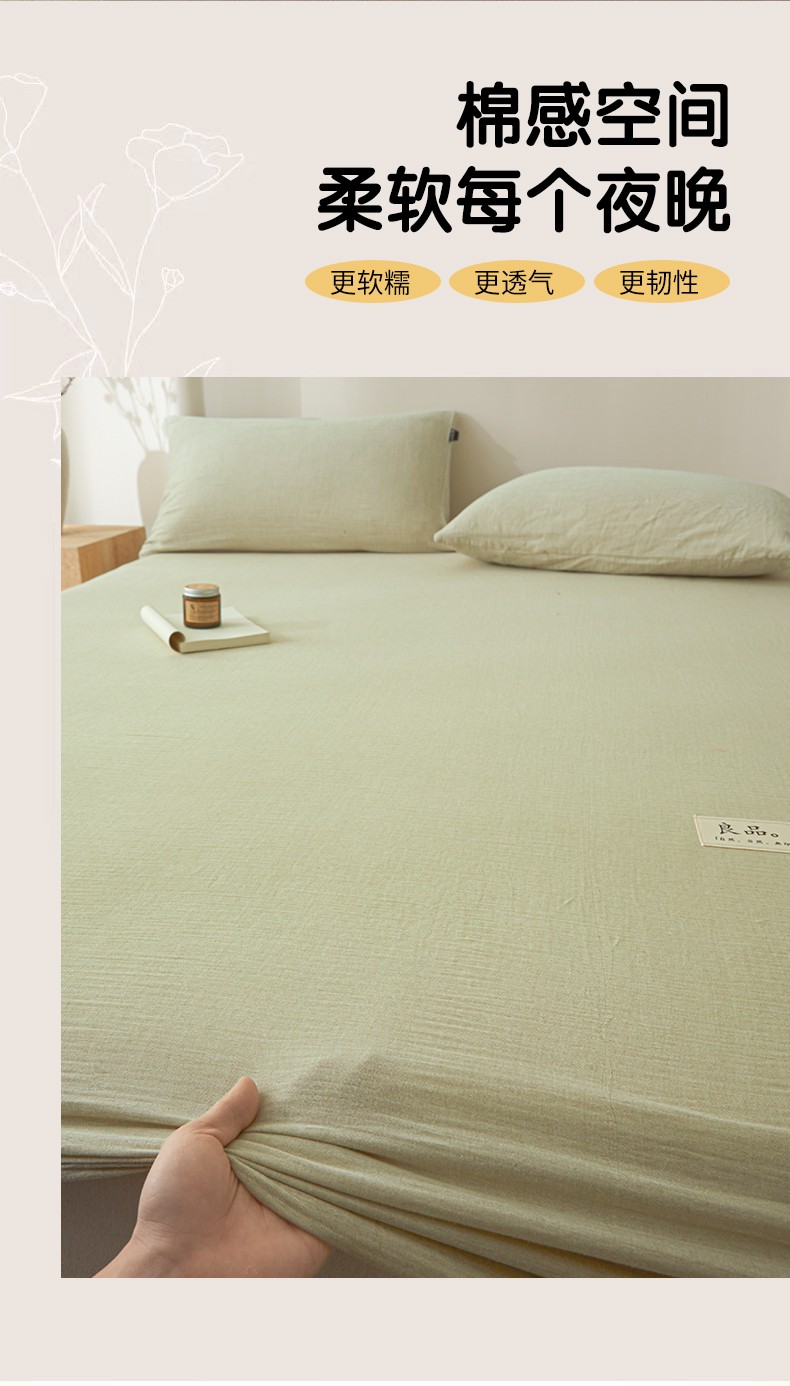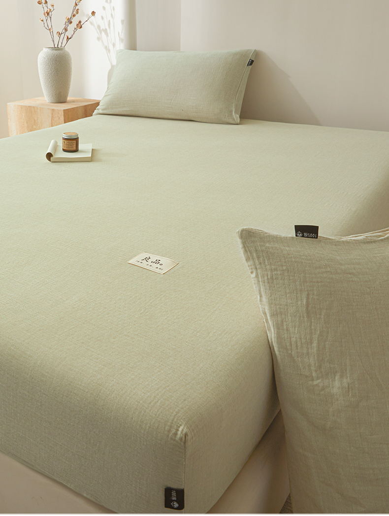 • 91家纺网 家纺一手货源 找家纺 鑫钰 2025新款纯色系列全棉双层皱皱纱床单-床笠 淡雅绿-床笠