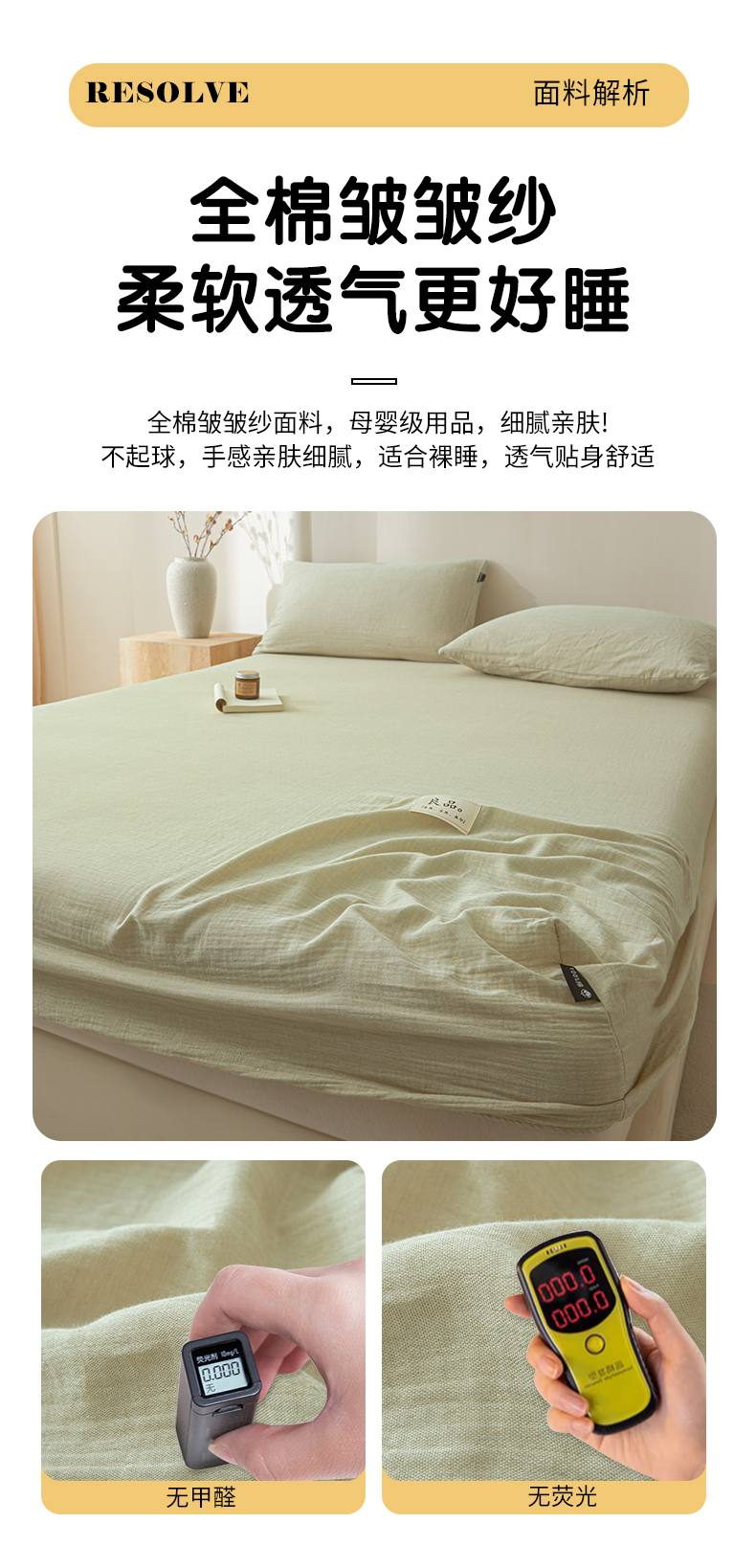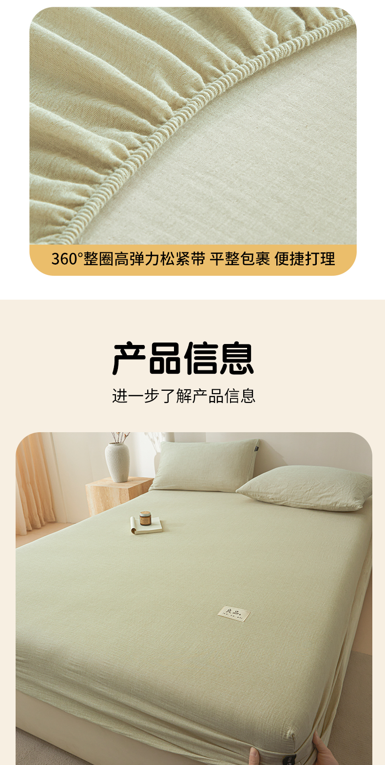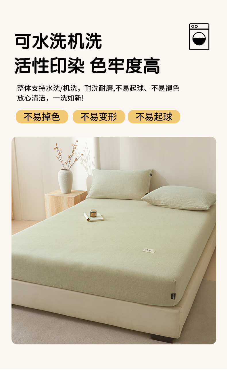 • 91家纺网 家纺一手货源 找家纺 鑫钰 2025新款纯色系列全棉双层皱皱纱床单-床笠 淡雅绿-床笠