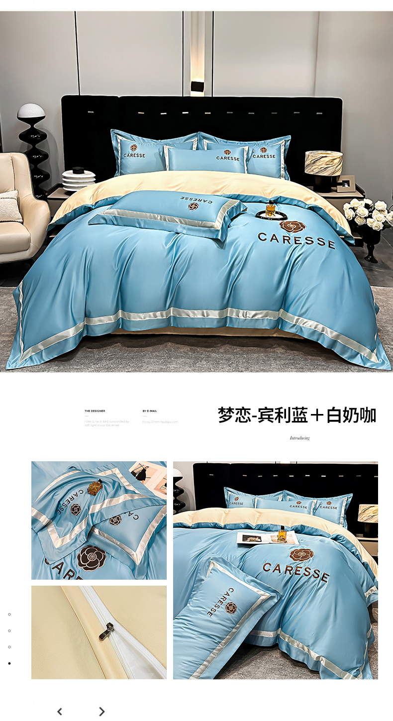当前位置: 91家纺网 > 商品网购 > 床品套件 > 四件套 > 莱赛尔四件套 > 妮恒美家纺 2025新款A版水洗真丝天丝B版纯棉刺绣绣花四件套全棉被套床单床笠款四件套 梦恋-宾利蓝+白奶咖