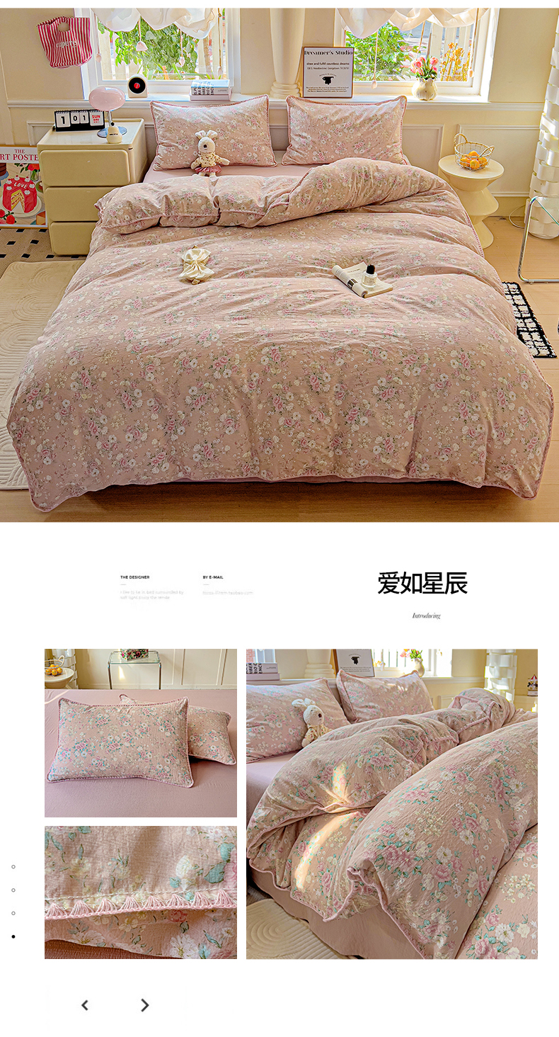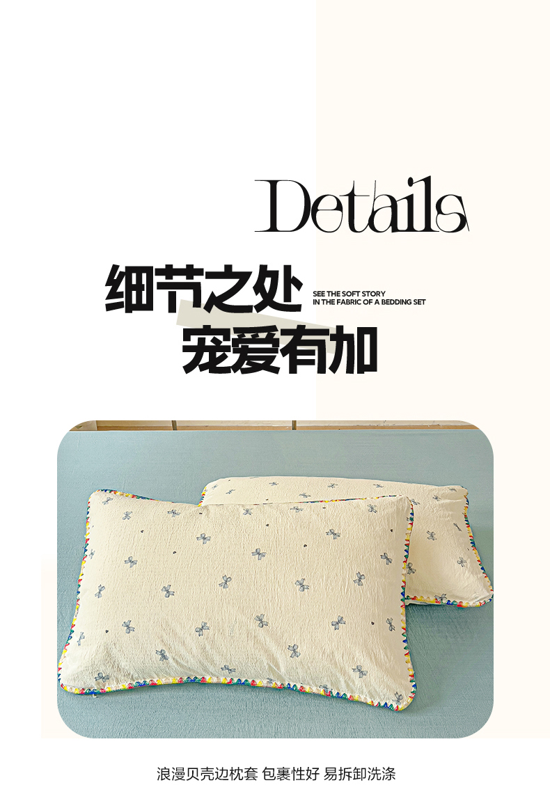 当前位置: 91家纺网 > 商品网购 > 床品套件 > 四件套 > 双层纱四件套 > Mata蔓塔家 2025春夏新款云感针织双层纱彩色贝壳边四件套 有草莓的地方