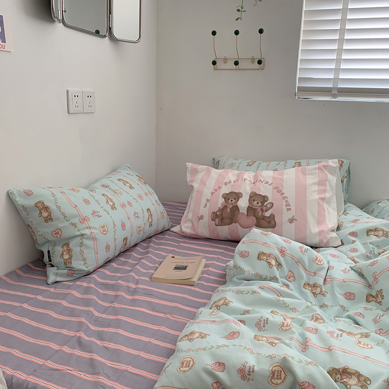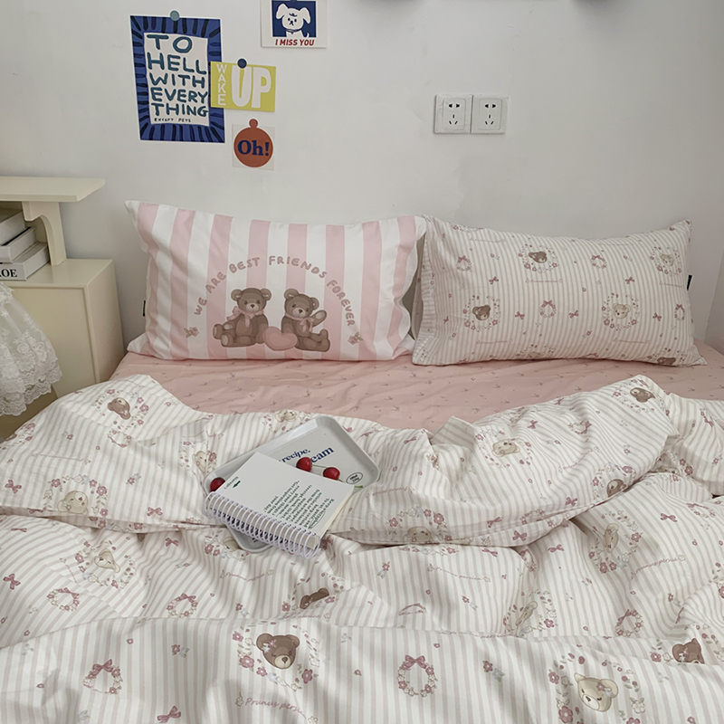 商品名称:柚可家居 2024新款40支纯棉活性印花四件套-小熊系列-实拍图第二组 小熊花花 蝴蝶结粉