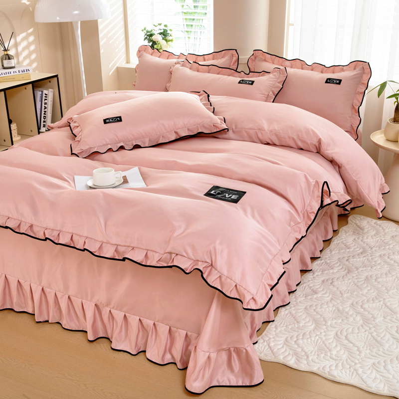 找底底2023新款230g牛奶绒法莱绒刺绣蕾丝边床裙款四件套,豆沙色,橘橙色,玛卡蓝,嫩黄,浅粉色,雾紫,质感灰