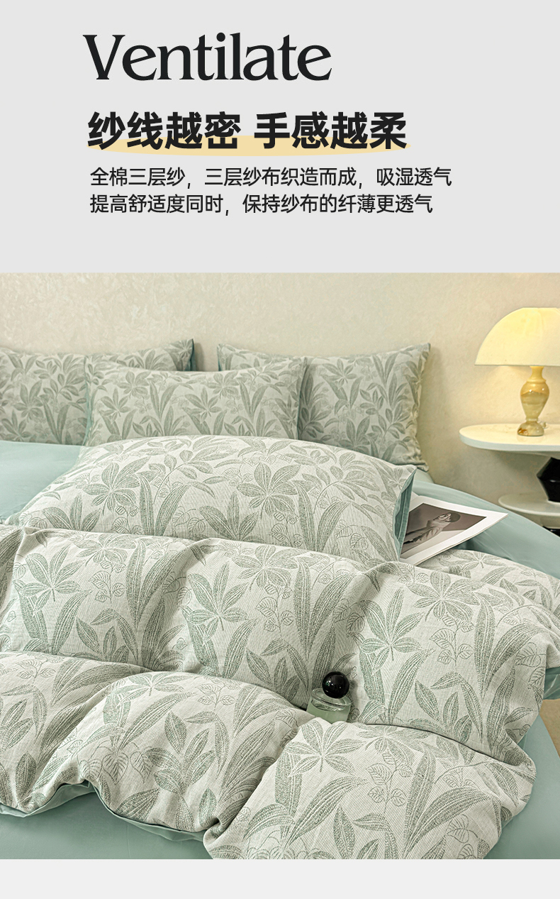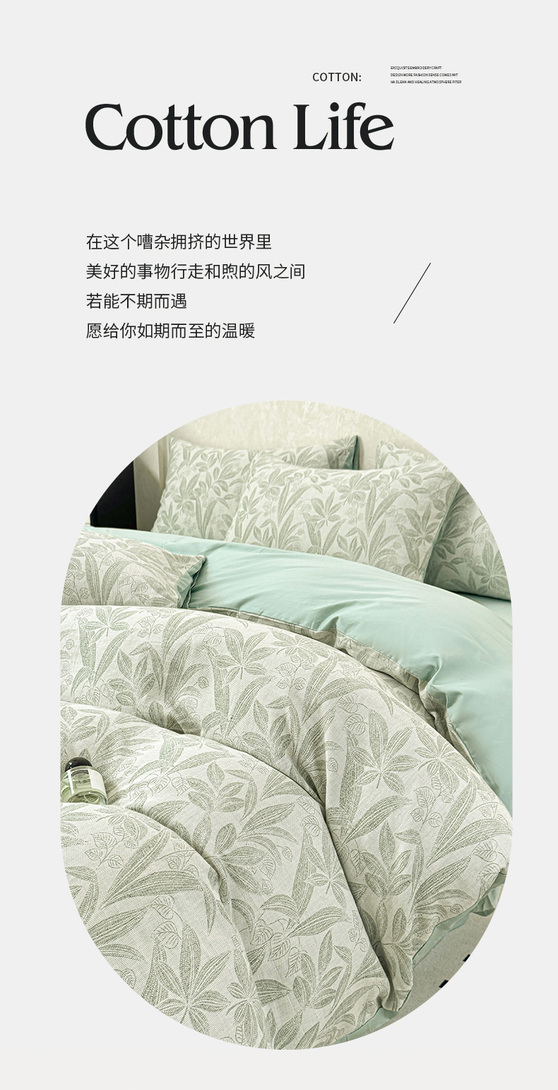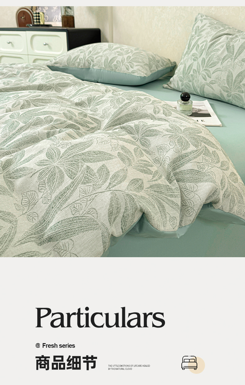 当前位置: 91家纺网 > 商品网购 > 床品套件 > 四件套 > 色织四件套 > 灰鲸2025新款A类全棉三层纱色织提花系列四件套 叶语-绿