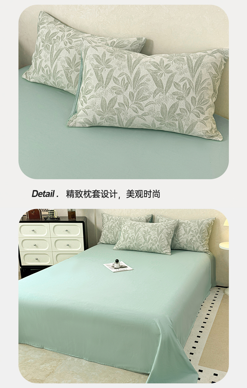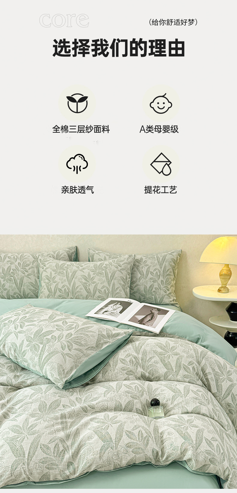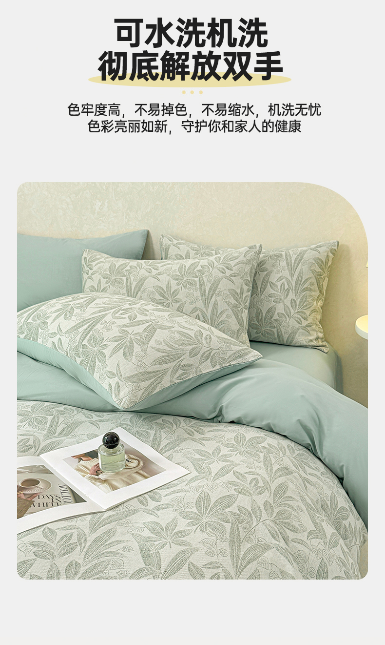 当前位置: 91家纺网 > 商品网购 > 床品套件 > 四件套 > 色织四件套 > 灰鲸2025新款A类全棉三层纱色织提花系列四件套 叶语-绿