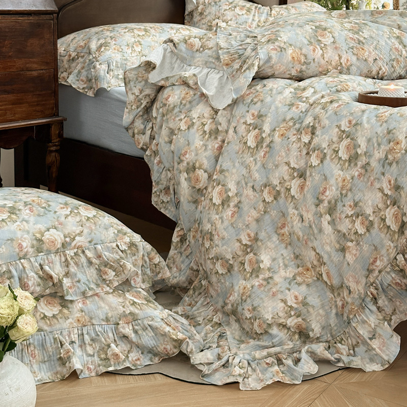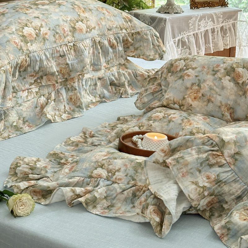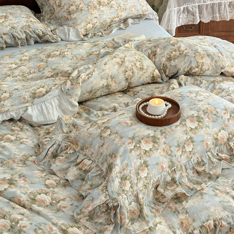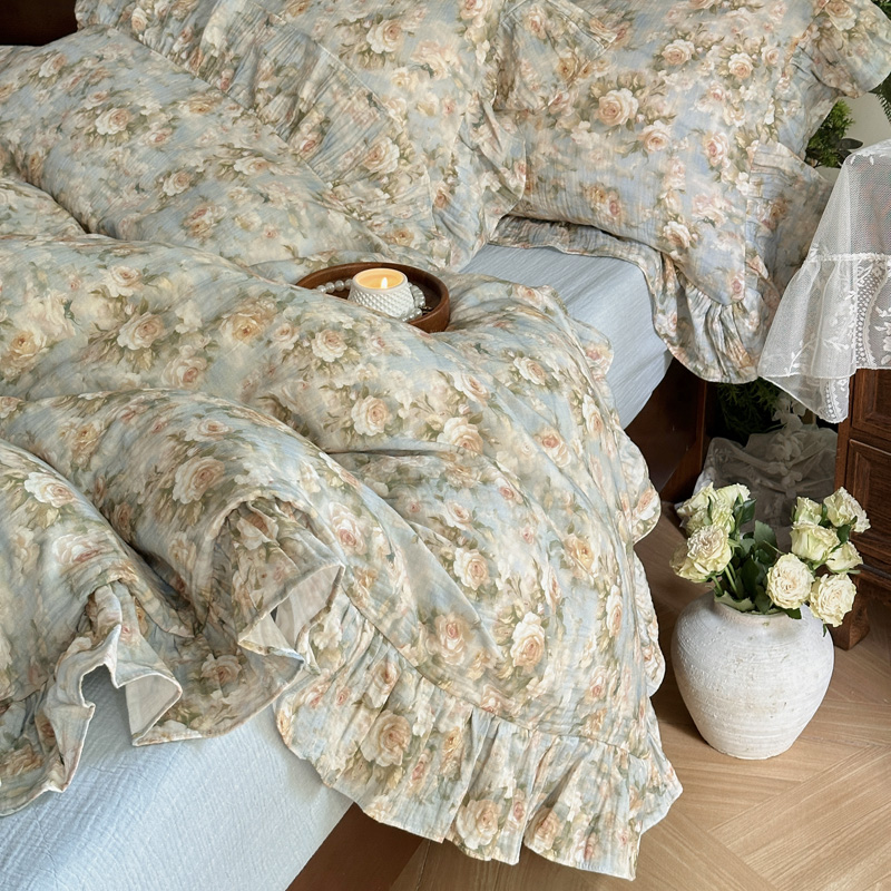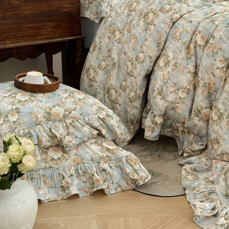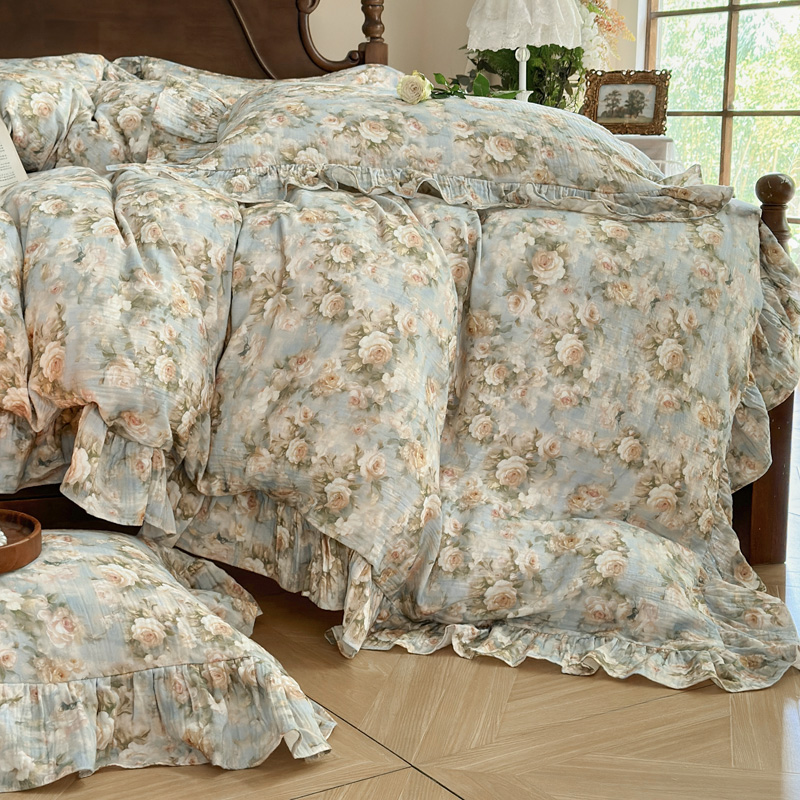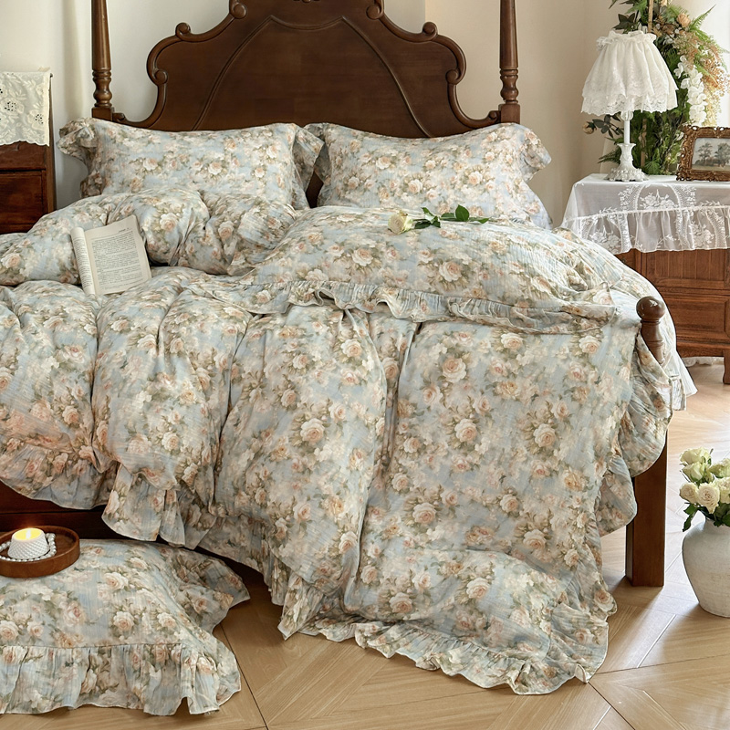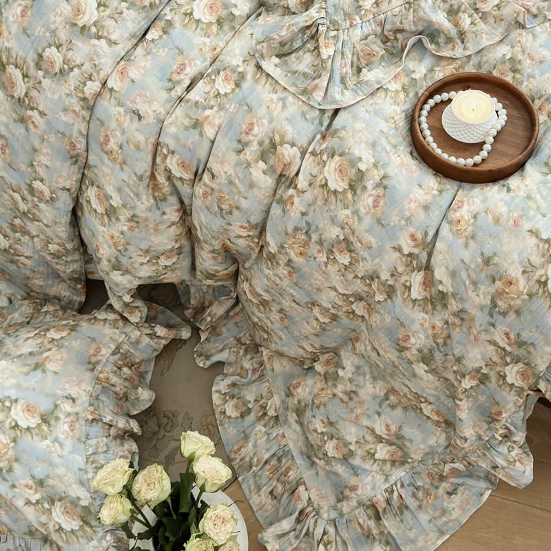 商品名称:木楌家居2025新款法式油画风全棉双层皱皱纱四件套 烟雨江南