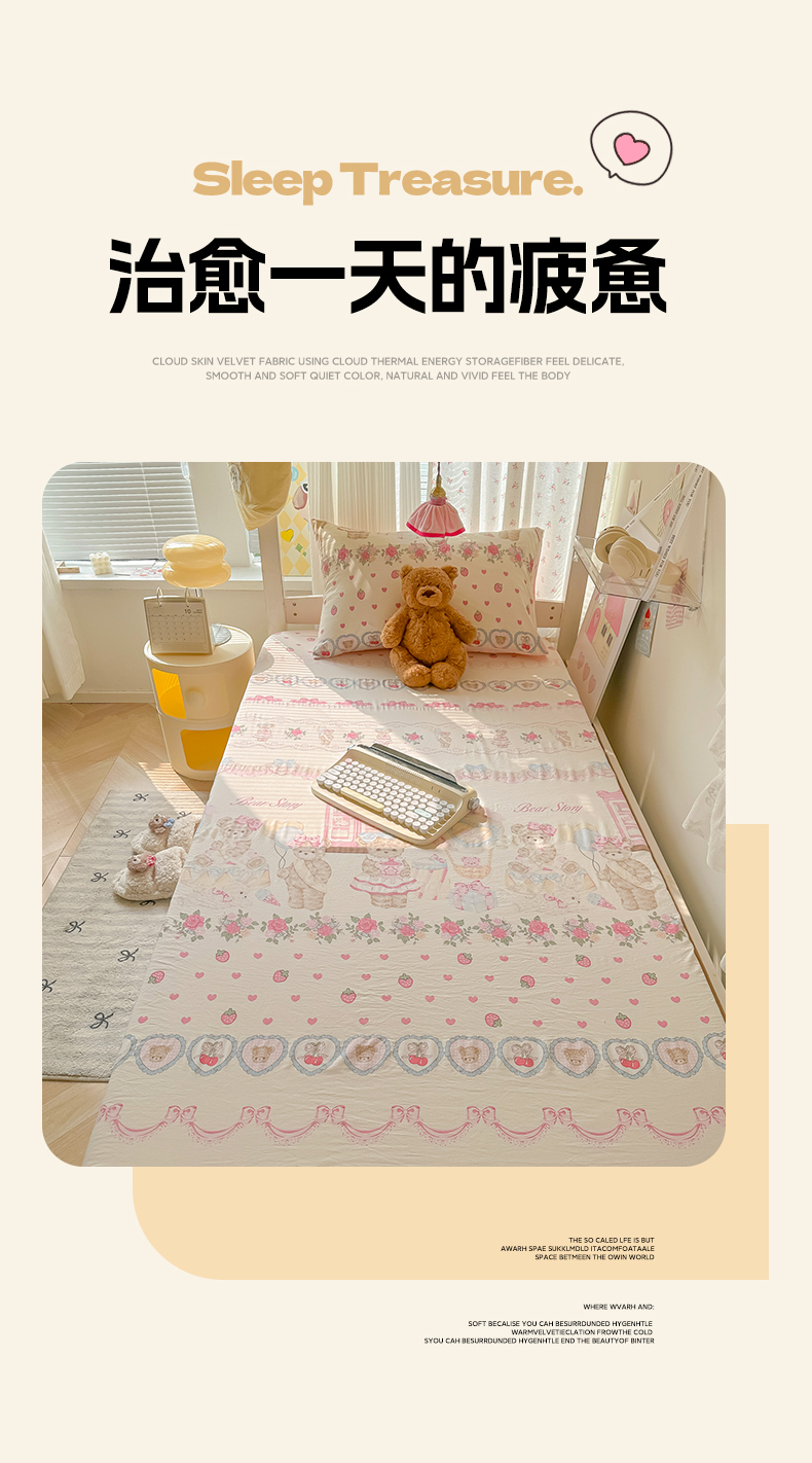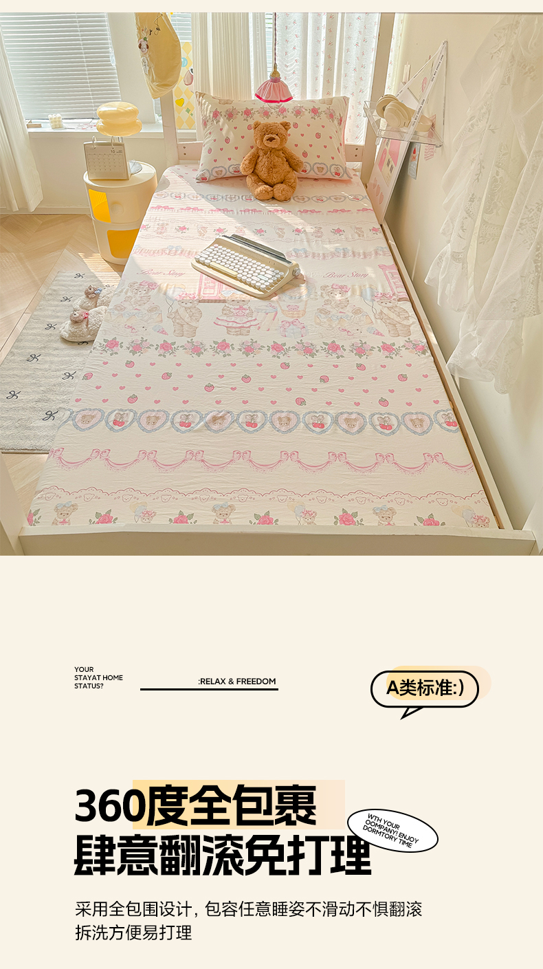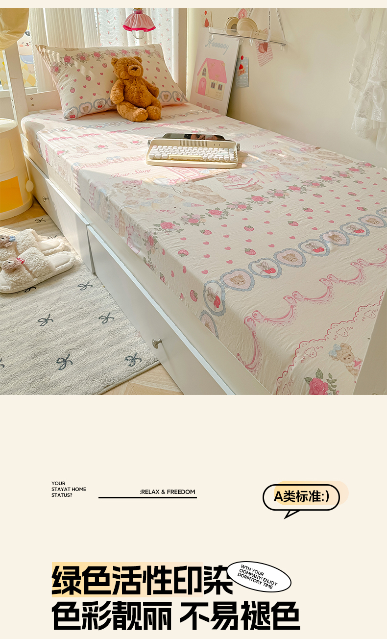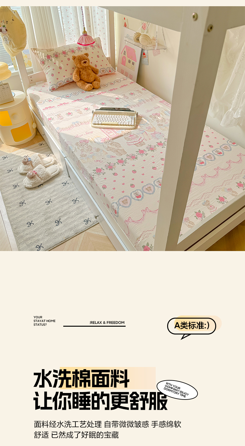 • 91家纺网 家纺一手货源 找家纺 韩巢家纺 2025新款上下铺学生宿舍专用床笠单件寝室高低床热销款防滑床单床套 小熊玩偶屋