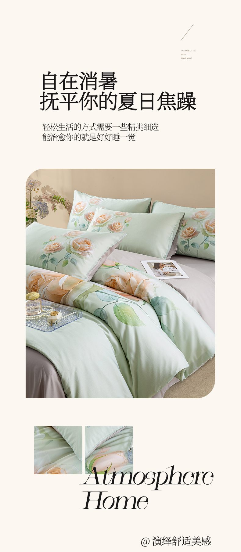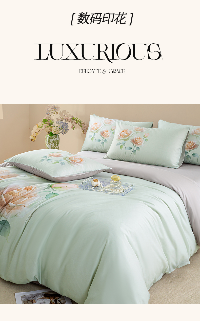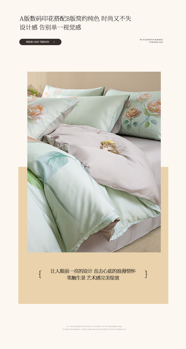 商品名称:麦田家纺 2025新款50S莱赛尔天丝印花四件套 览芳华-绿