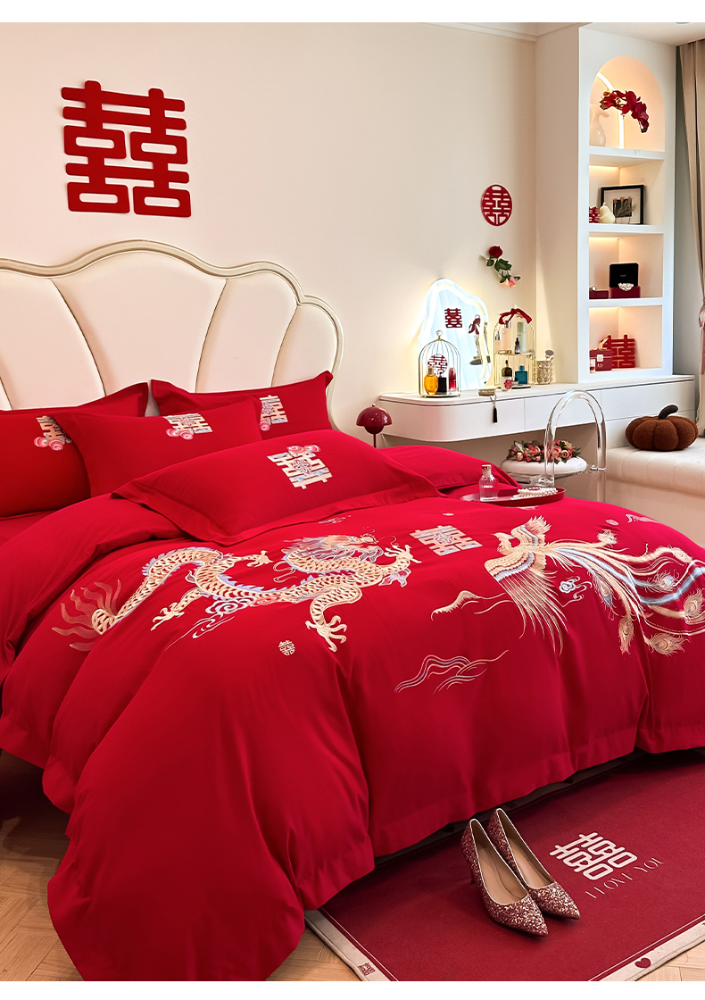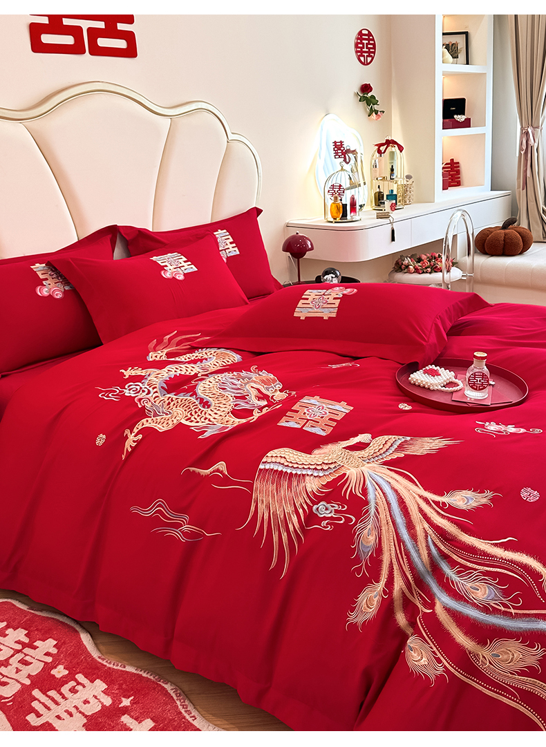 火麒麟家纺 2025新款亲肤棉婚庆刺绣四件套 龙飞凤舞