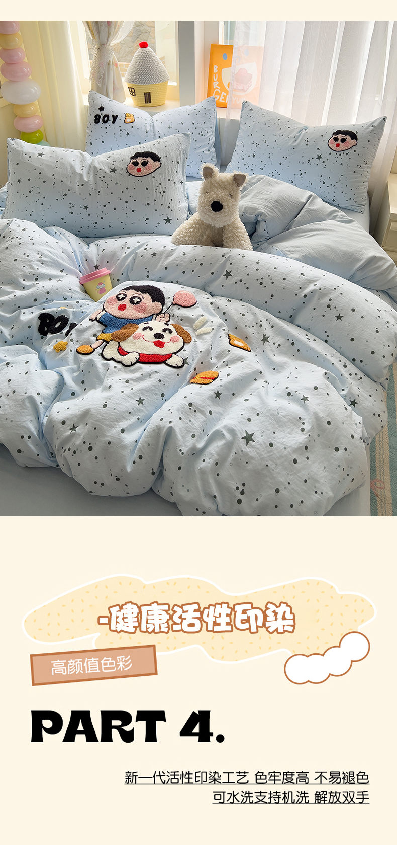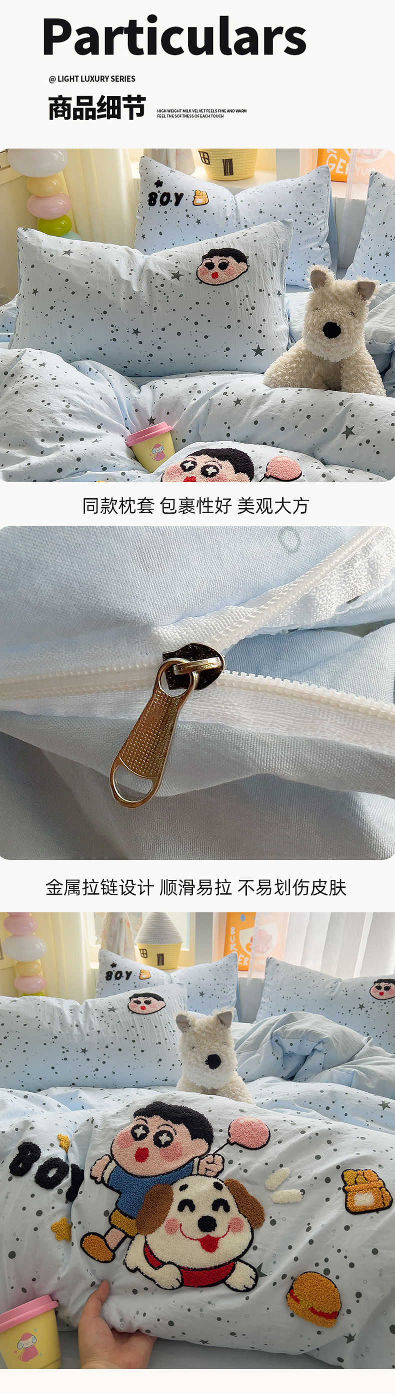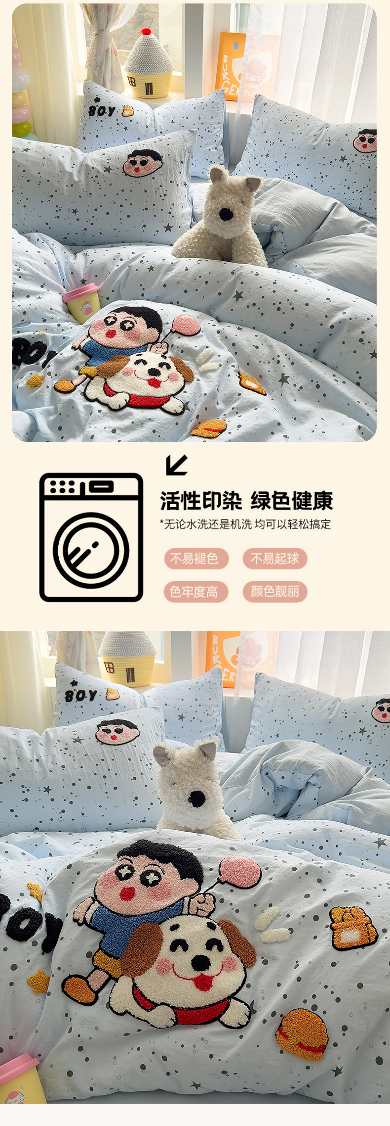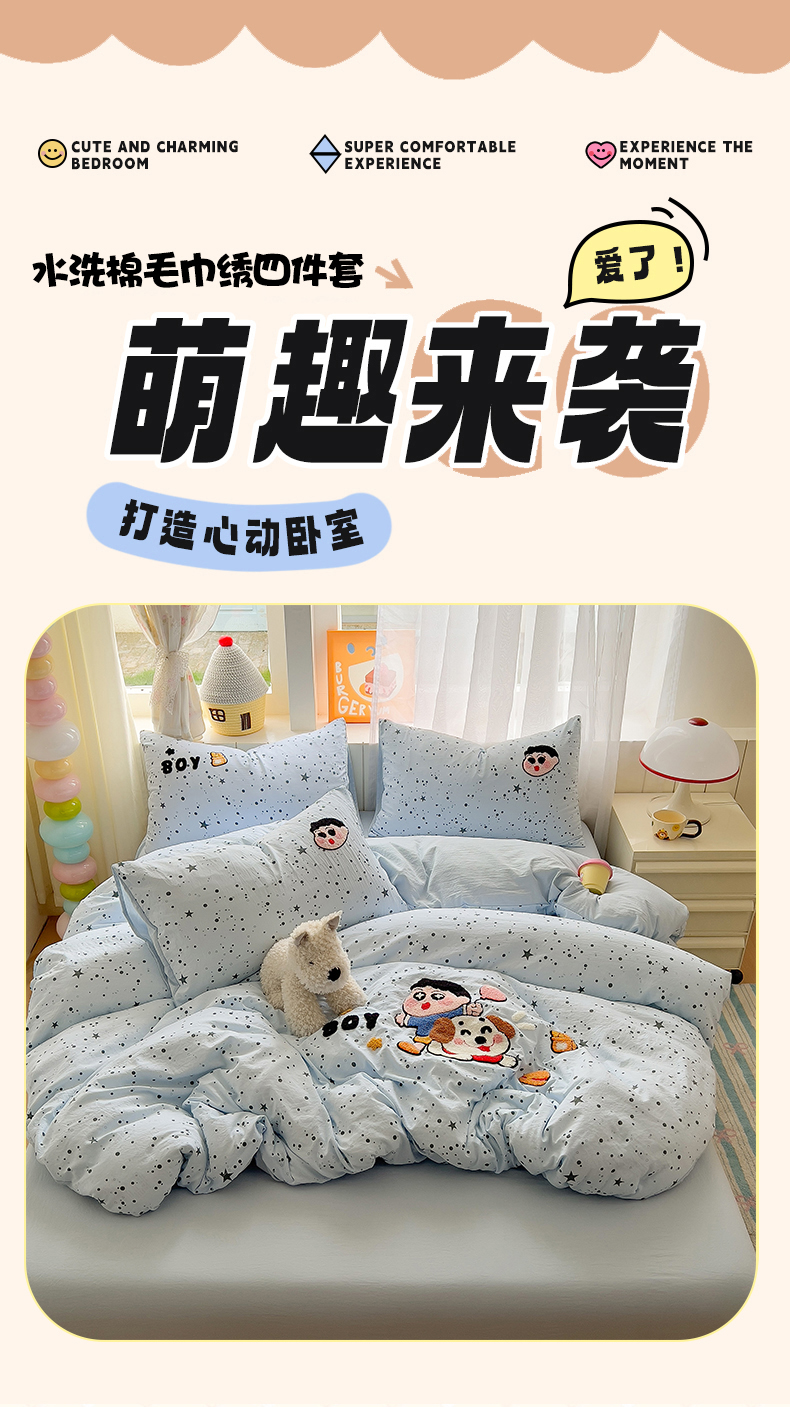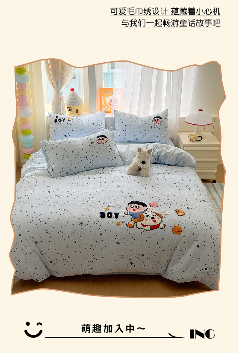 当前位置: 91家纺网 > 商品网购 > 床品套件 > 四件套 > 水洗棉四件套 > 易辰美 2025新款水洗棉毛巾绣卡通四件套 小新与大白