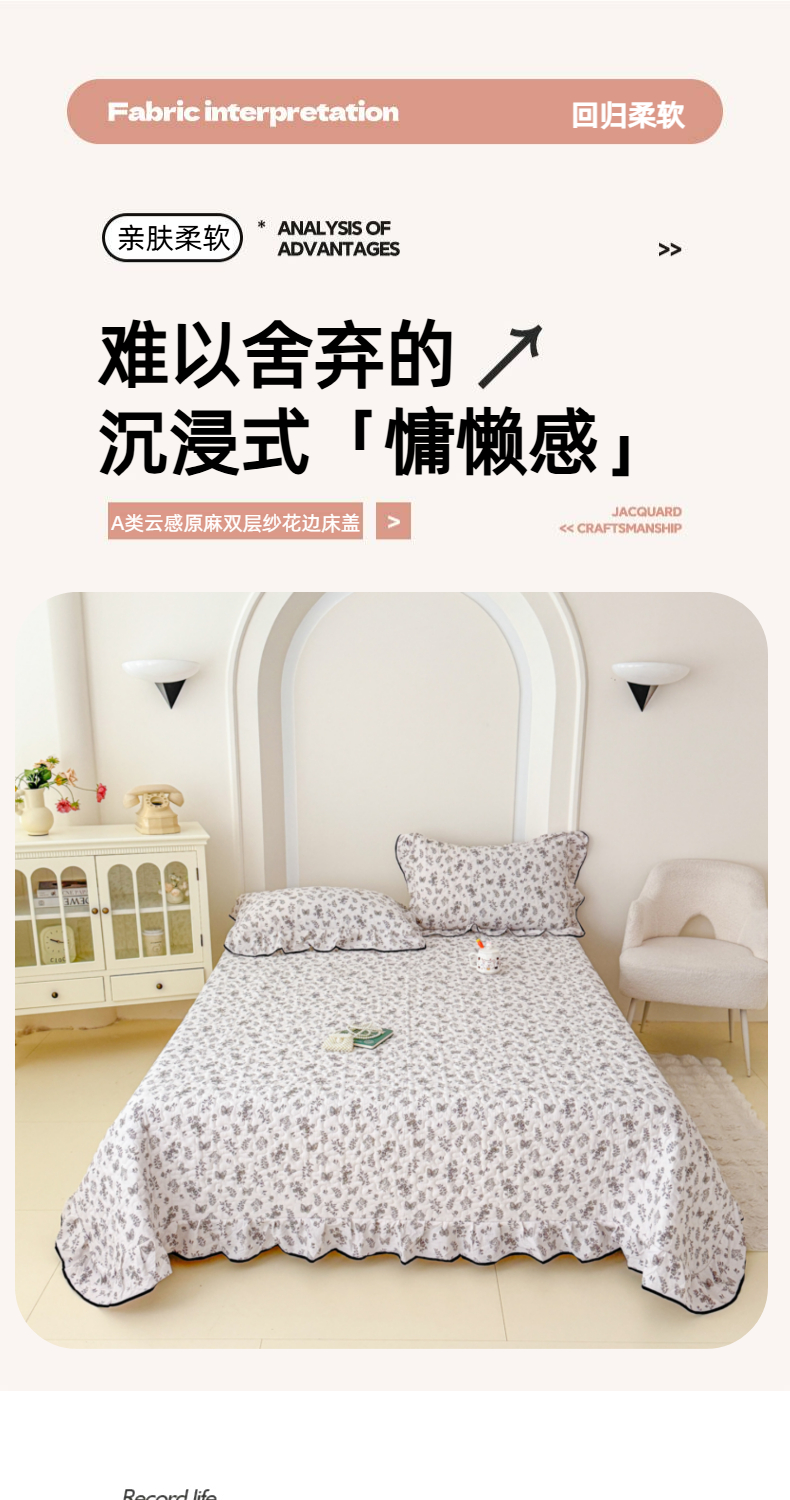 • 91家纺网 家纺一手货源 找家纺 小萌虎 2025新款A类云感原麻双层纱花边床盖三件套 浅画【花边款】