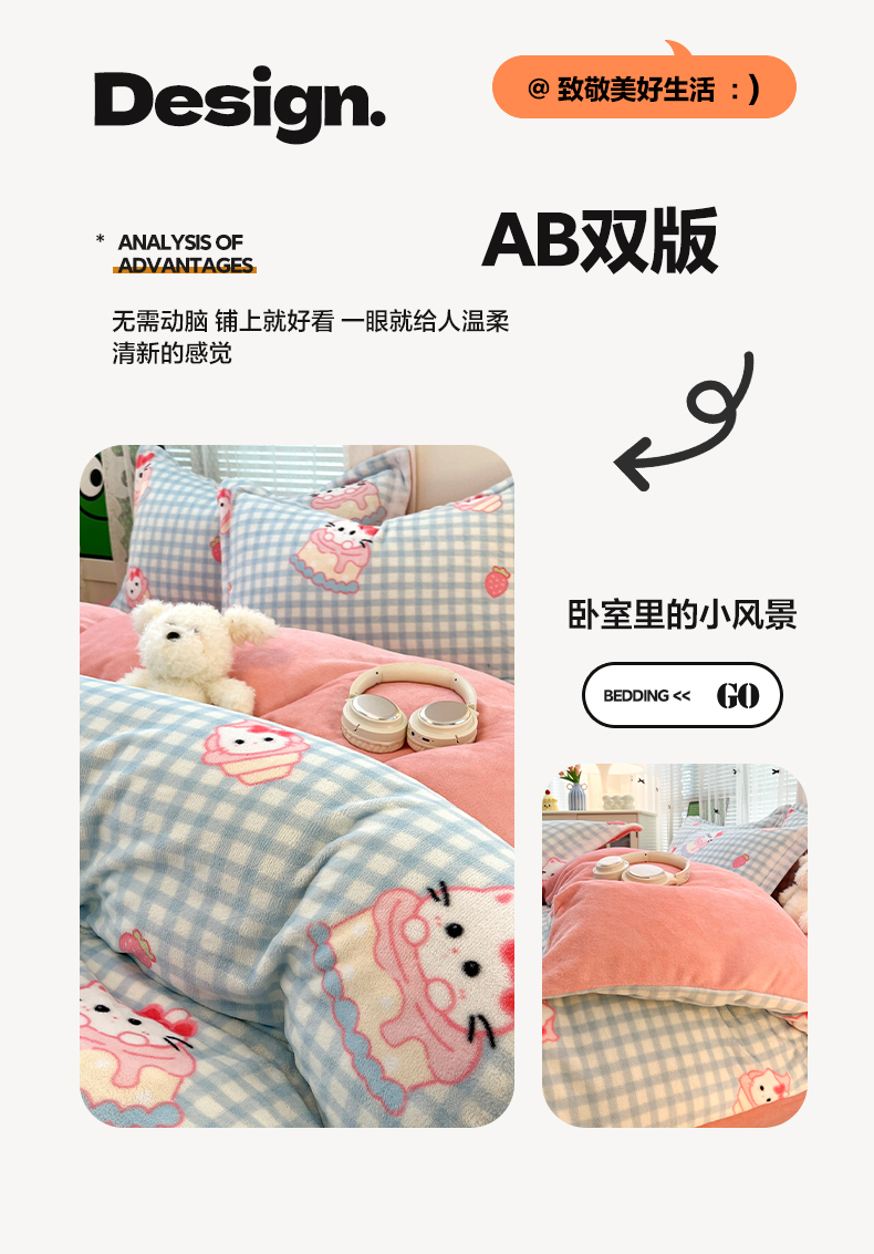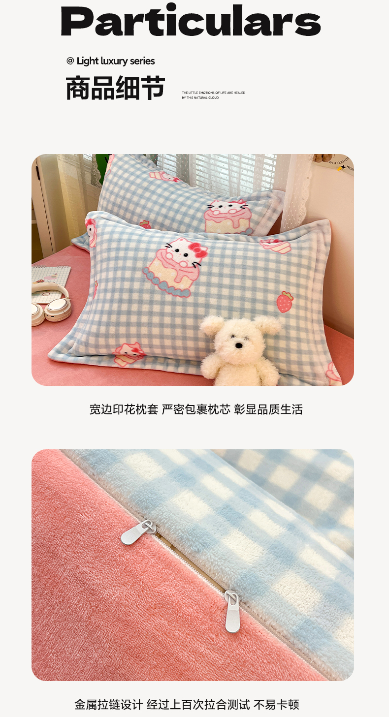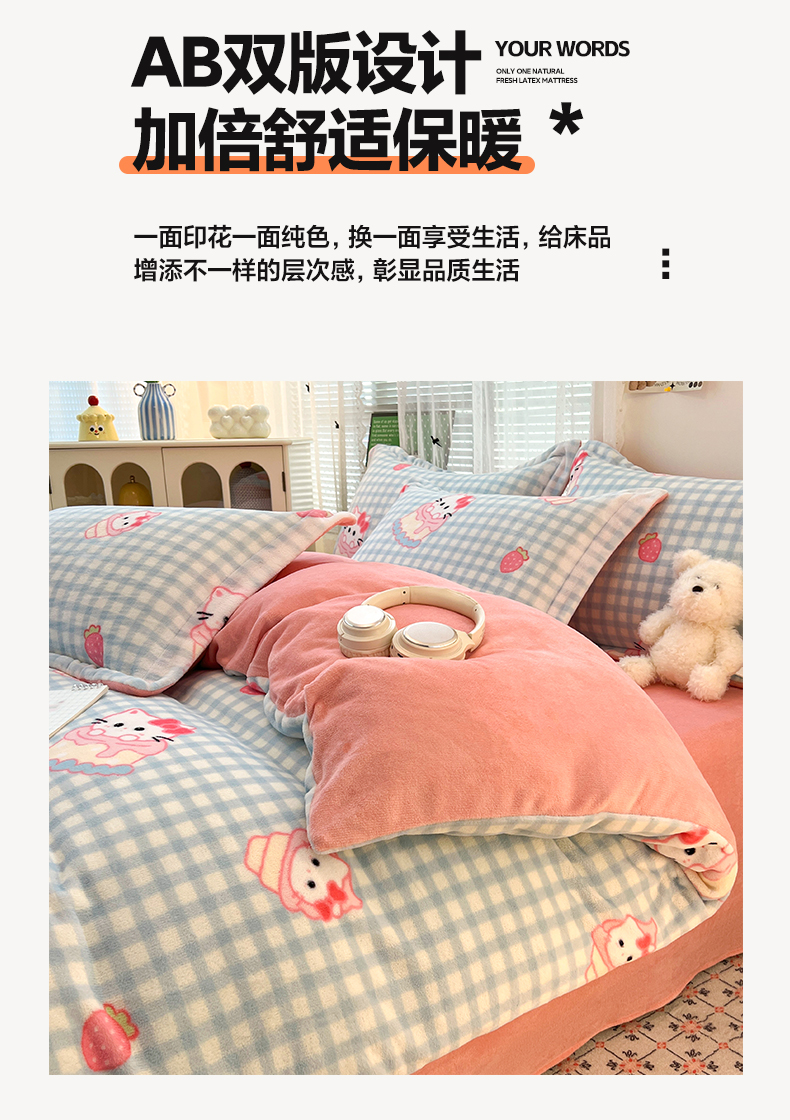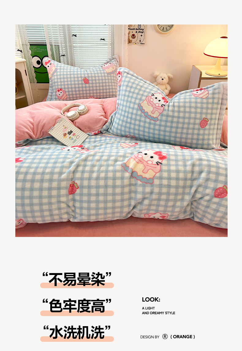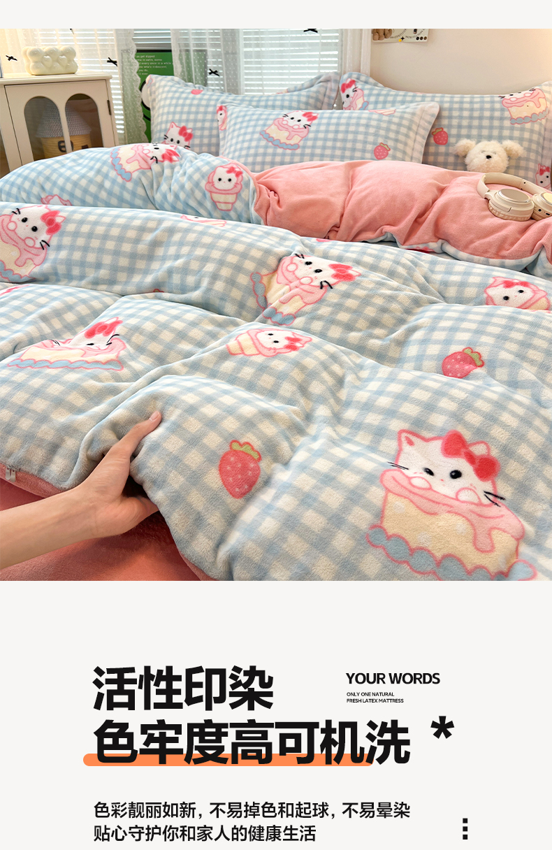 当前位置: 91家纺网 > 商品网购 > 床品套件 > 四件套 > 牛奶绒四件套 > 启发 2025新款高克重小清新牛奶绒印花四件套 蛋糕Kitty