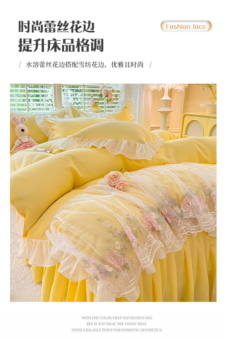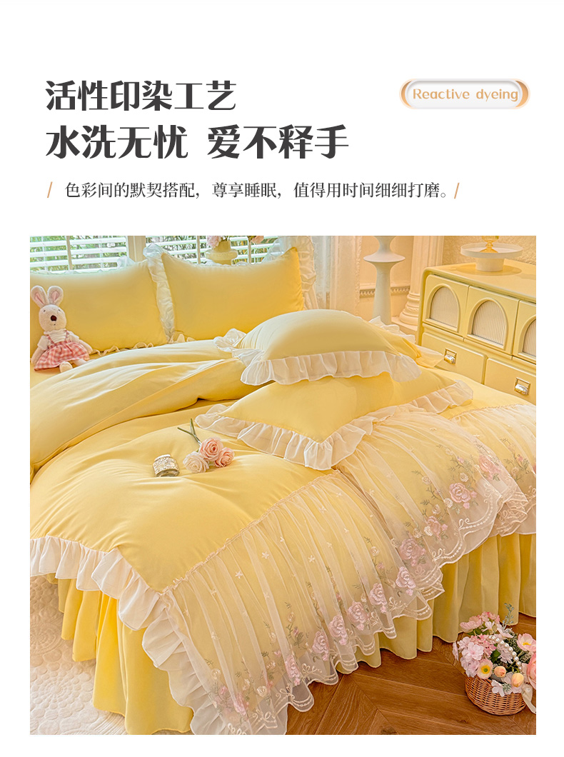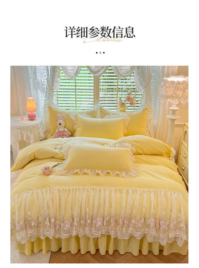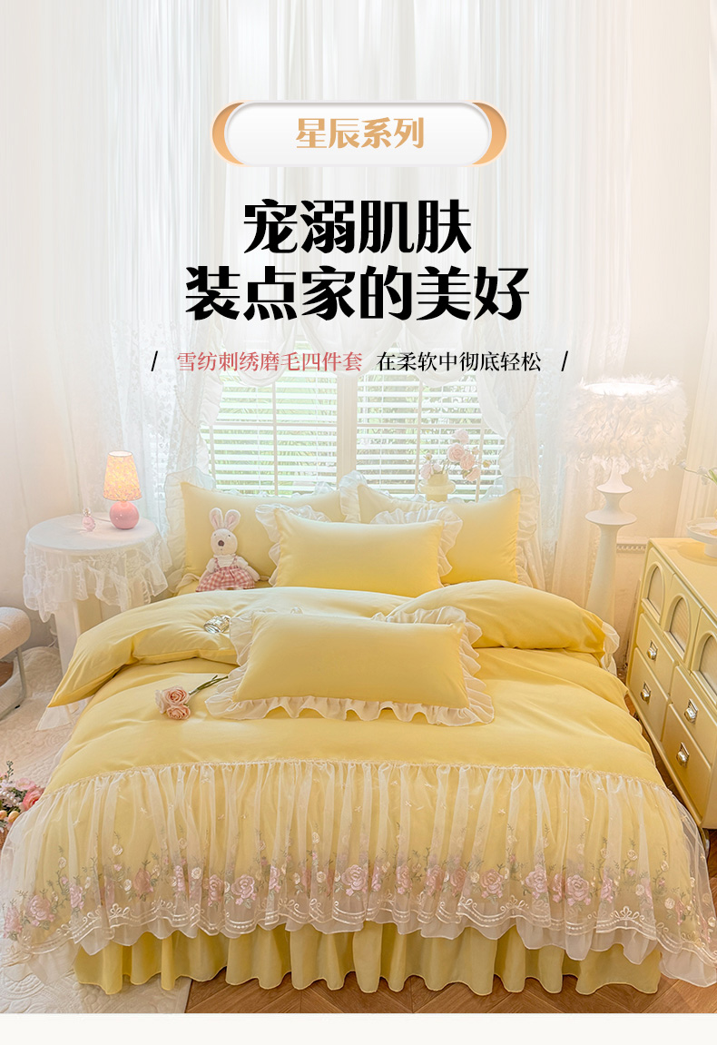 当前位置: 91家纺网 > 商品网购 > 床品套件 > 四件套 > 其它四件套 > 后庭寝室 2025新款韩版蕾丝床裙款四件套-星辰系列 星辰-嫩黄