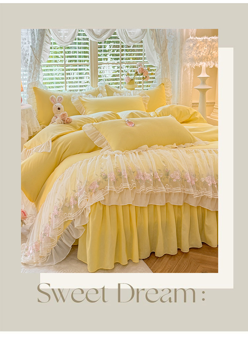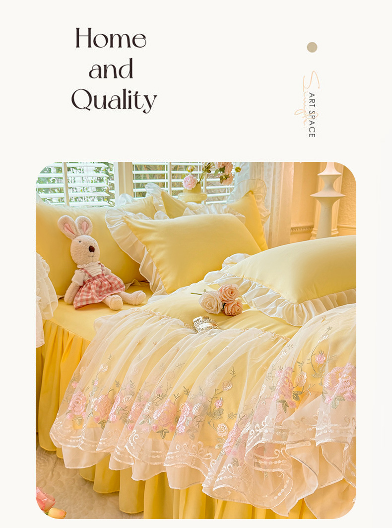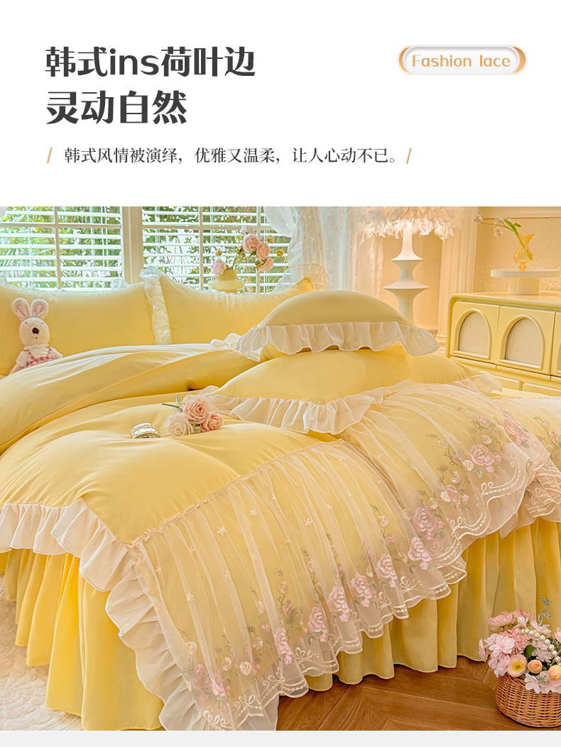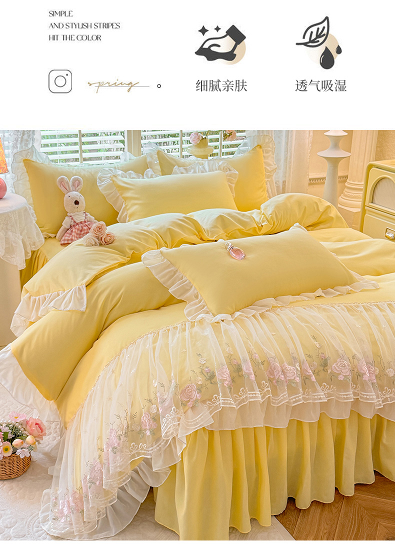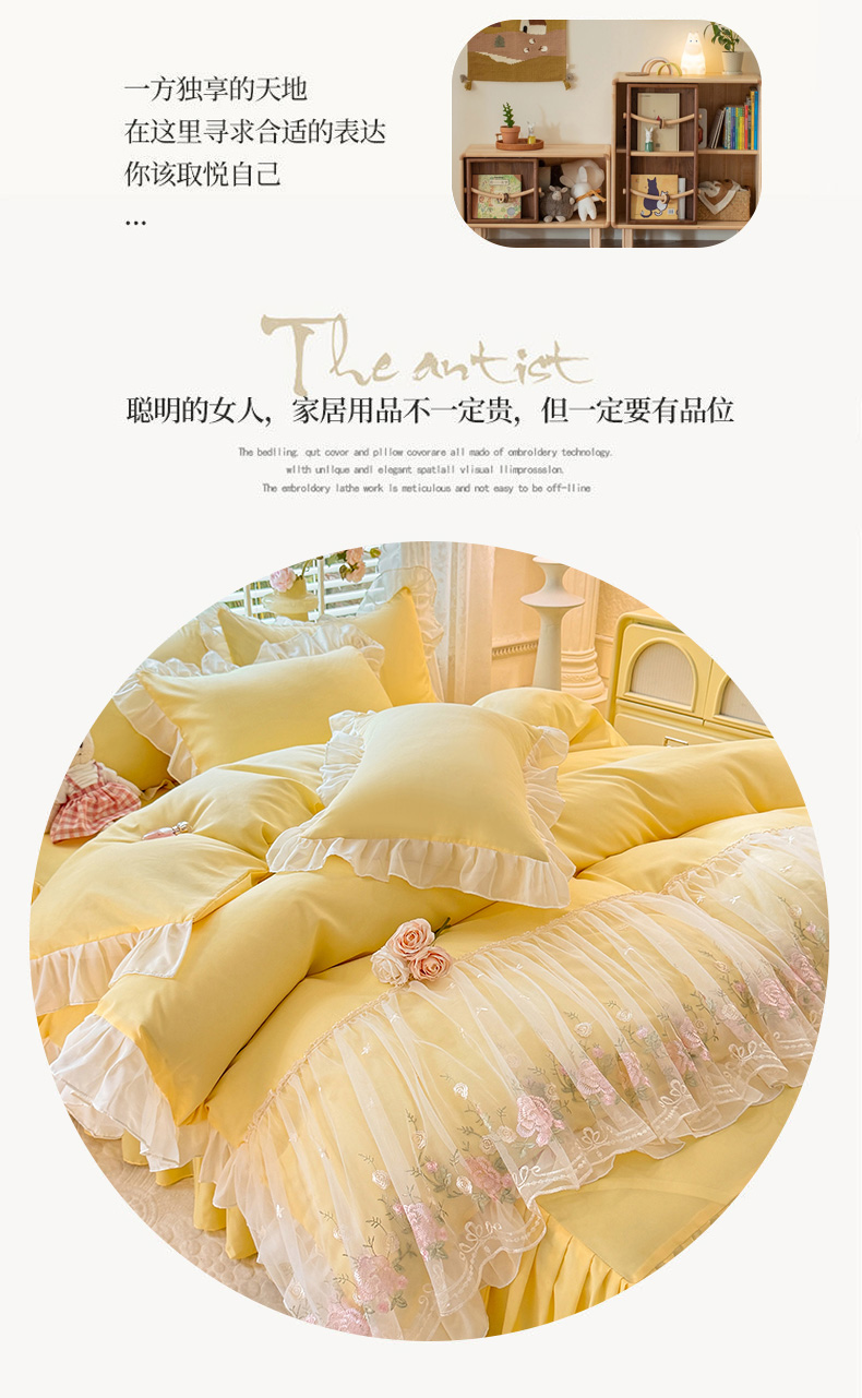 当前位置: 91家纺网 > 商品网购 > 床品套件 > 四件套 > 其它四件套 > 后庭寝室 2025新款韩版蕾丝床裙款四件套-星辰系列 星辰-嫩黄