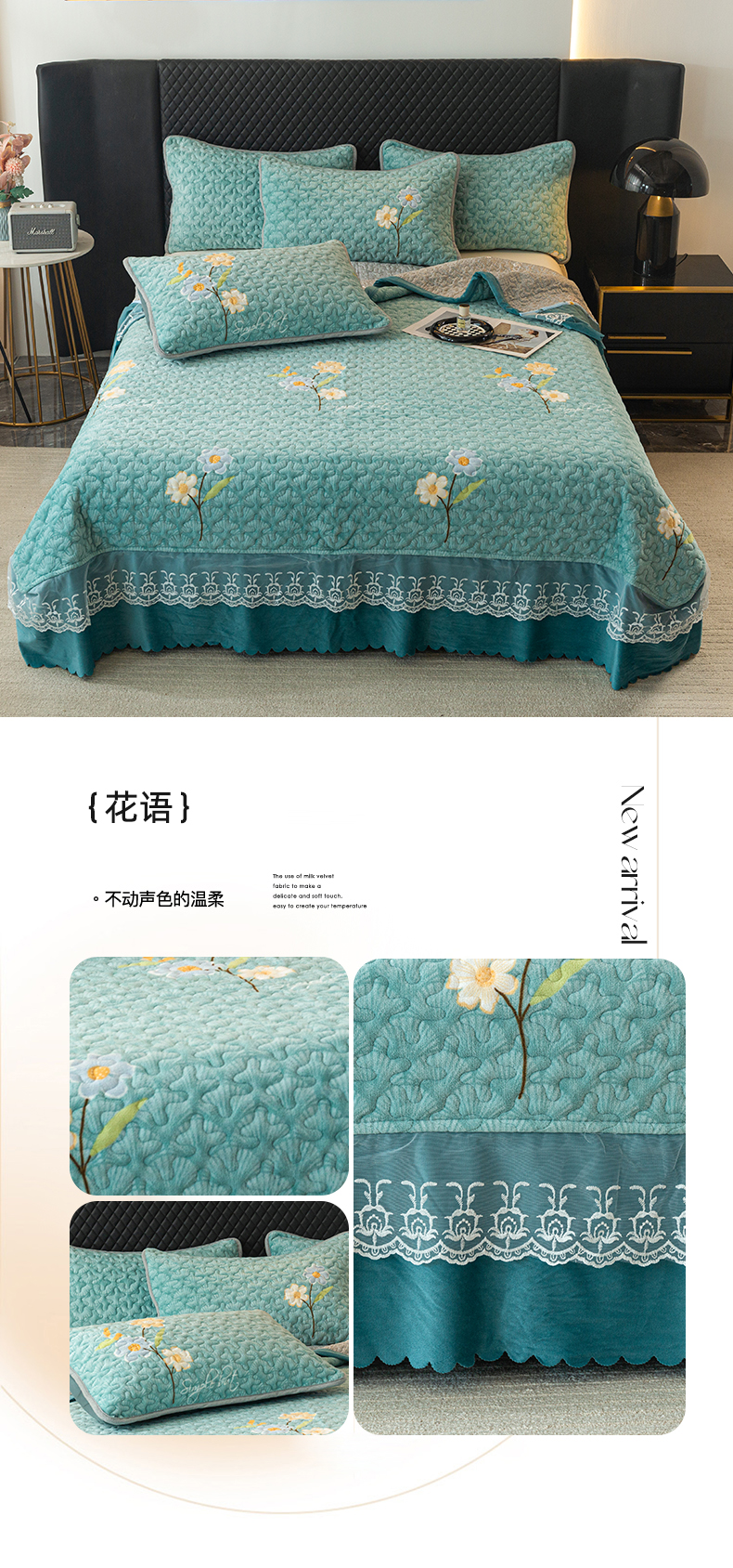 梓依家纺 2025新款牛奶绒单床裙款蕾丝床盖三件套四件套 花语