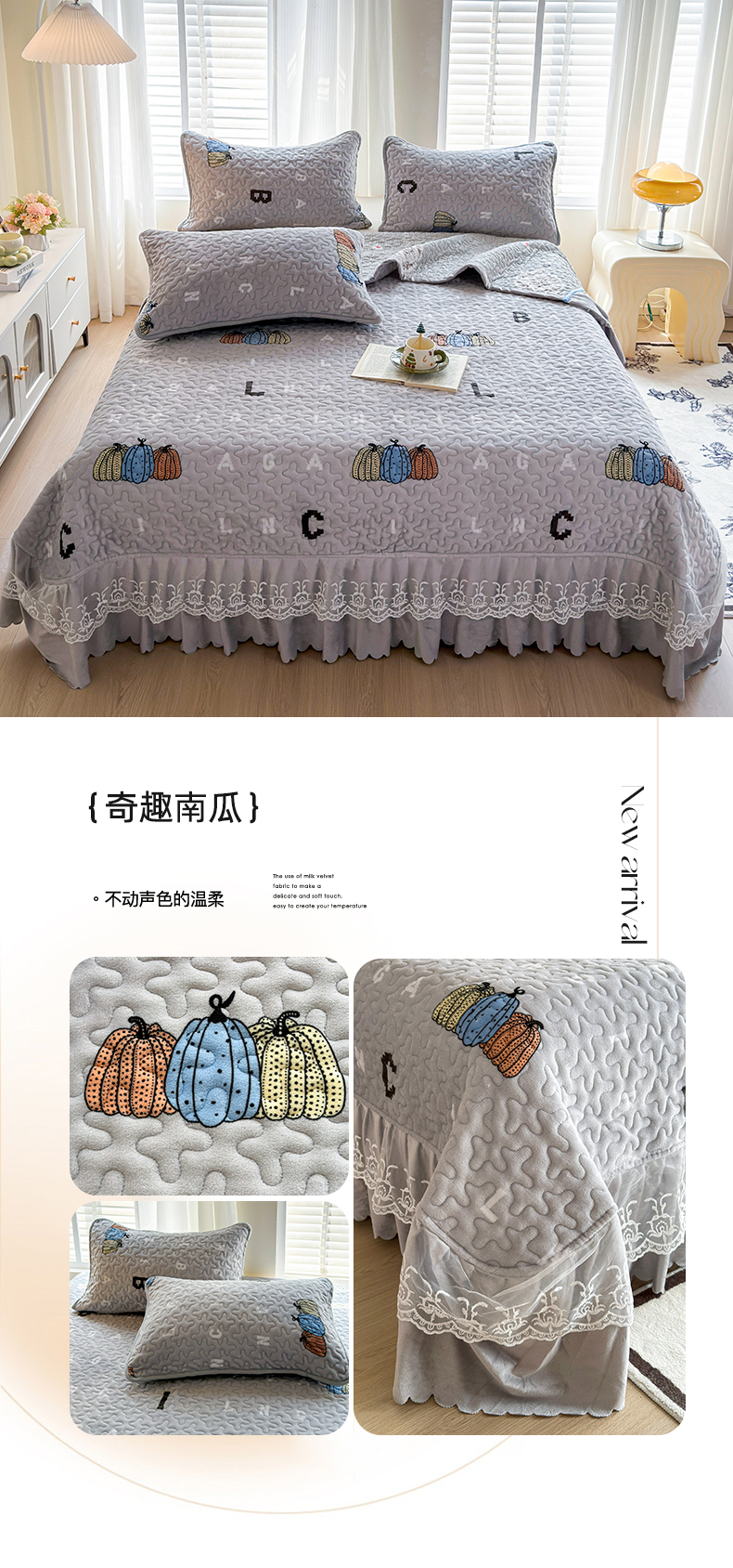 梓依家纺 2025新款牛奶绒单床裙款蕾丝床盖三件套四件套 奇趣南瓜