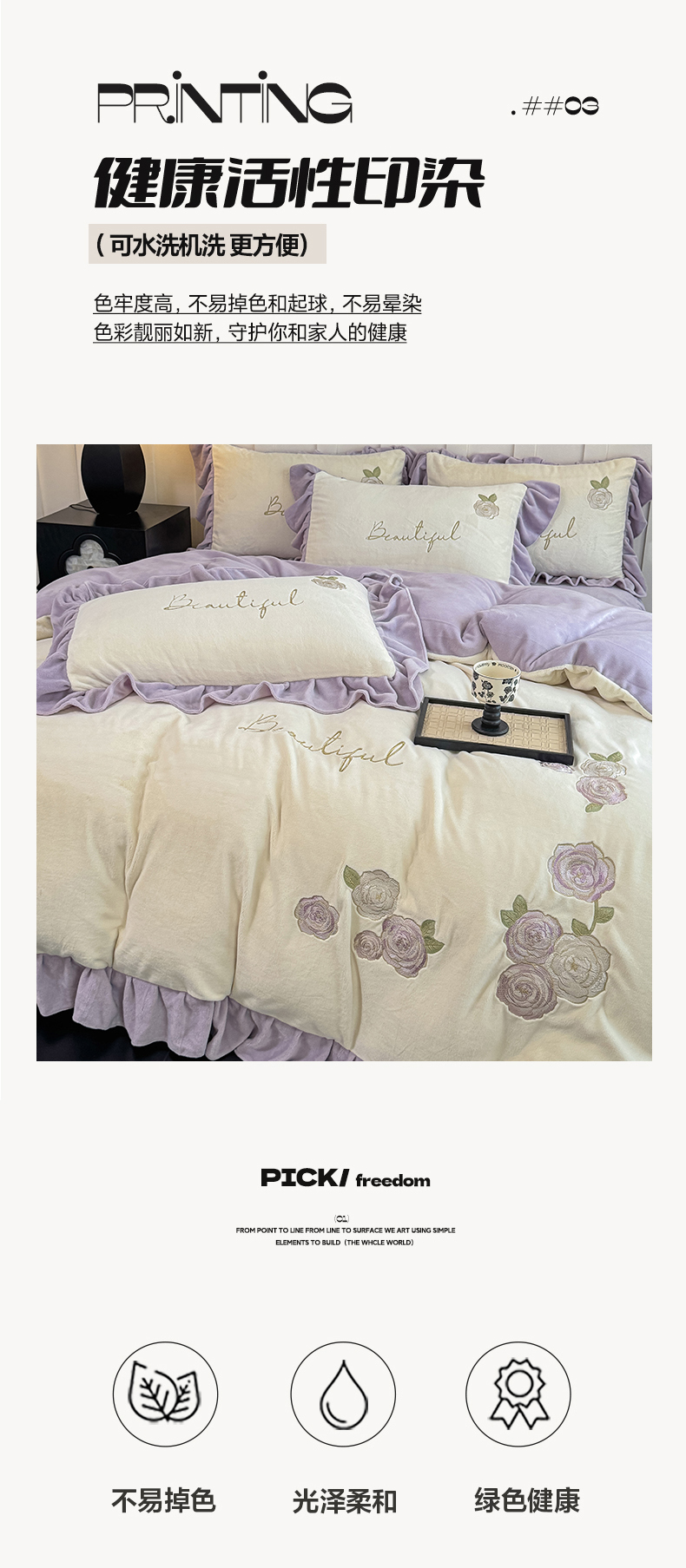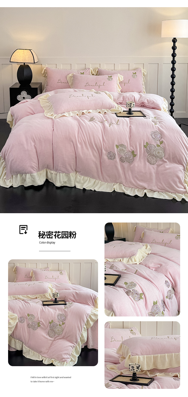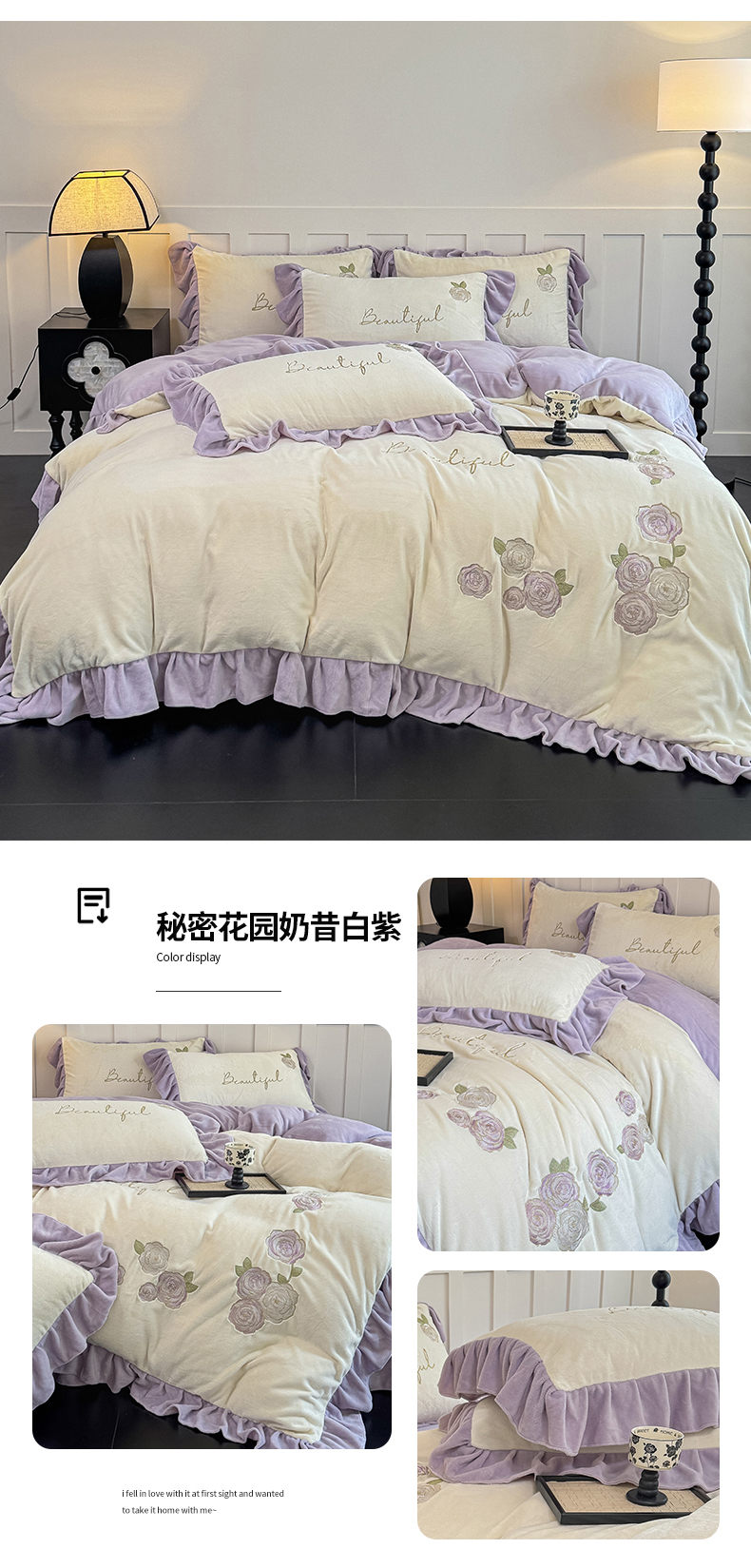商品名称:(总)KA家纺 2025新款冬高克重刺绣床裙款花边款牛奶绒四件套-秘密花园系列