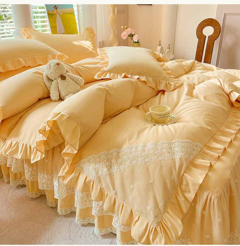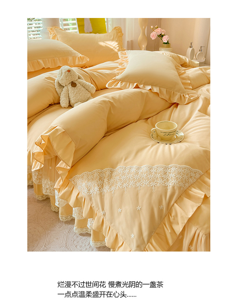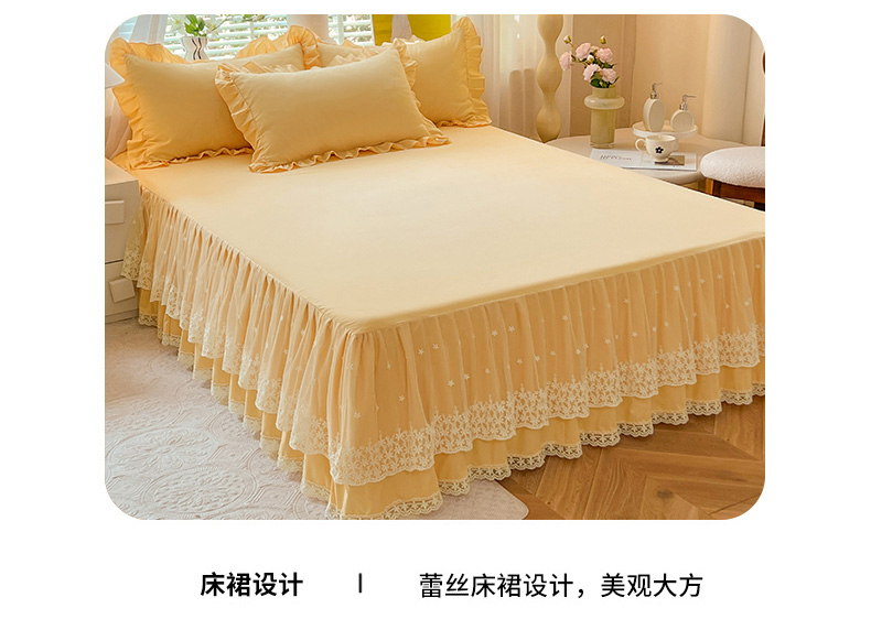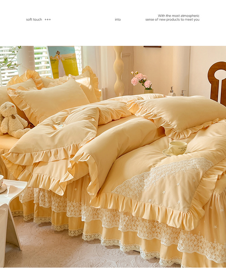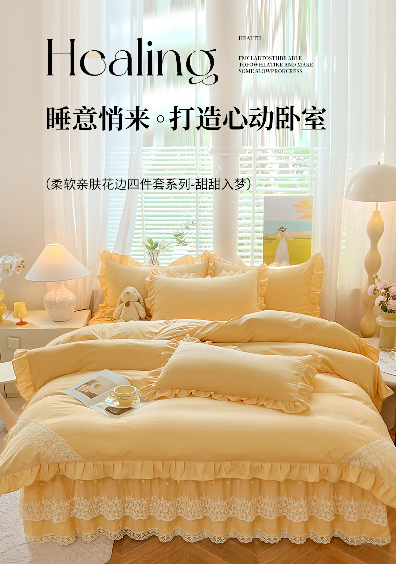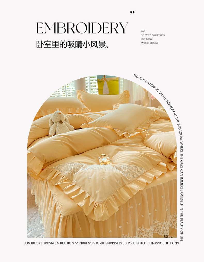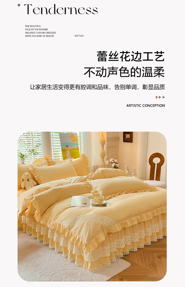后庭寝室 2025新款柔软亲肤花边蕾丝床裙四件套-花颜系列 花颜-嫩黄