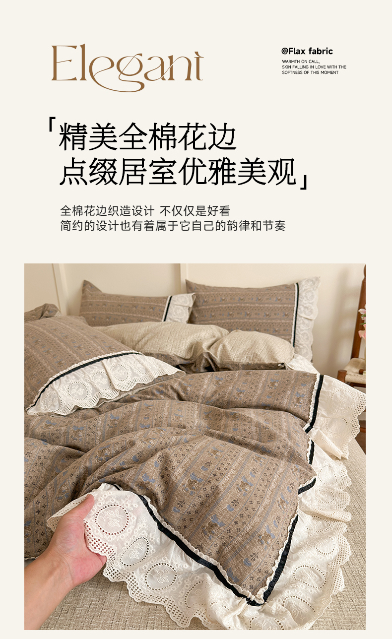 当前位置: 91家纺网 > 商品网购 > 床品套件 > 四件套 > 化纤普通四件套 > 芯贝儿 2025秋冬新款加厚全m花边m麻复古风亚麻皱皱双层纱水洗m四件套 布里奥