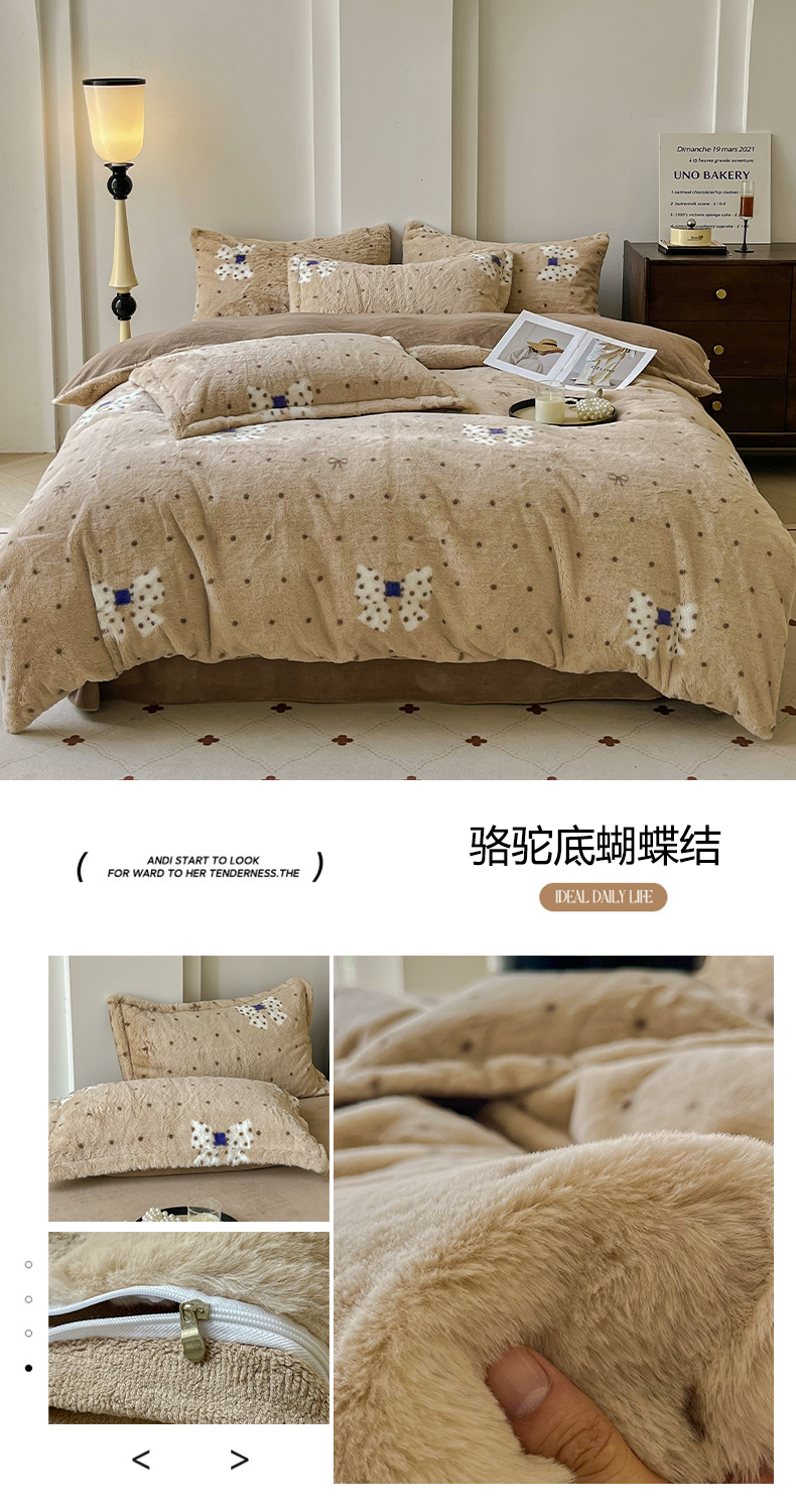 商品名称:梦纤绒 2025新款亲肤舒适兔毛印花牛奶绒保暖四件套一美拉德系 驼色底蝴蝶结