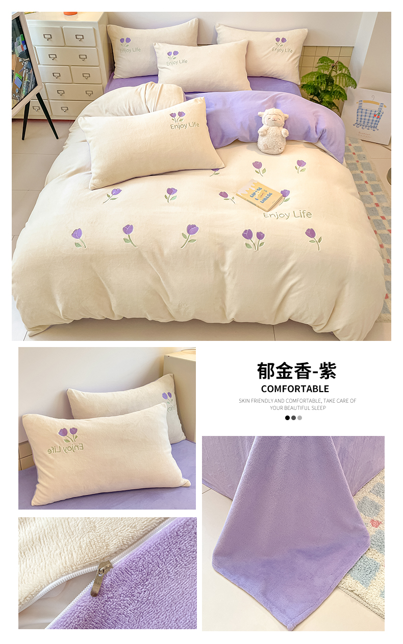 商品名称:美澳家纺 2025新款刺绣ins小清新高克重牛奶绒四件套床笠款四件套 郁金香-紫