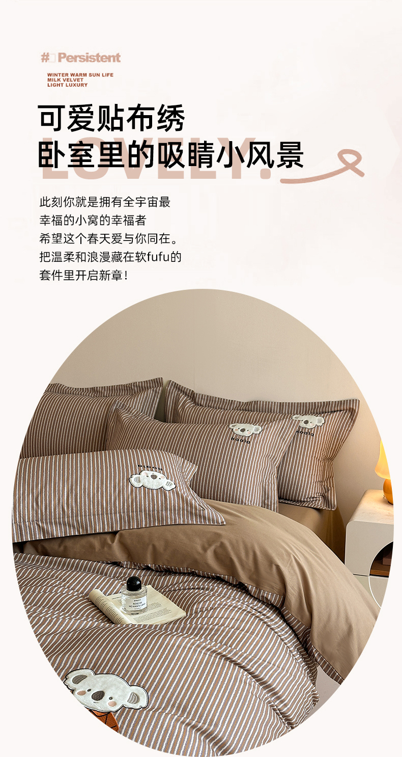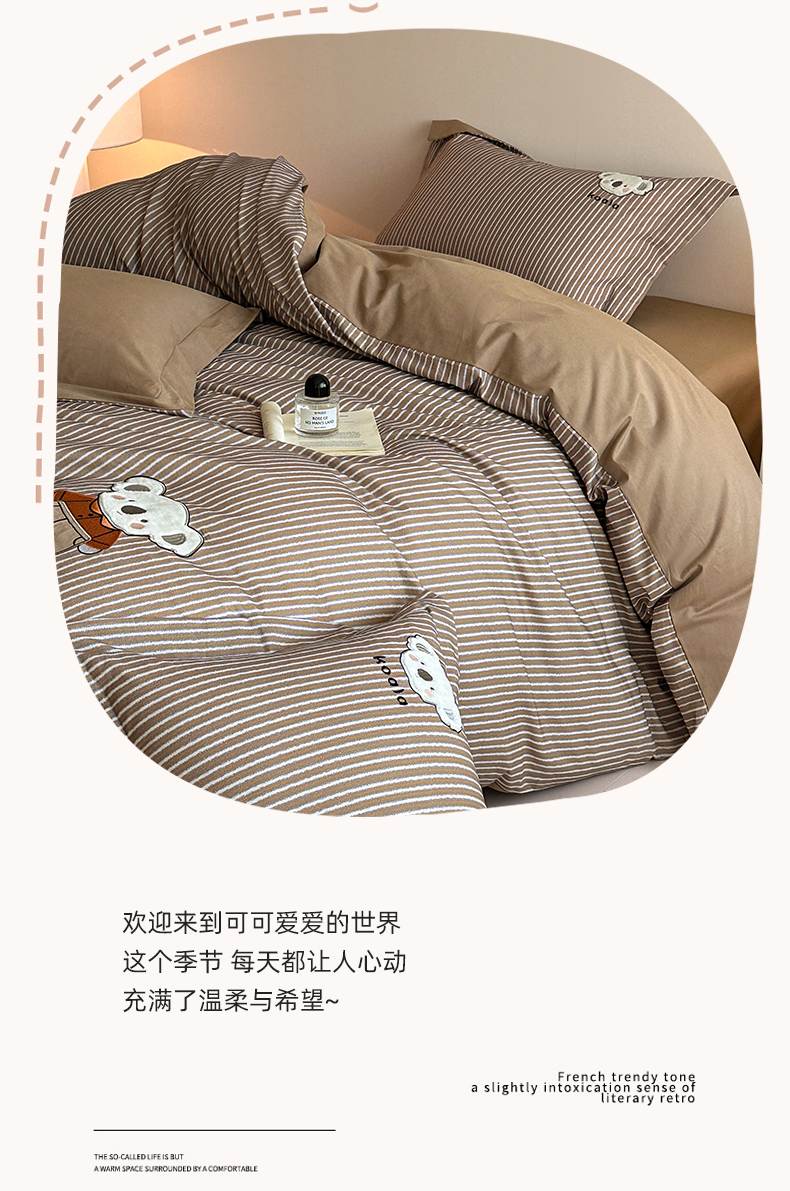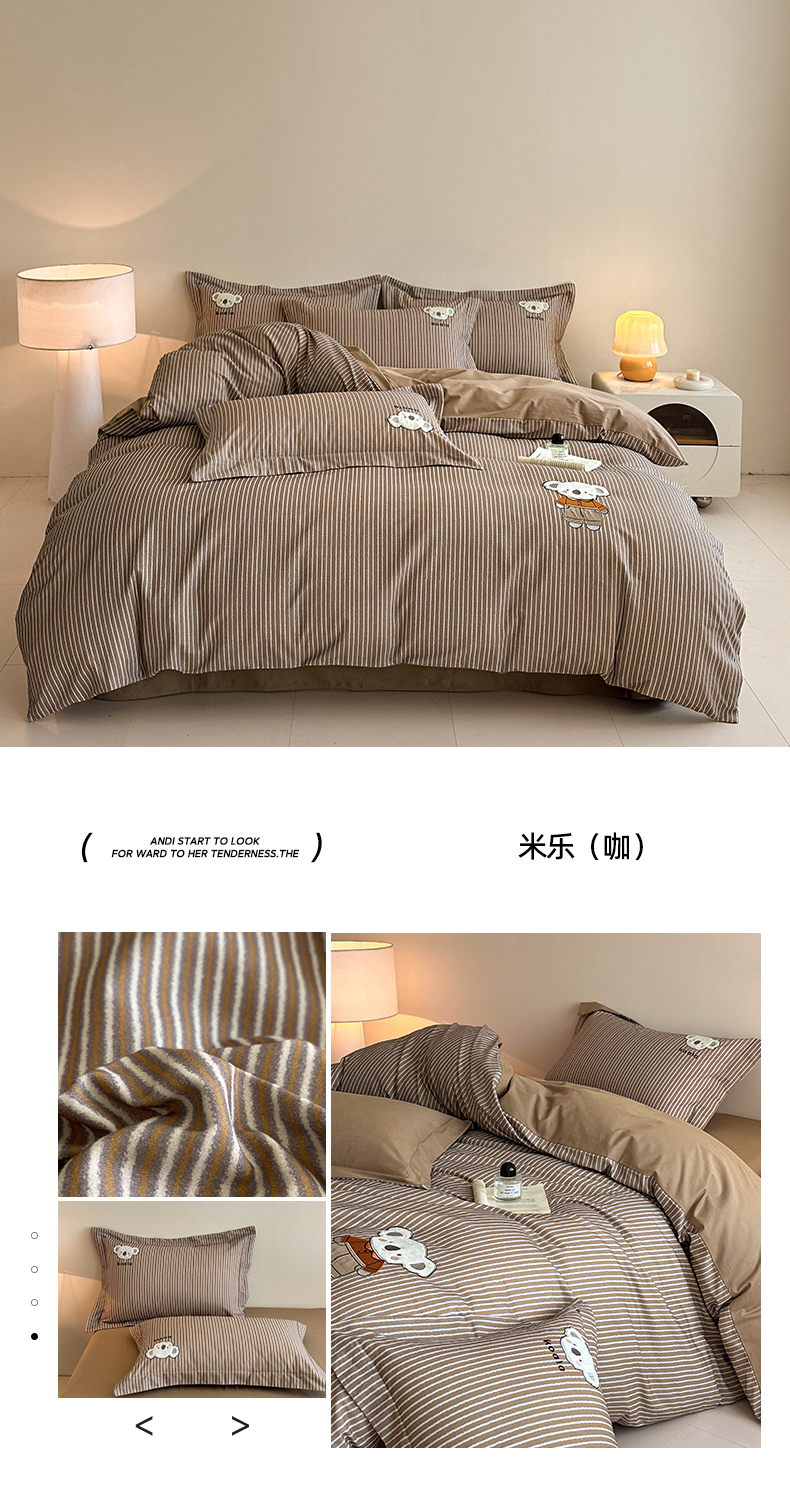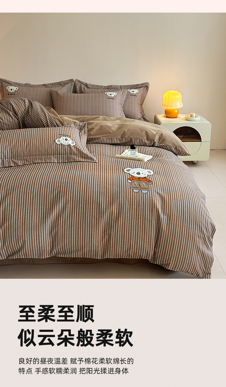 当前位置: 91家纺网 > 商品网购 > 床品套件 > 四件套 > 普通磨毛四件套 > 禾时 2025新款全棉磨毛卡通刺绣四件套 米乐(咖)