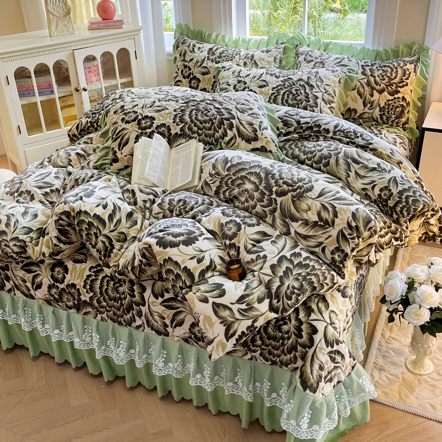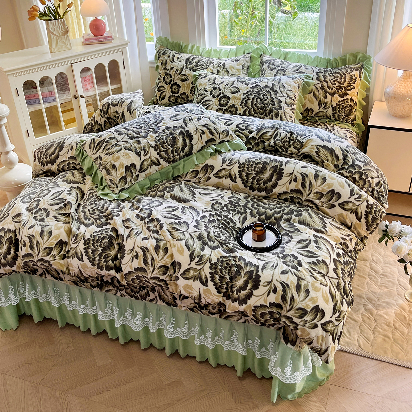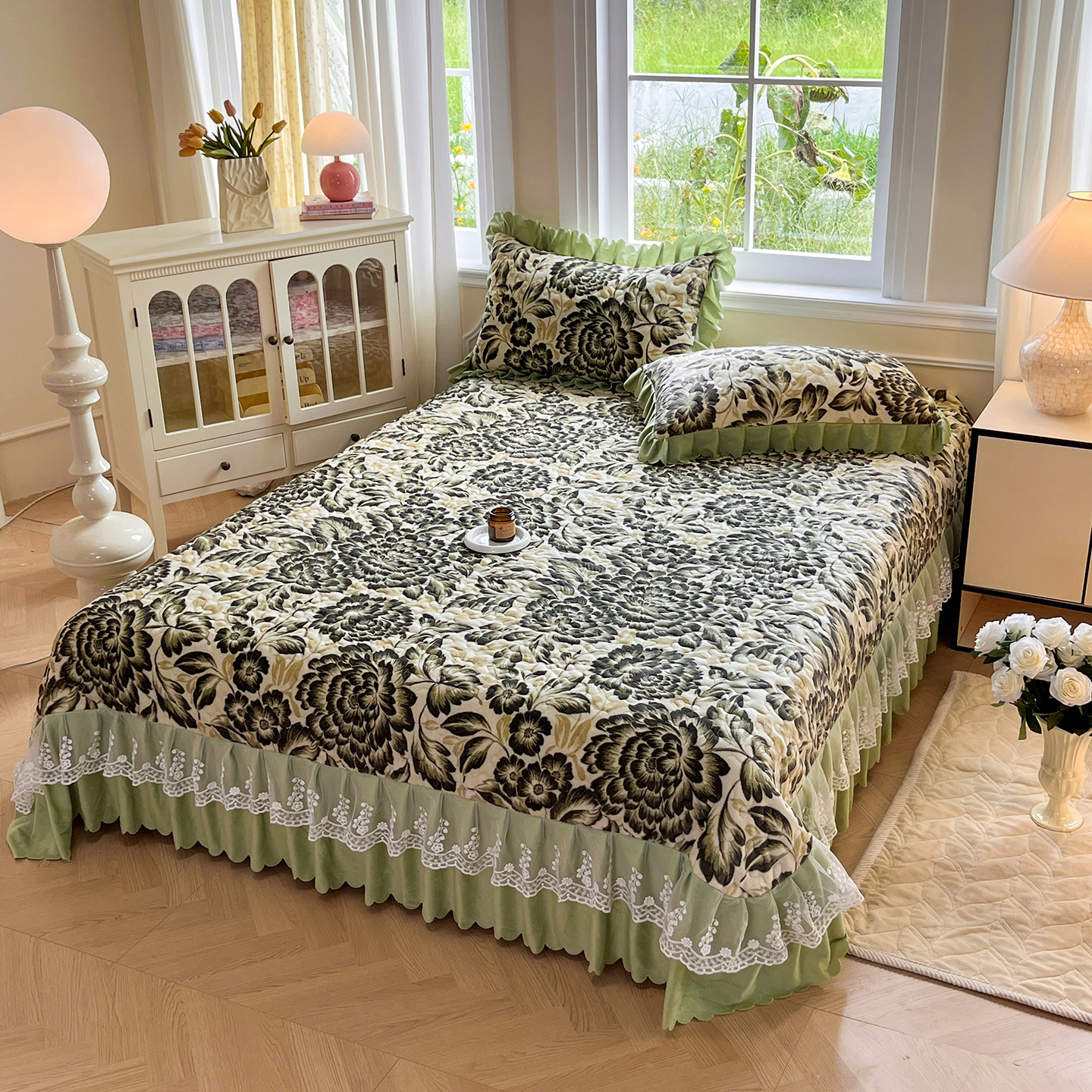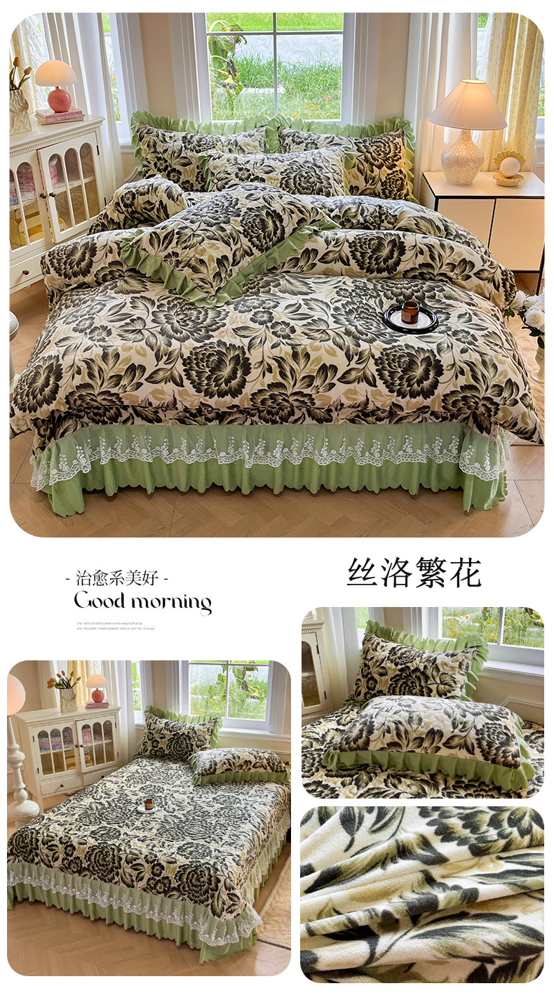 当前位置: 91家纺网 > 商品网购 > 床品套件 > 四件套 > 牛奶绒四件套 > 提花大世界 2025新款爆款高克重牛奶绒印花夹棉蕾丝花边床盖床三件四件套 丝洛繁花