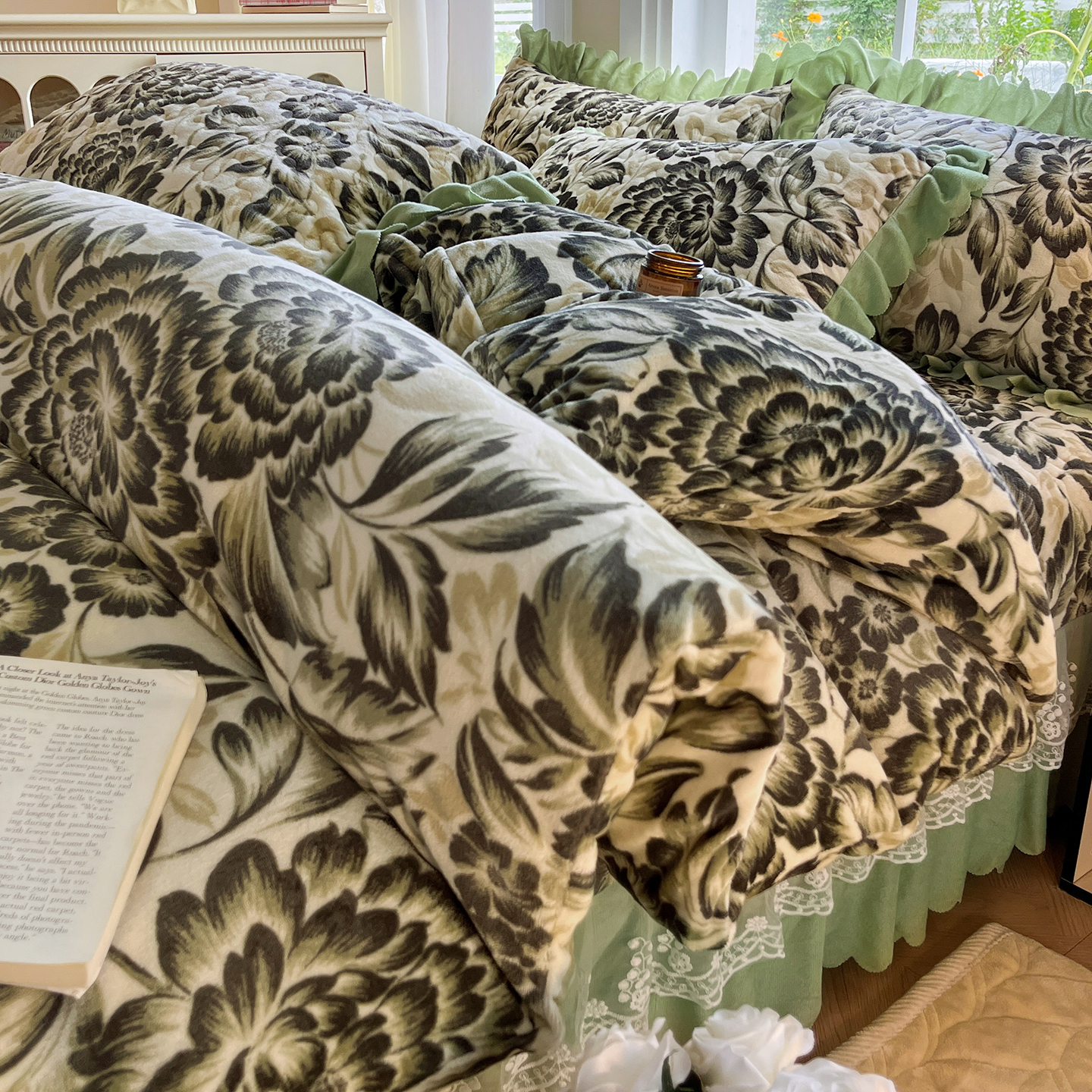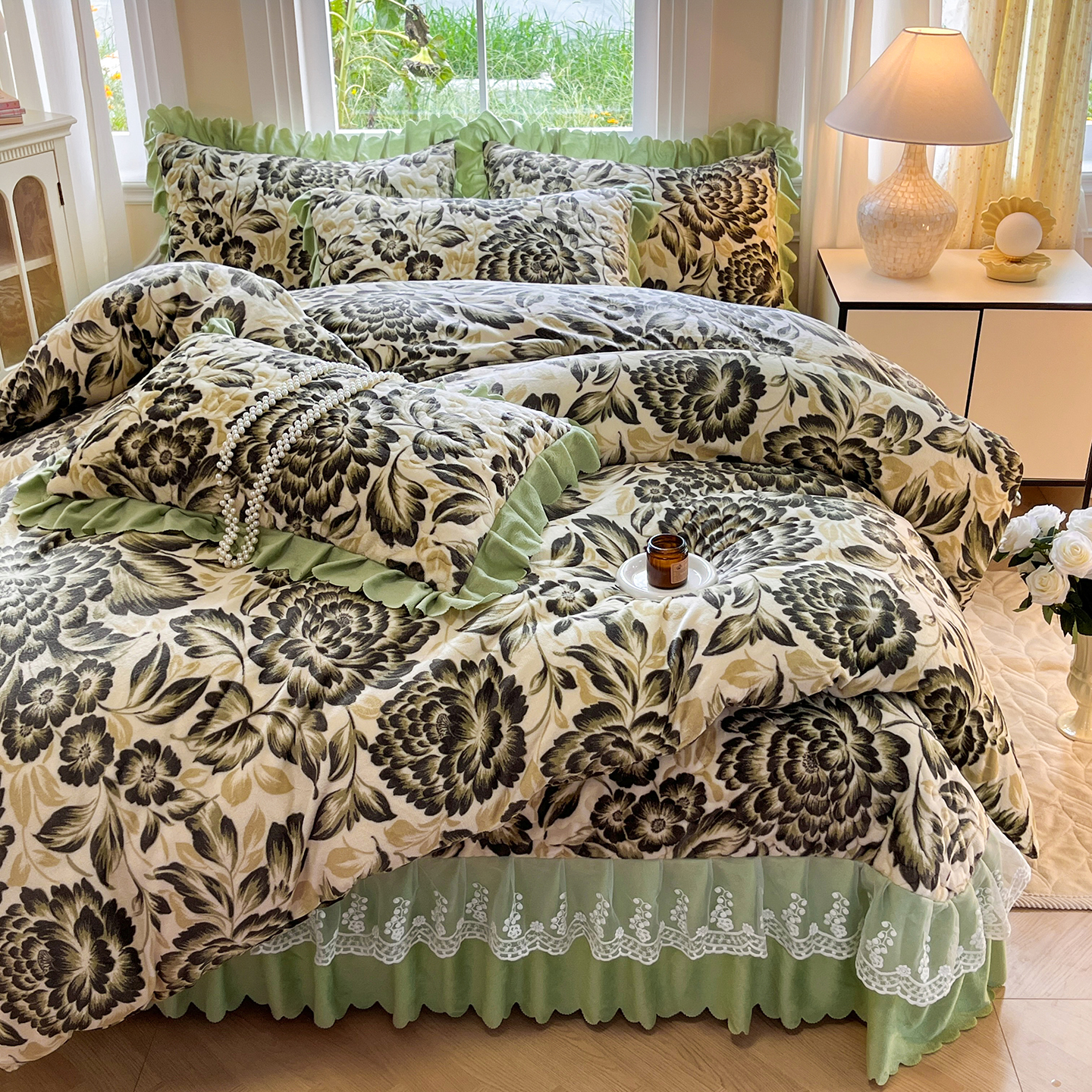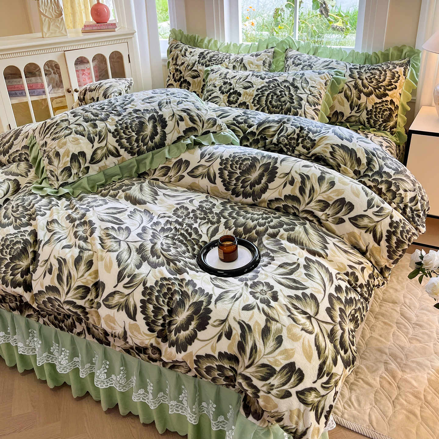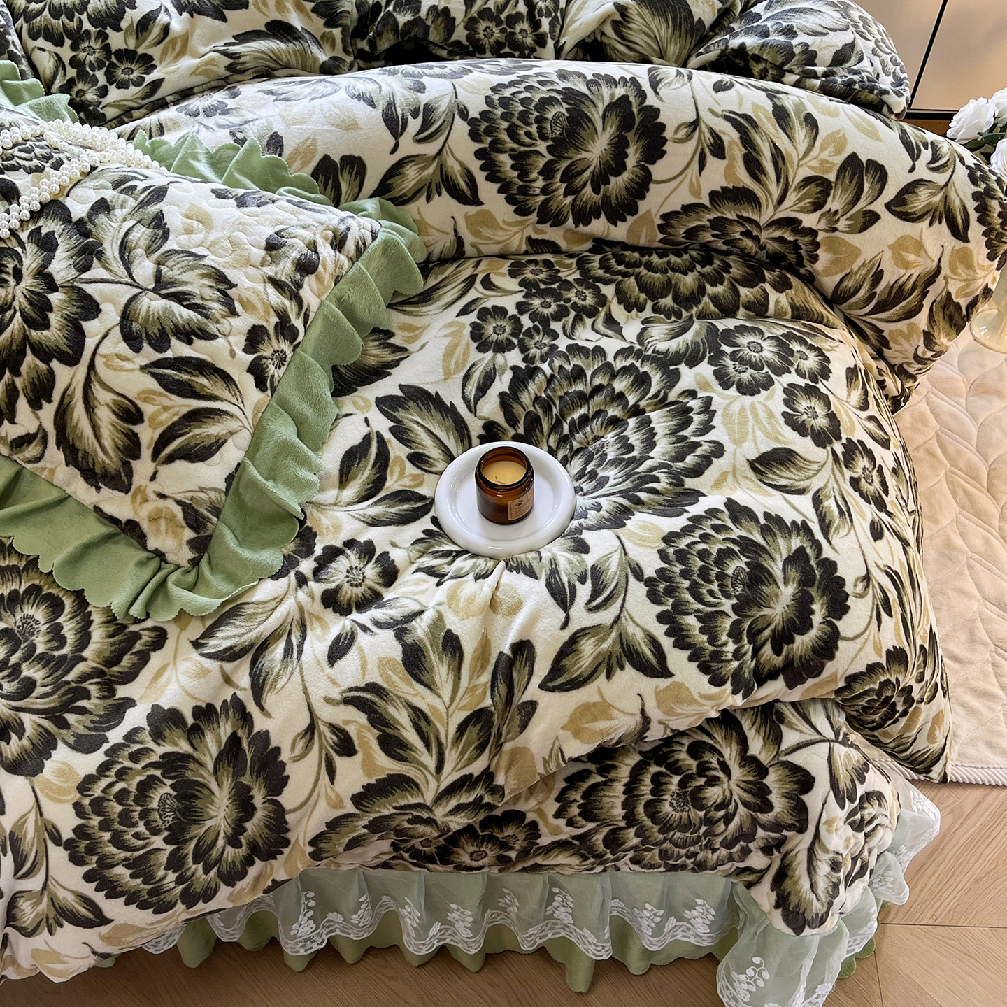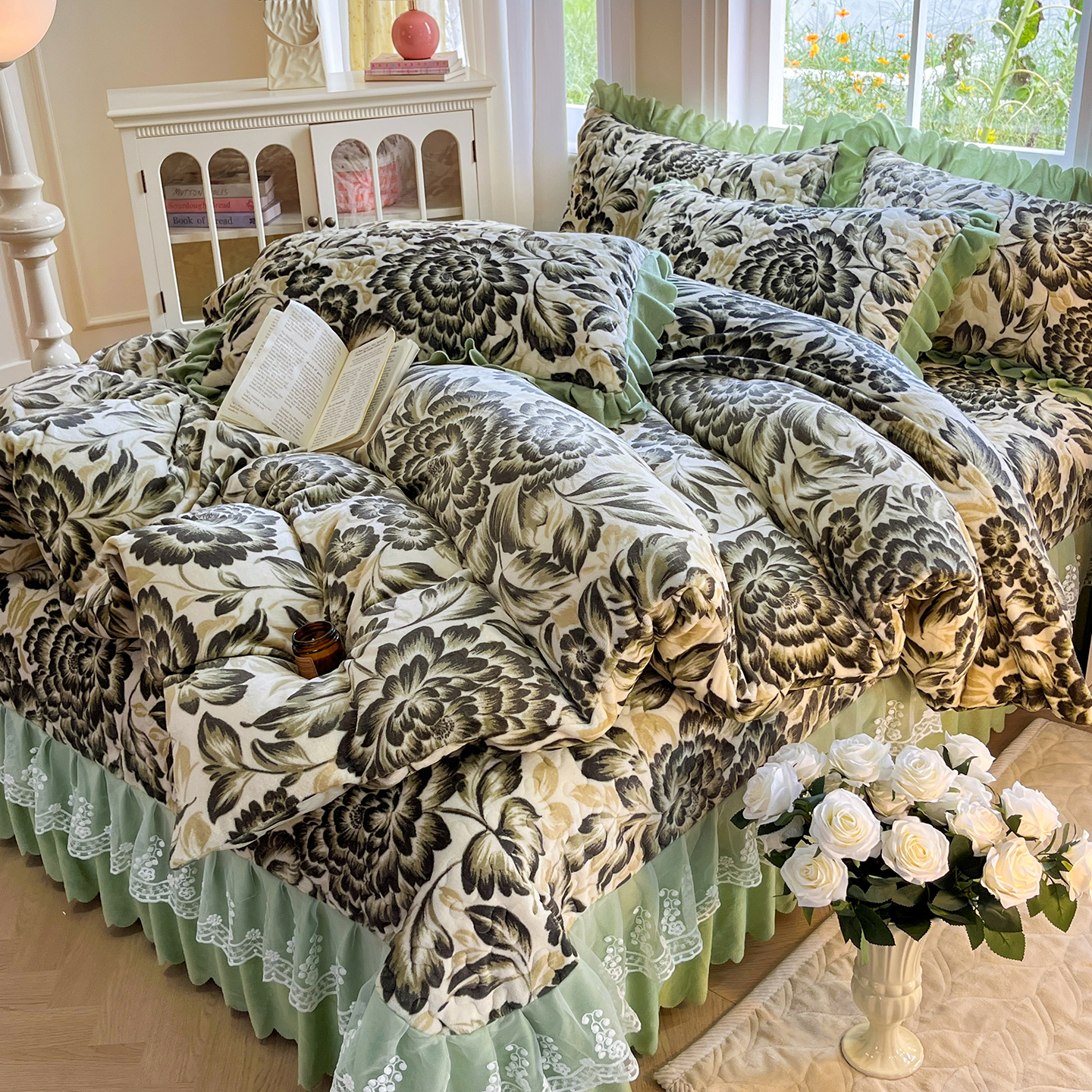 当前位置: 91家纺网 > 商品网购 > 床品套件 > 四件套 > 牛奶绒四件套 > 提花大世界 2025新款爆款高克重牛奶绒印花夹棉蕾丝花边床盖床三件四件套 丝洛繁花