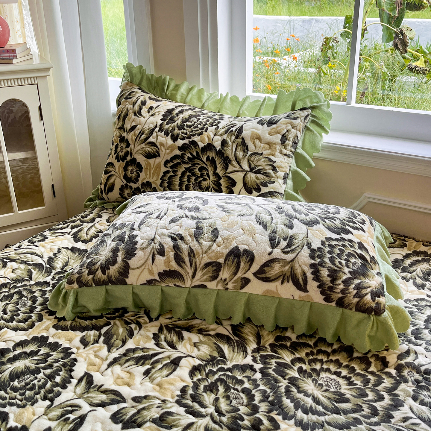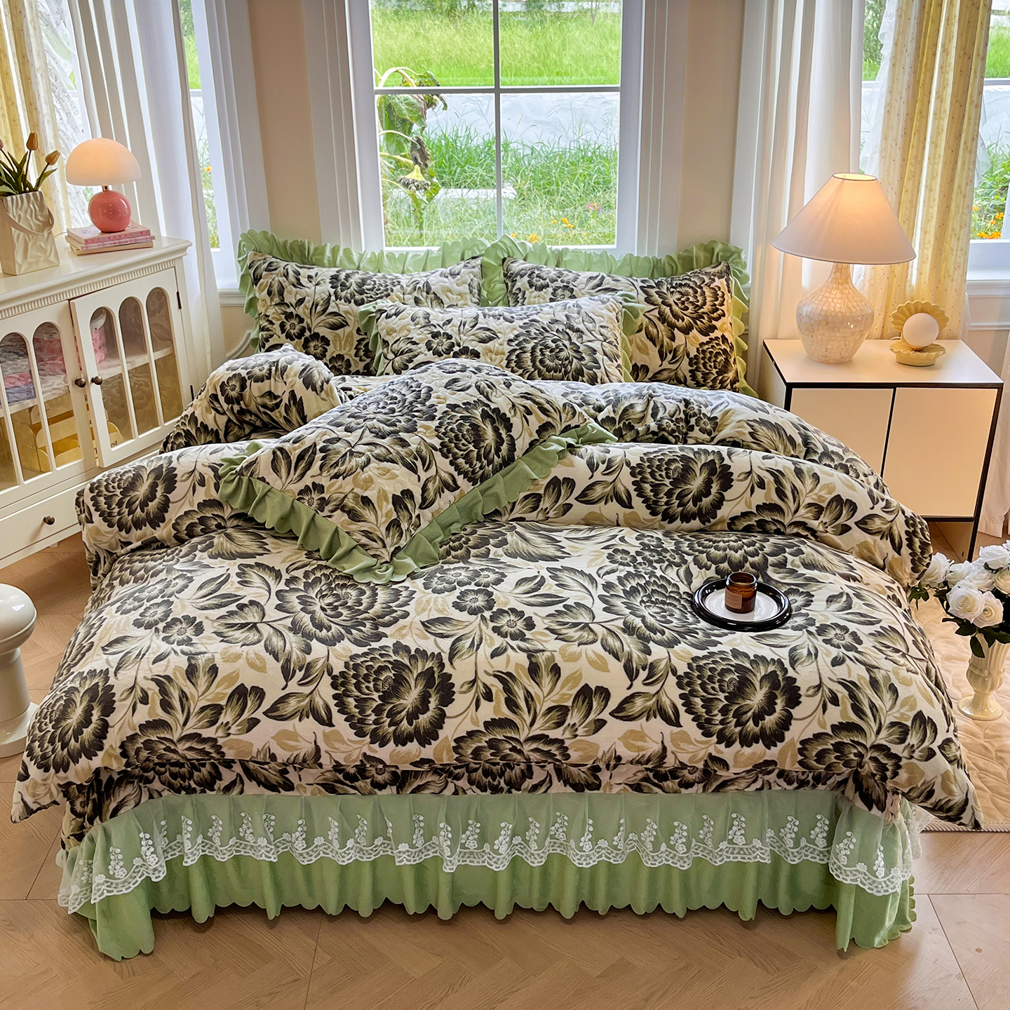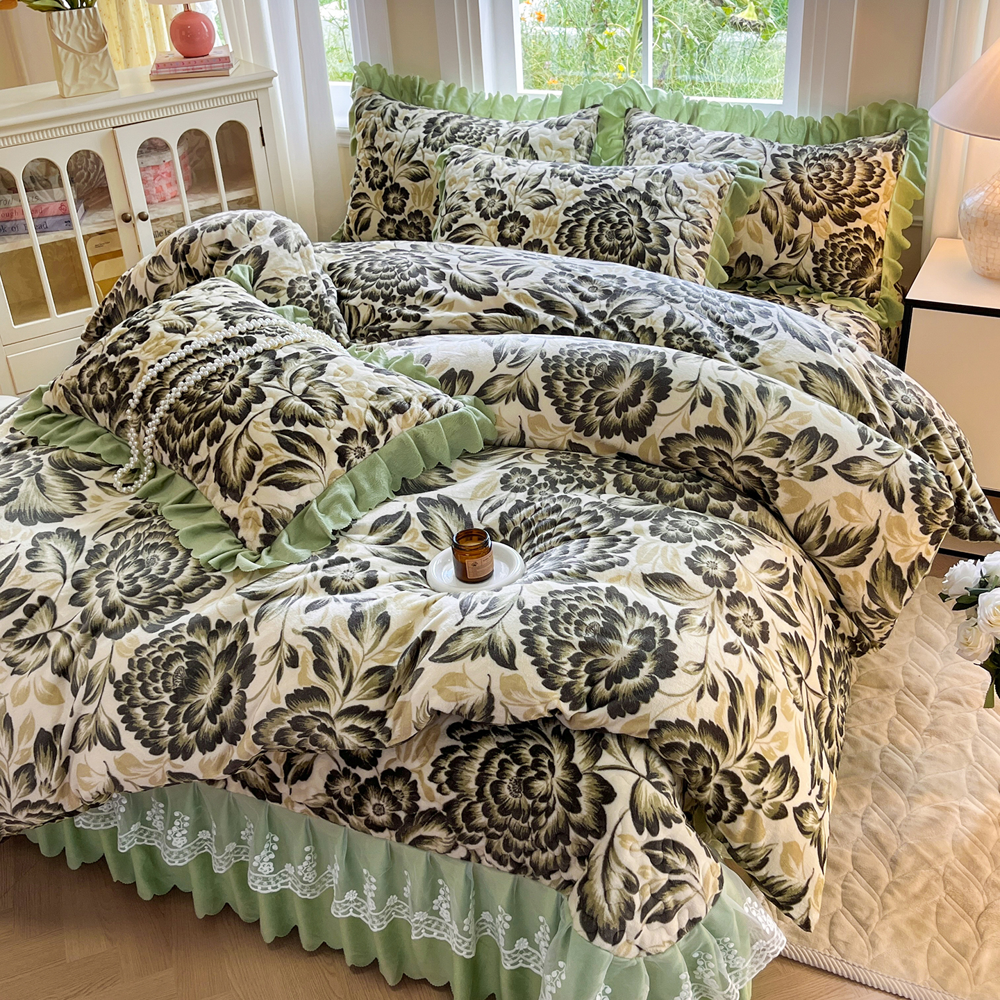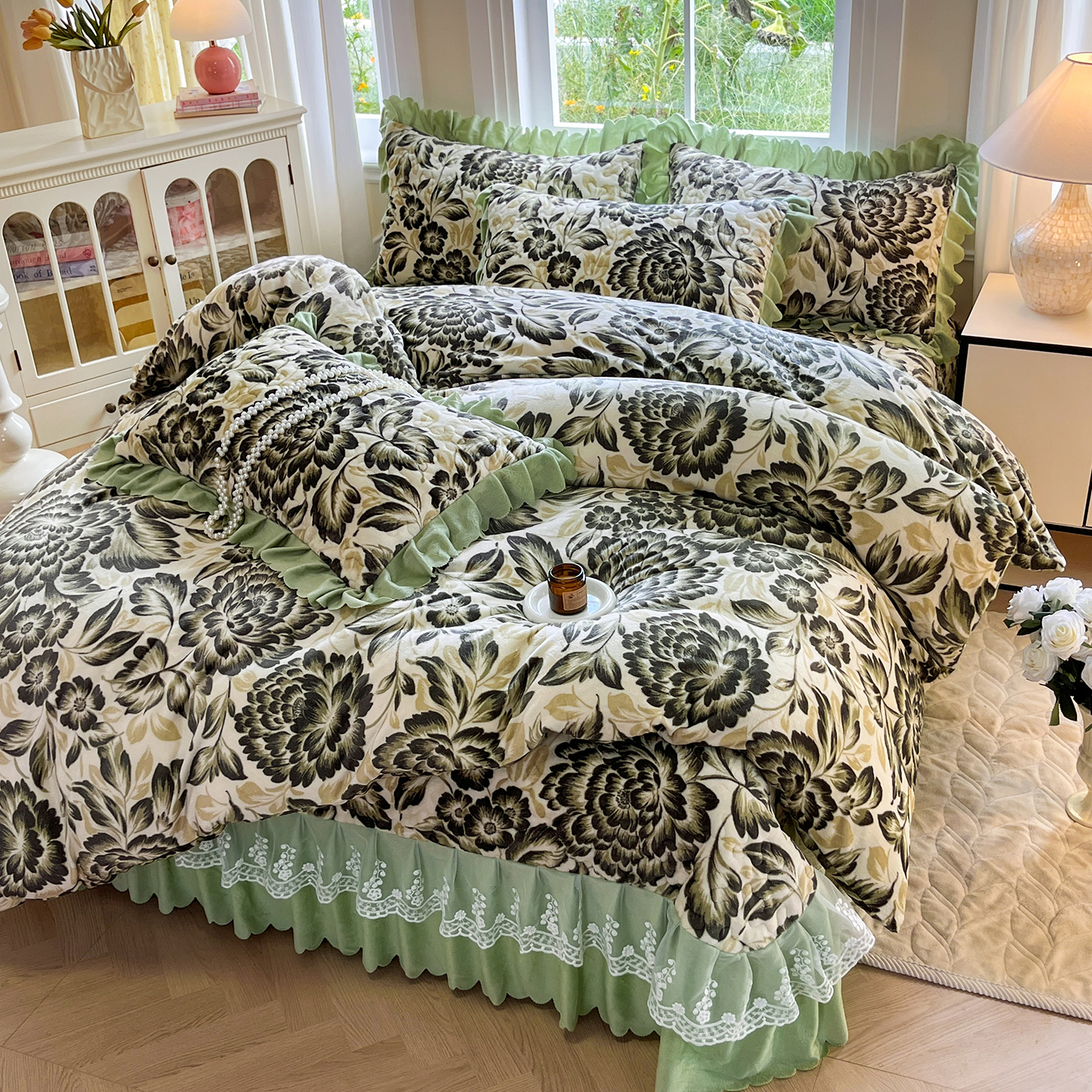 当前位置: 91家纺网 > 商品网购 > 床品套件 > 四件套 > 牛奶绒四件套 > 提花大世界 2025新款爆款高克重牛奶绒印花夹棉蕾丝花边床盖床三件四件套 丝洛繁花