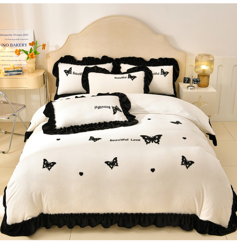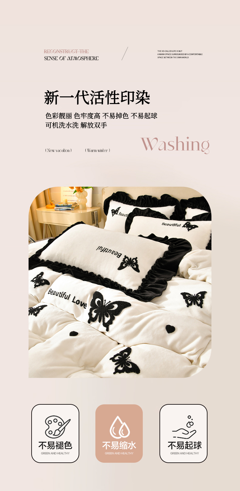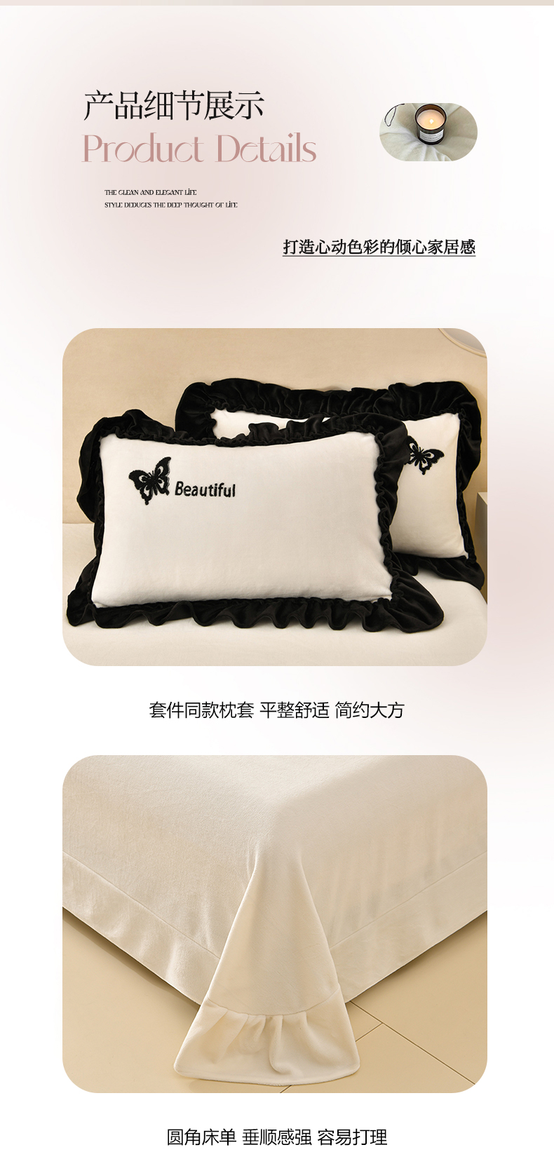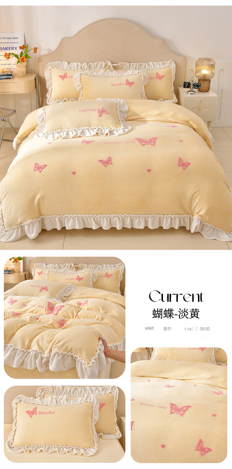 商品名称:畅畅家纺 2025新款加厚9斤毛巾绣韩式花边牛奶绒床单四件套 蝴蝶-米白
