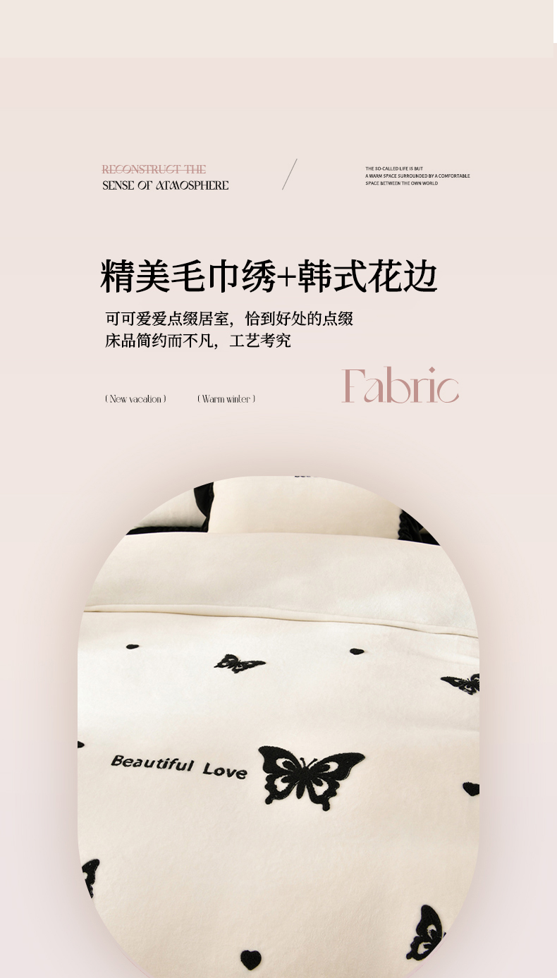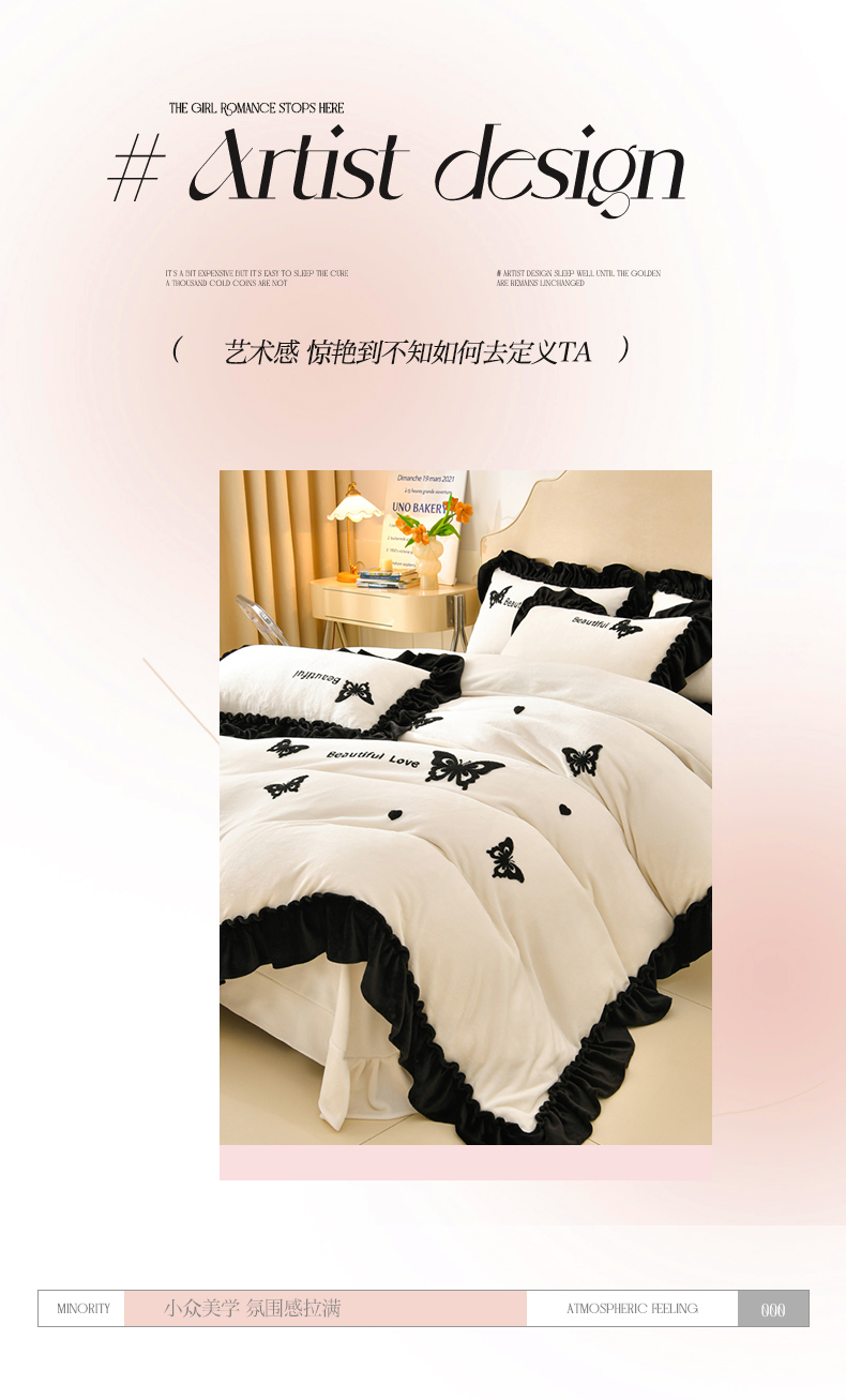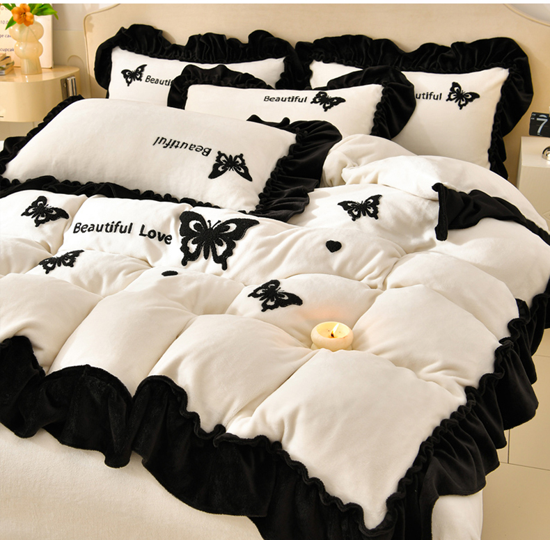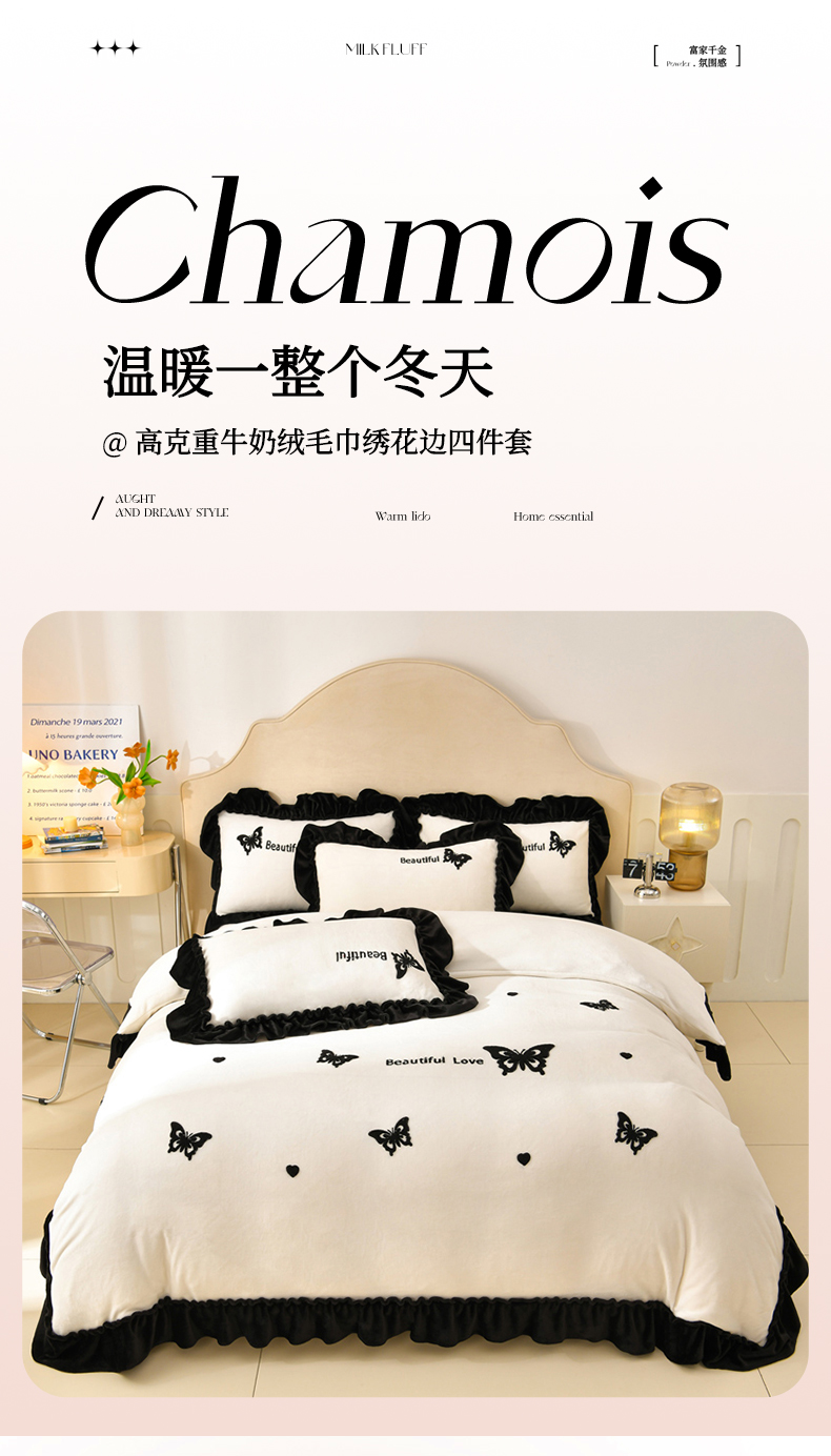 商品名称:畅畅家纺 2025新款加厚9斤毛巾绣韩式花边牛奶绒床单四件套 蝴蝶-米白