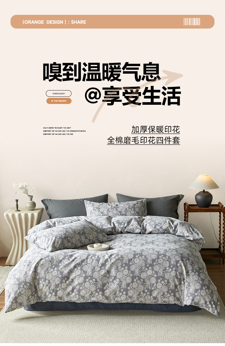 当前位置: 91家纺网 > 商品网购 > 床品套件 > 四件套 > 普通磨毛四件套 > 怡家居 2025新款全棉纯棉加厚印花磨毛四件套 苔痕