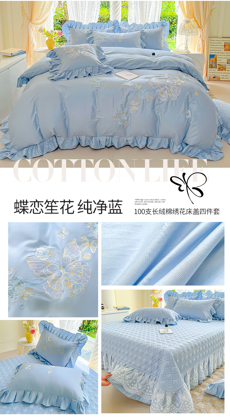 宜凡家纺 2025新款长绒棉绣花夹棉床盖四件套--蝶恋笙花系列 蝶恋笙花 香妃粉