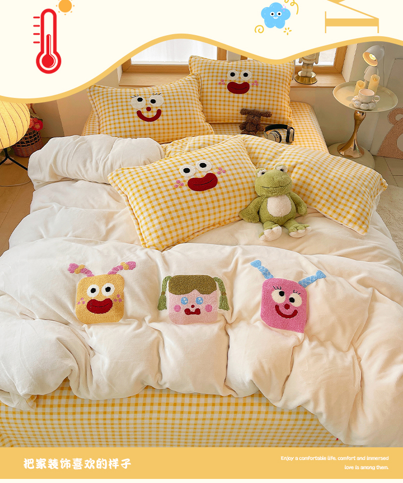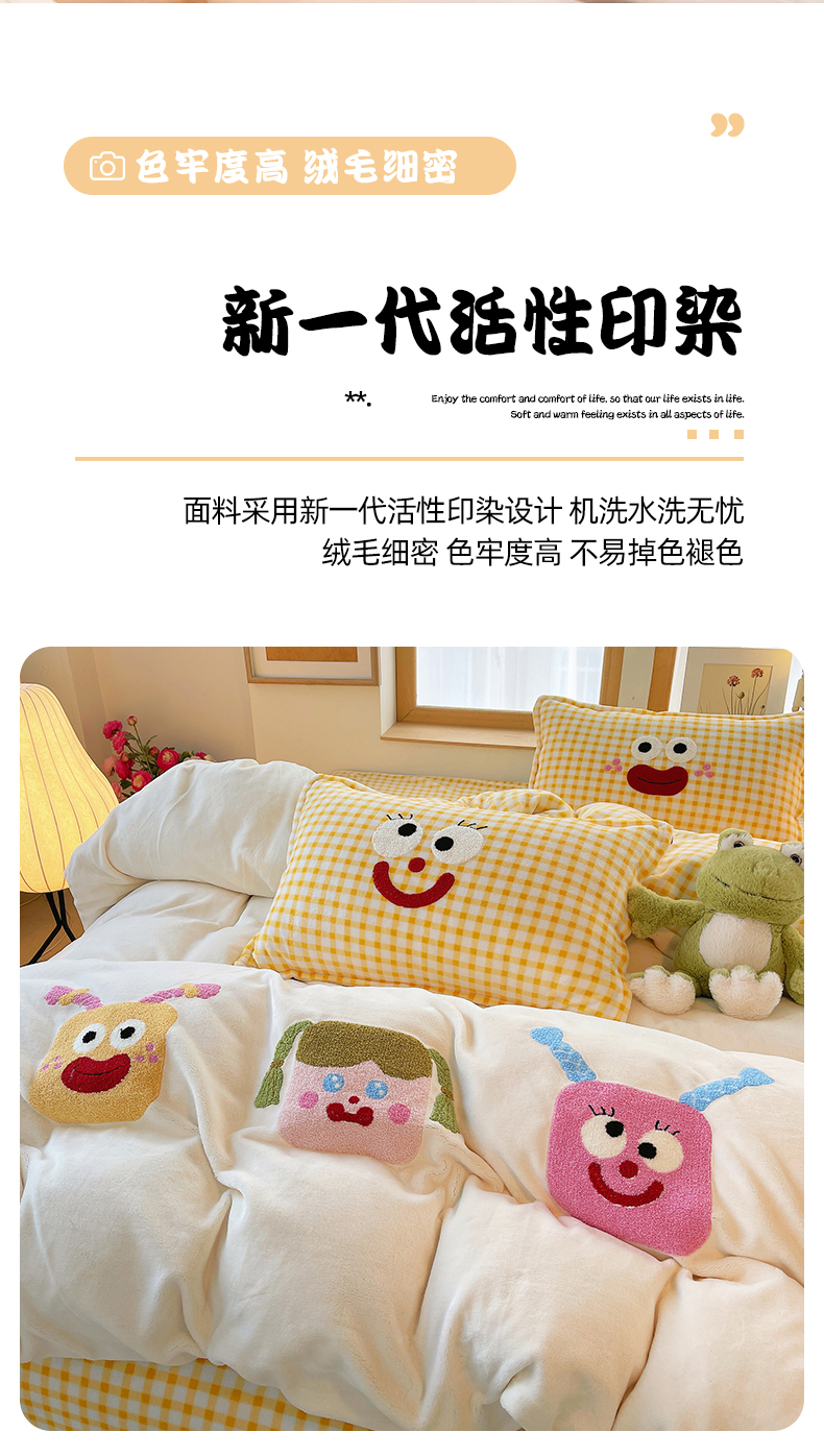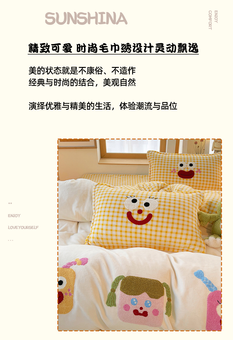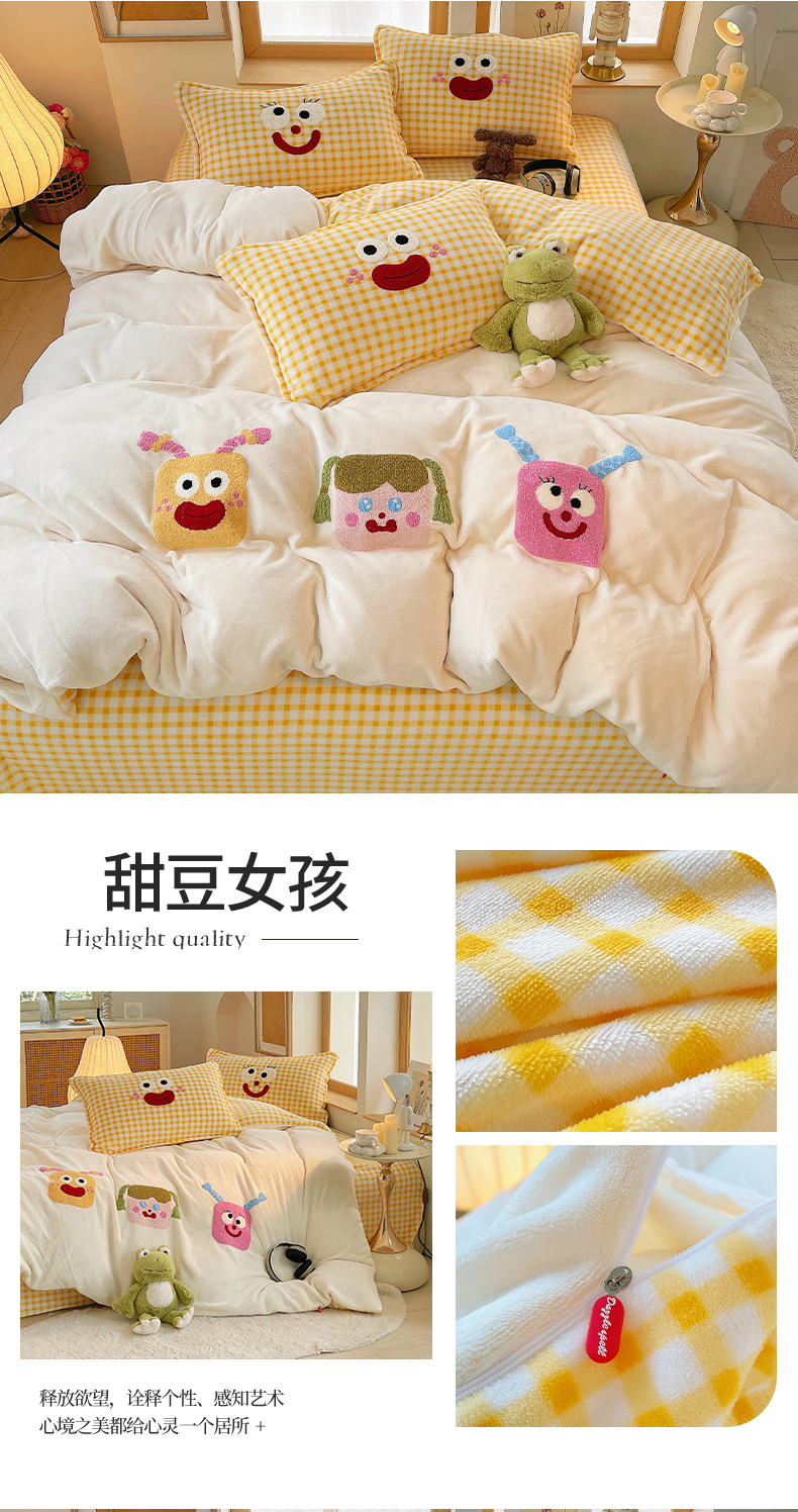 炫拼家纺 2025新款高克重牛奶绒格子卡通毛巾绣加厚四件套-糖宝系列 糖宝-甜豆女孩