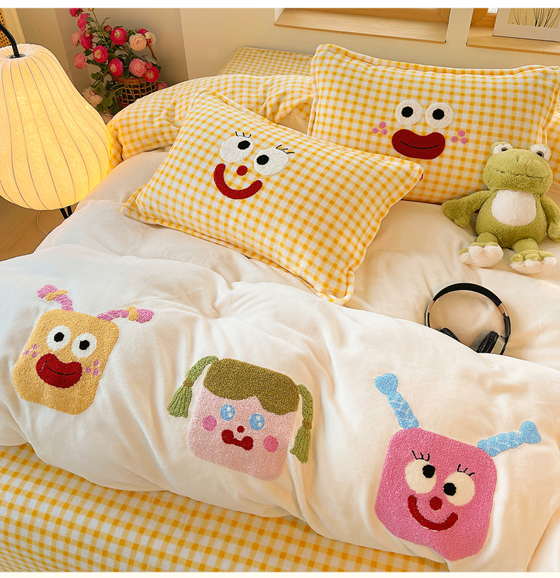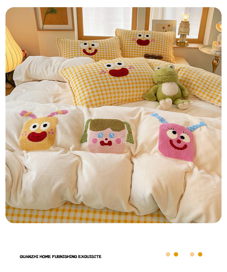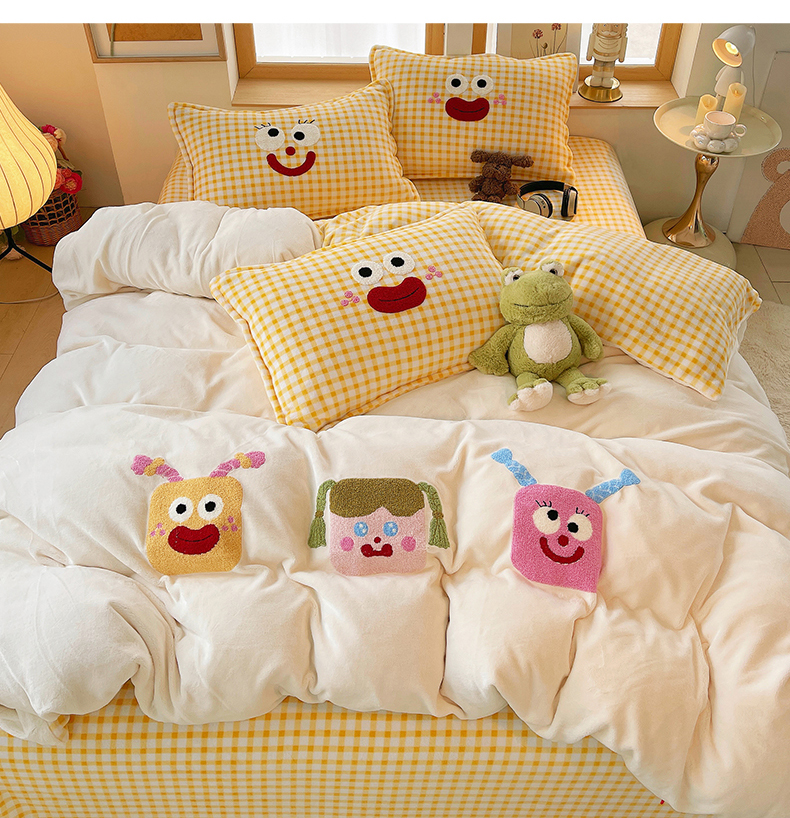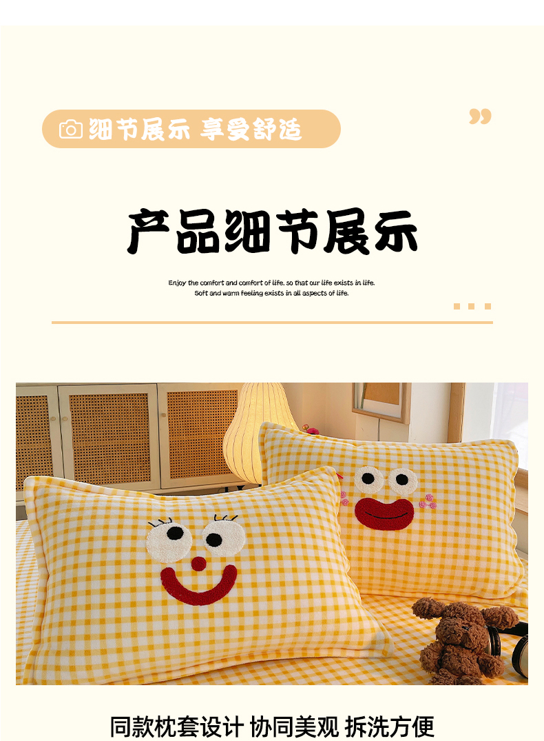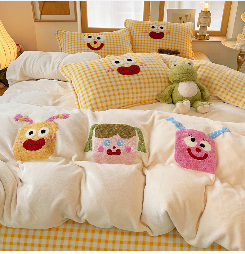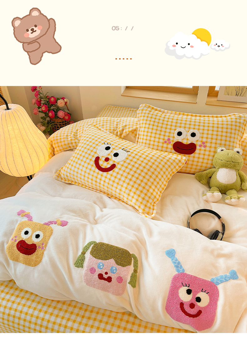 炫拼家纺 2025新款高克重牛奶绒格子卡通毛巾绣加厚四件套-糖宝系列 糖宝-甜豆女孩
