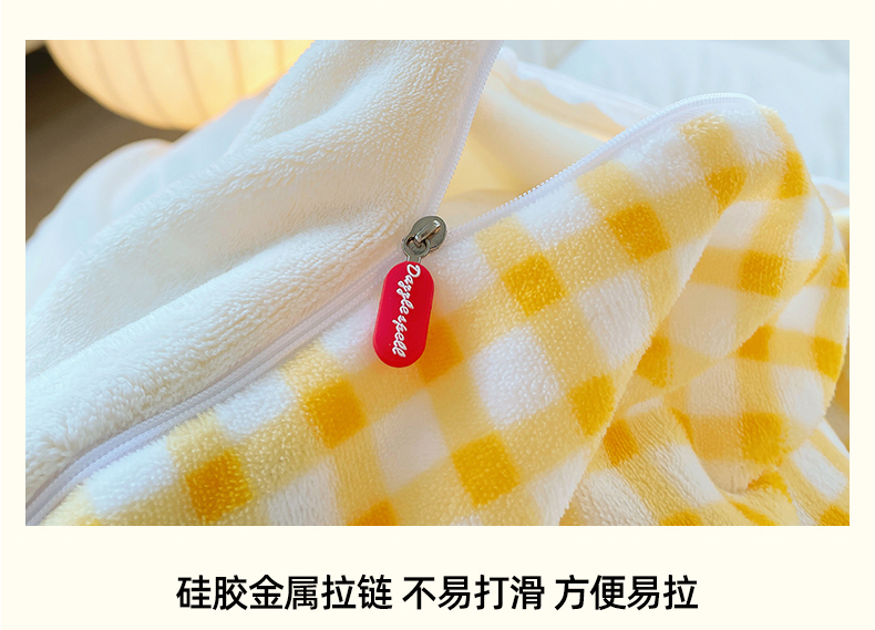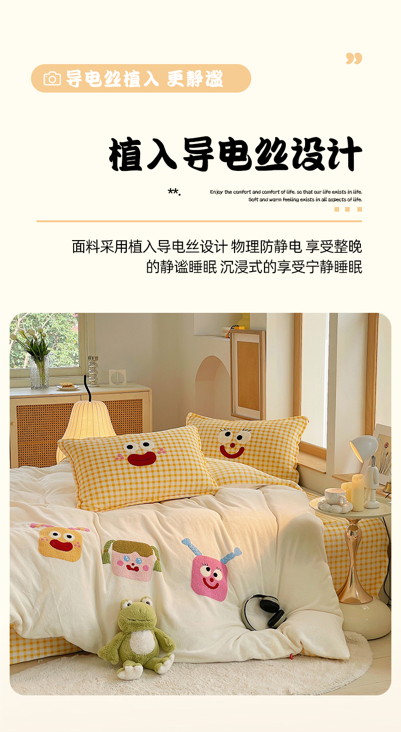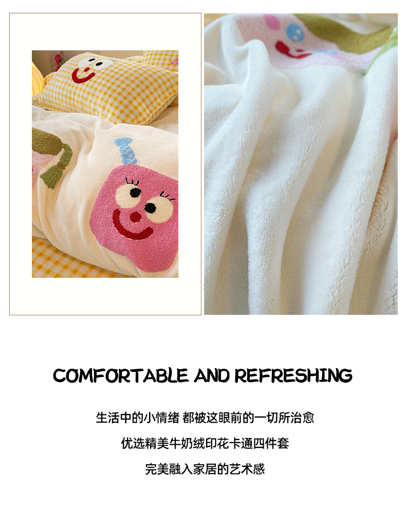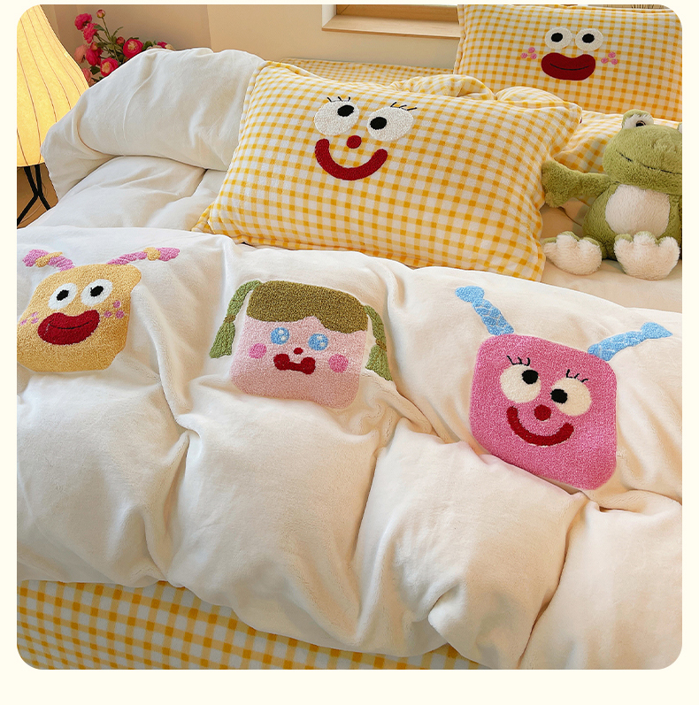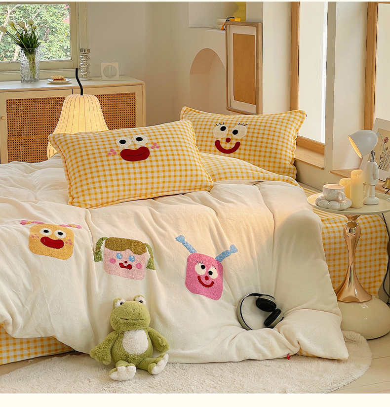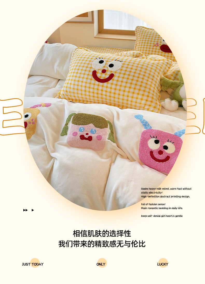 炫拼家纺 2025新款高克重牛奶绒格子卡通毛巾绣加厚四件套-糖宝系列 糖宝-甜豆女孩