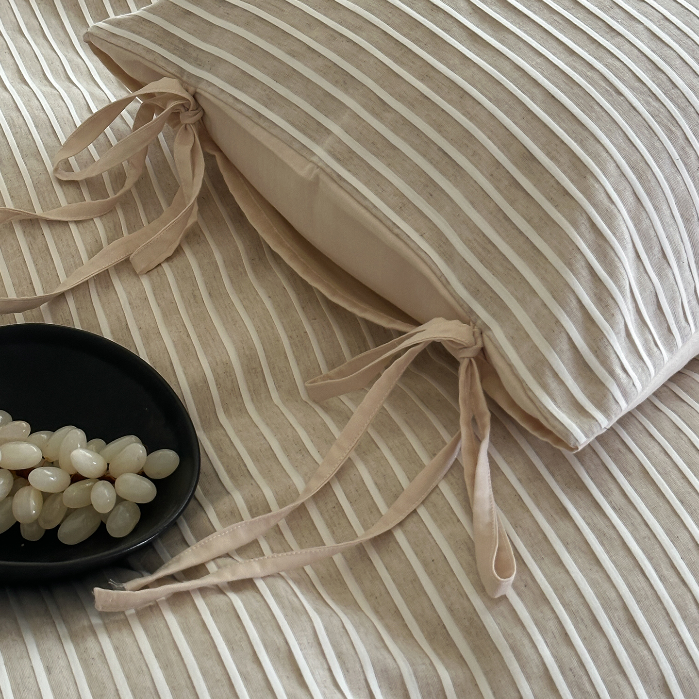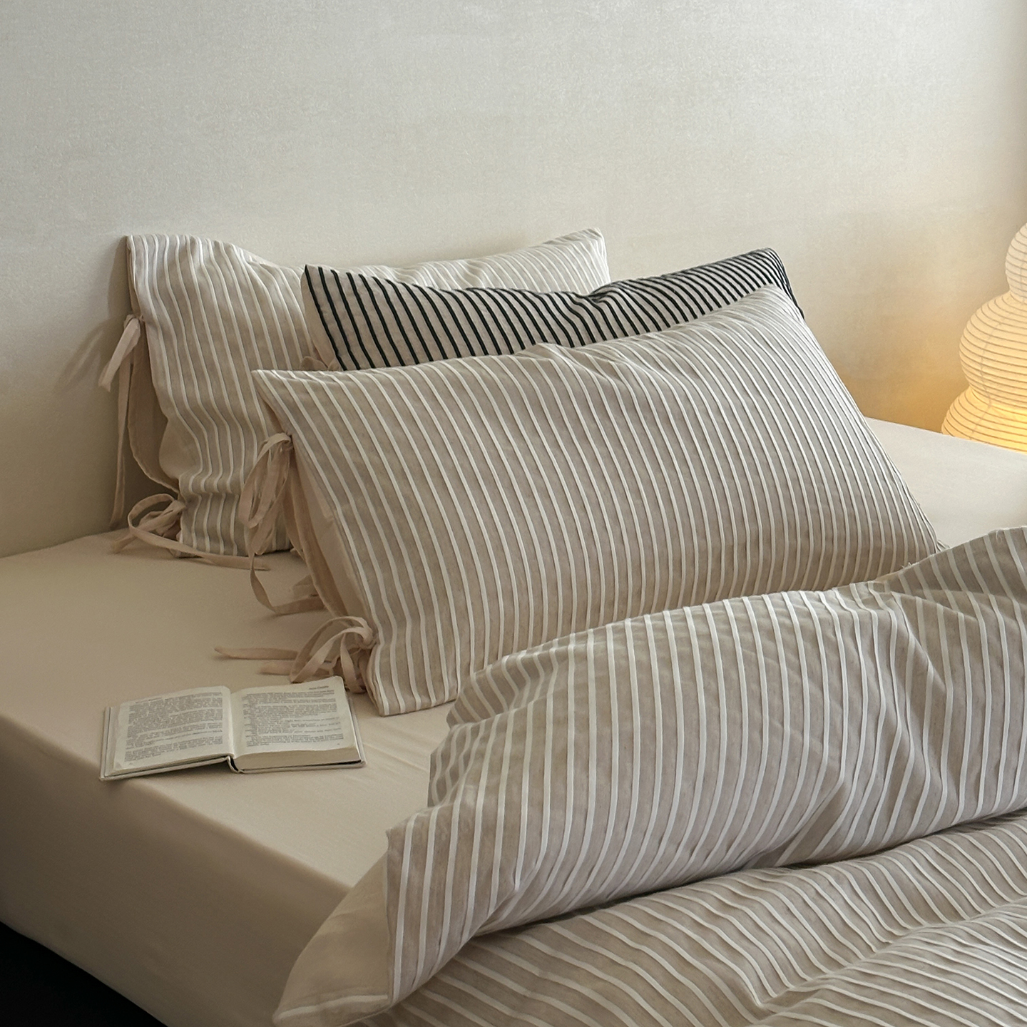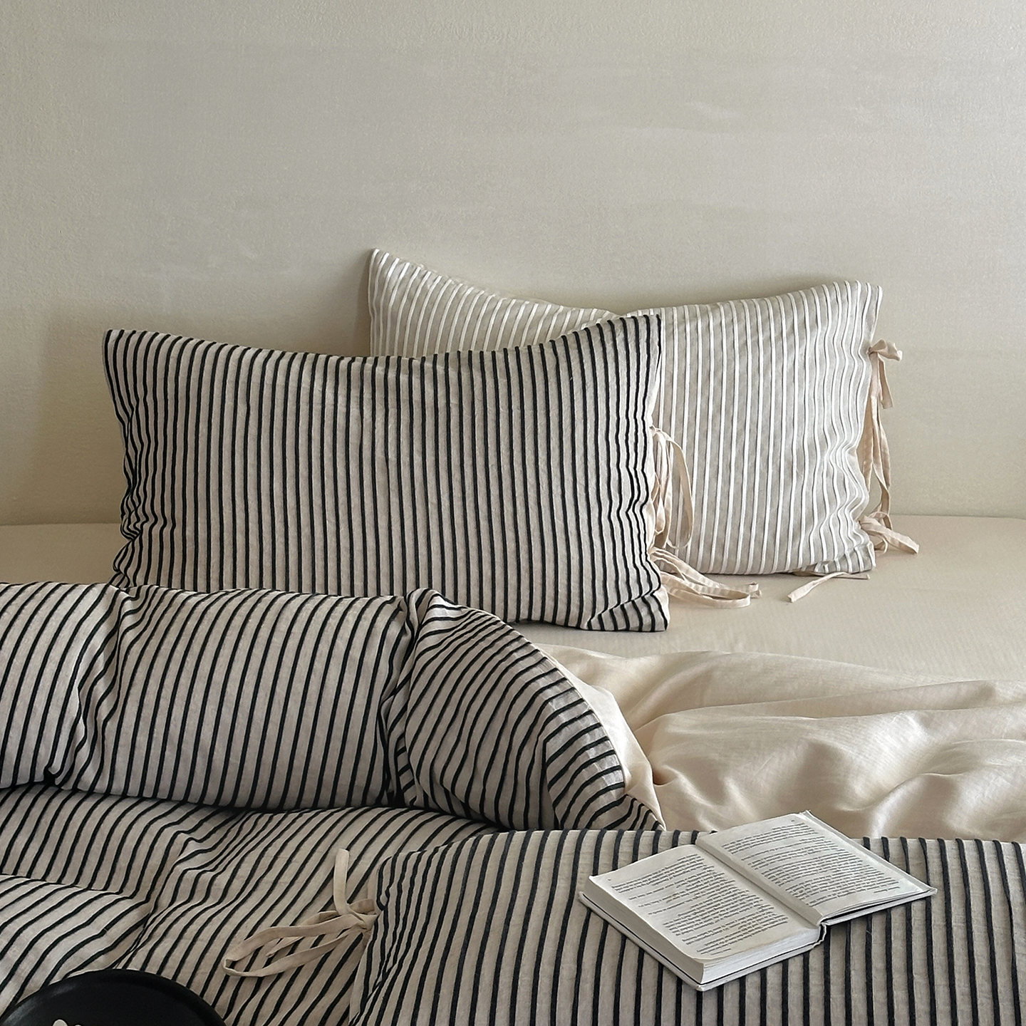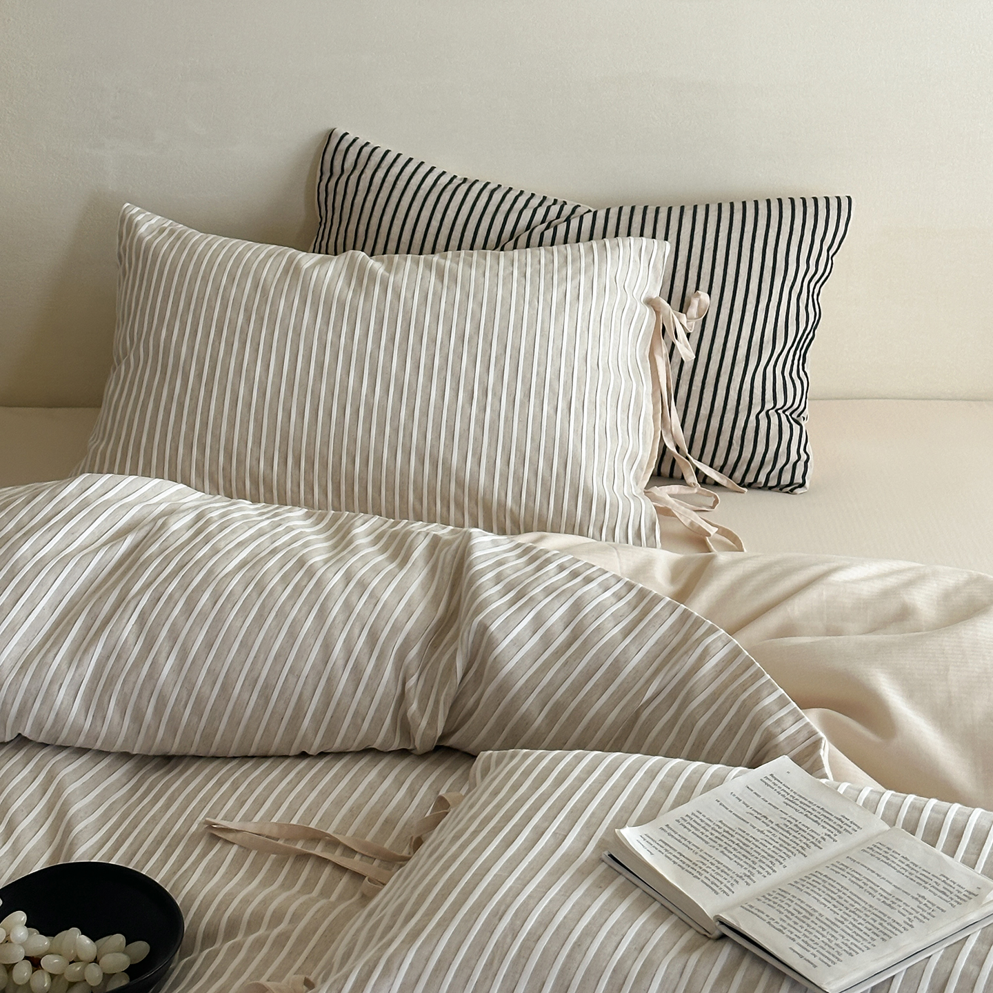 (总)小春日和 2025新款纯棉棉麻民宿中性风四件套高端全棉人字纹条纹被套加大纯色床单1.8床笠男士四件套,木笙-黑,木笙-米