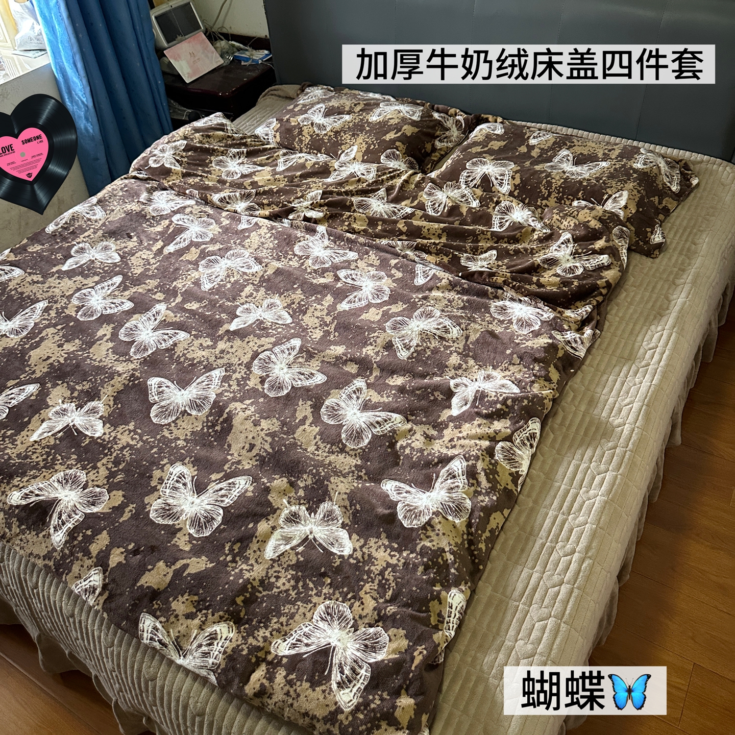 恋尚羽家纺 2025新款印花牛奶绒大床裙床盖四件套 蝴蝶