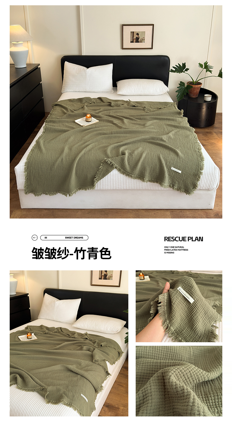 商品名称:小叮当家纺仓储工厂店 2025新款全棉纯棉四层纱皱皱流苏毯毛毯毯子 皱皱纱-橄榄绿