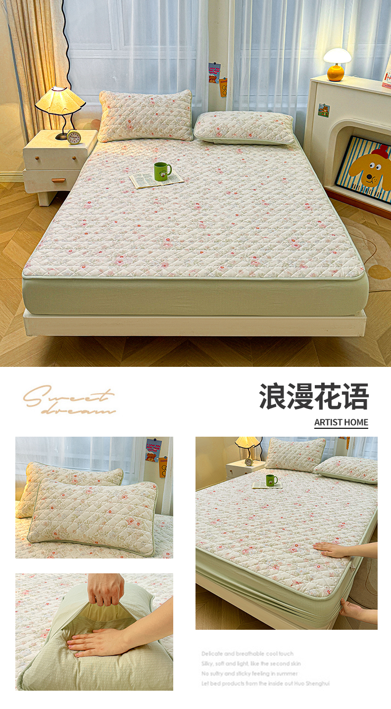 雯豆家纺 2025新款复古风皱皱棉印花夹棉床笠三件套加厚床垫保护套 蘑菇仙子